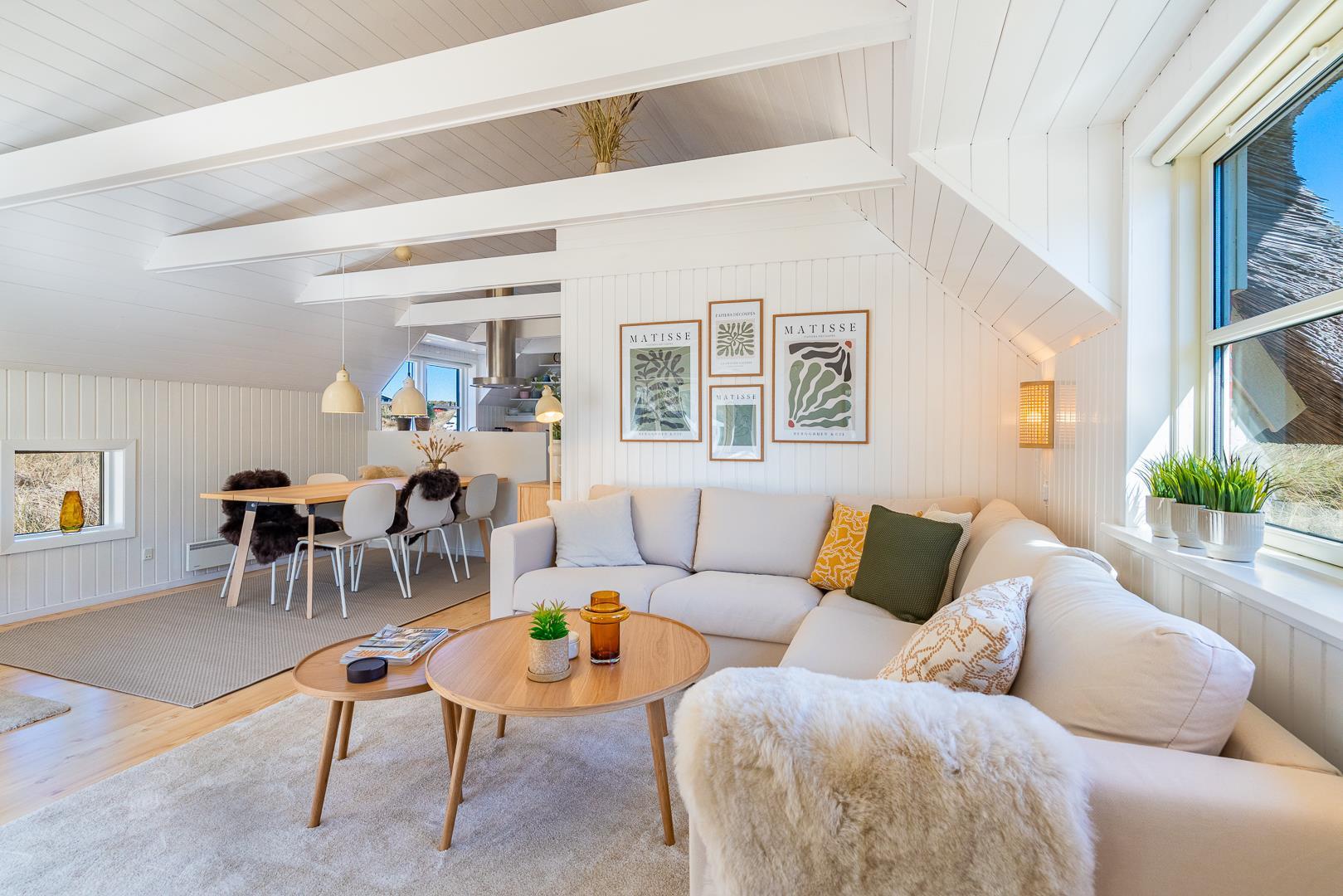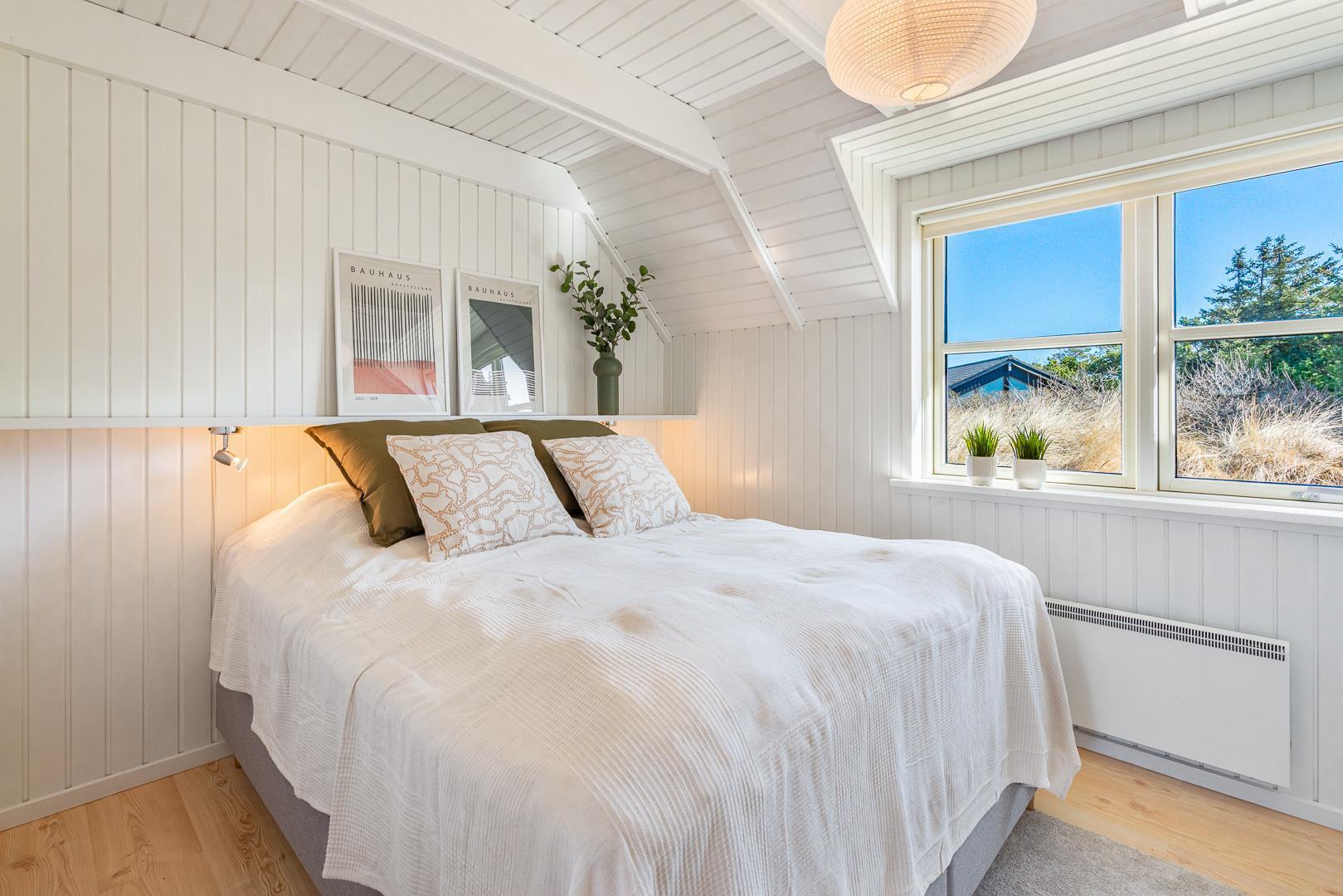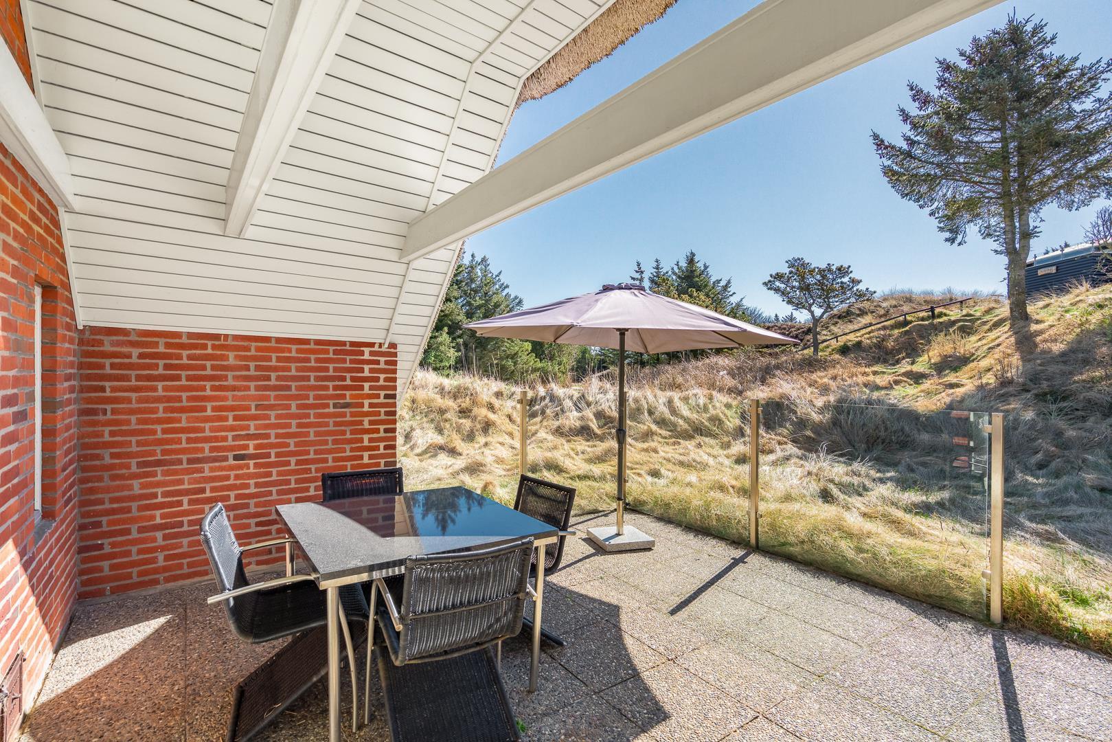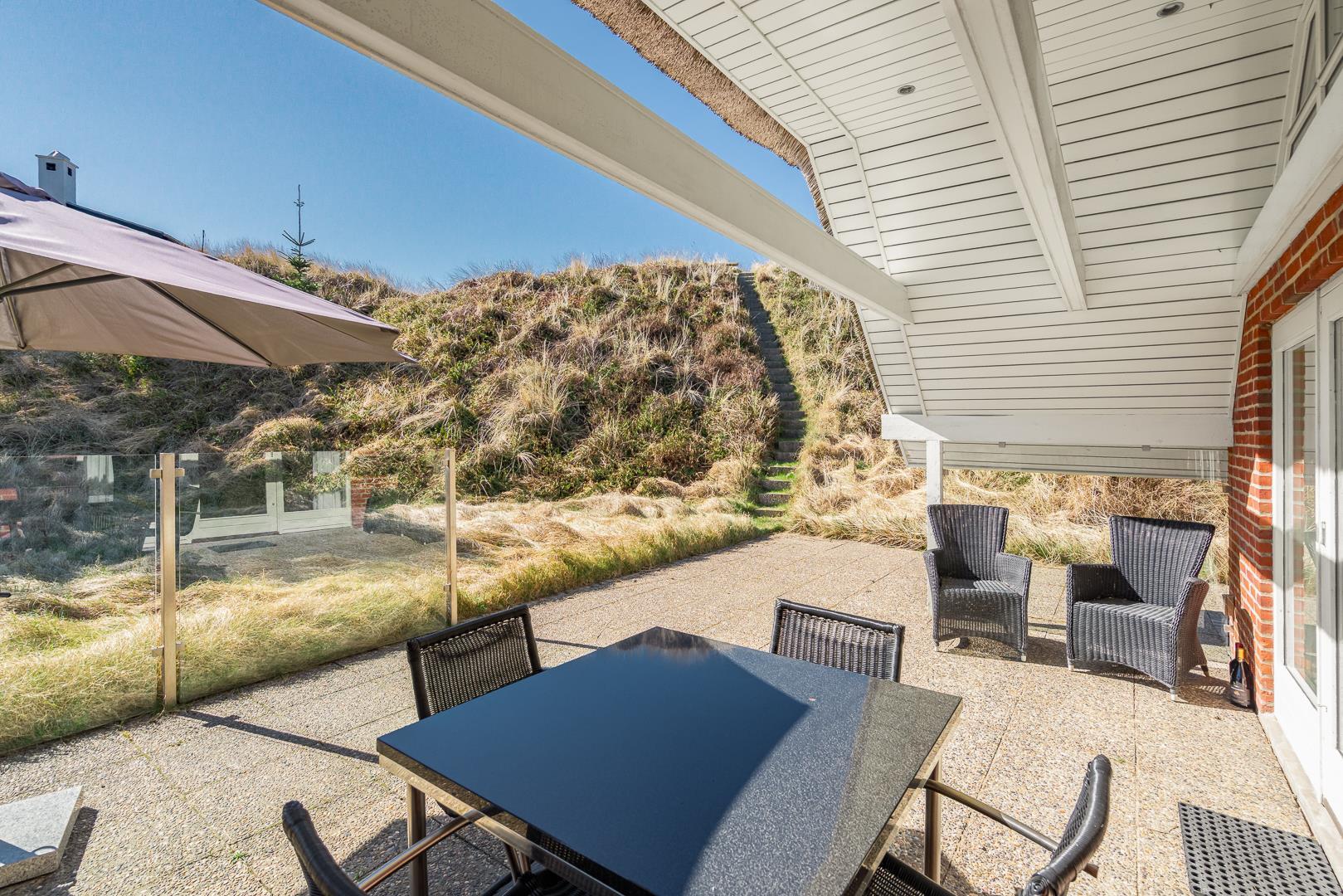 På en kuperet klitgrund ligger dette charmerende kvalitetsferiehus med stråtag. Huset er smagsfuldt, lyst og venligt indrettet. Der er trægulve i hele huset. Indvendigt står huset flot køkken og badeværelse og moderne møbler. Her er et hus der har sjæl og moderniseret med nænsom hånd. Der hems og flere dejlige terrasse, hvoraf en er delvis overdækket. Der er depot med bla. stort køle /fryseskab. Sengestørrelser: dobbeltseng 180x200 cm. (2 madrasser), dobbeltseng 180x200 cm. (2 madrasser), dobbeltseng (Hems) 140x200 cm. (1 madras)