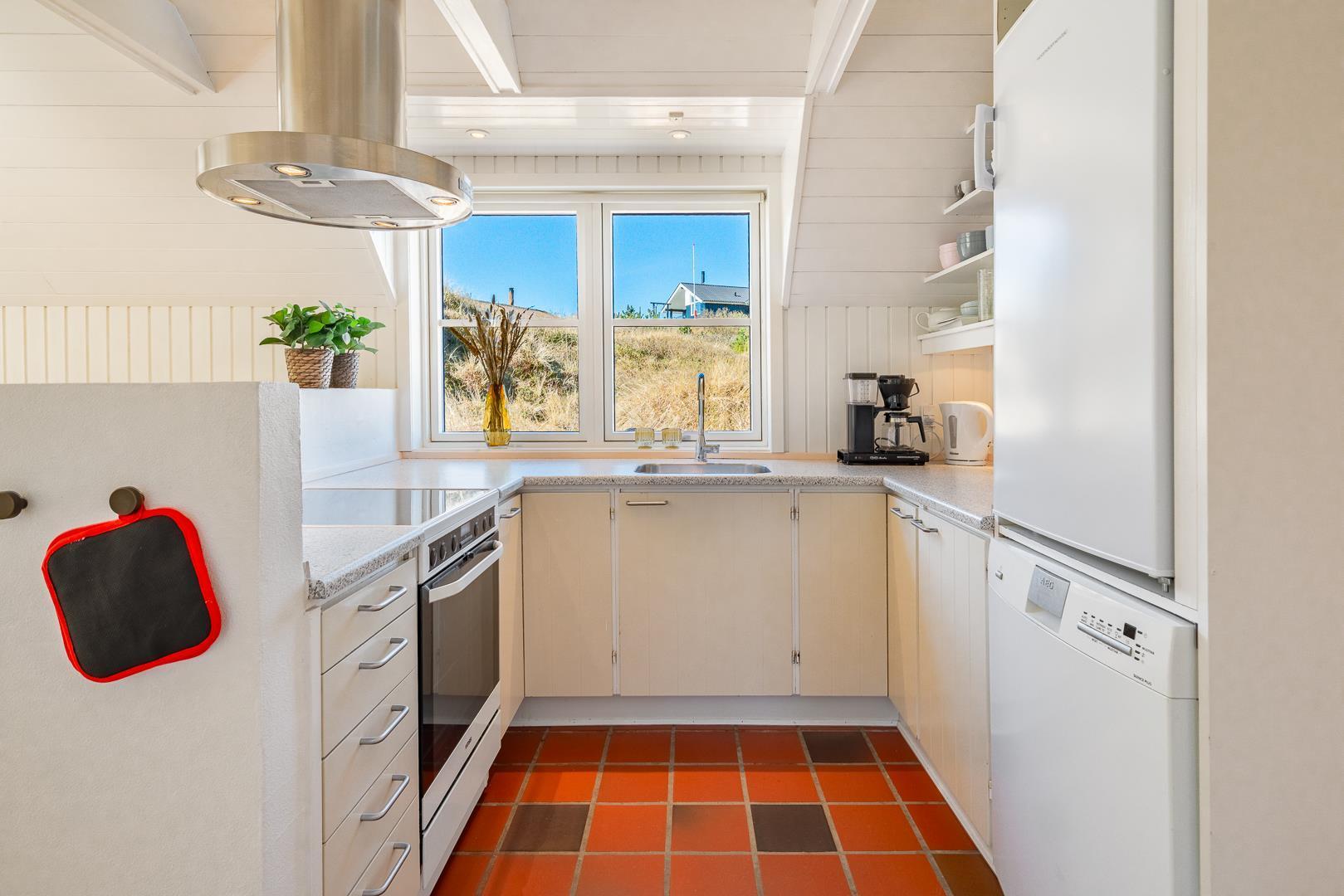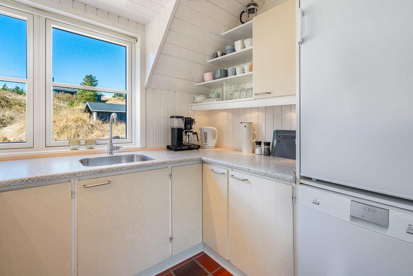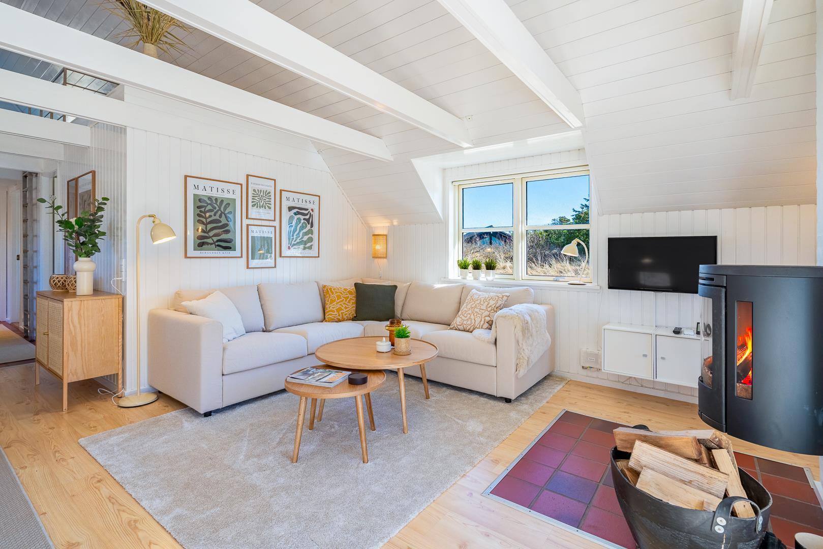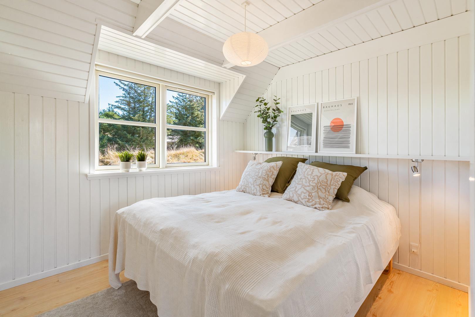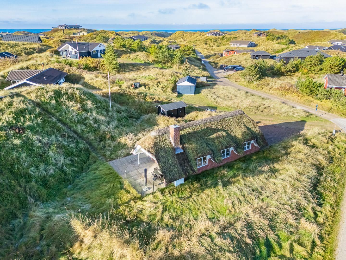 På en kuperet klitgrund ligger dette charmerende kvalitetsferiehus med stråtag. Huset er smagsfuldt, lyst og venligt indrettet. Der er trægulve i hele huset. Indvendigt står huset flot køkken og badeværelse og moderne møbler. Her er et hus der har sjæl og moderniseret med nænsom hånd. Der hems og flere dejlige terrasse, hvoraf en er delvis overdækket. Der er depot med bla. stort køle /fryseskab. Sengestørrelser: dobbeltseng 180x200 cm. (2 madrasser), dobbeltseng 180x200 cm. (2 madrasser), dobbeltseng (Hems) 140x200 cm. (1 madras)