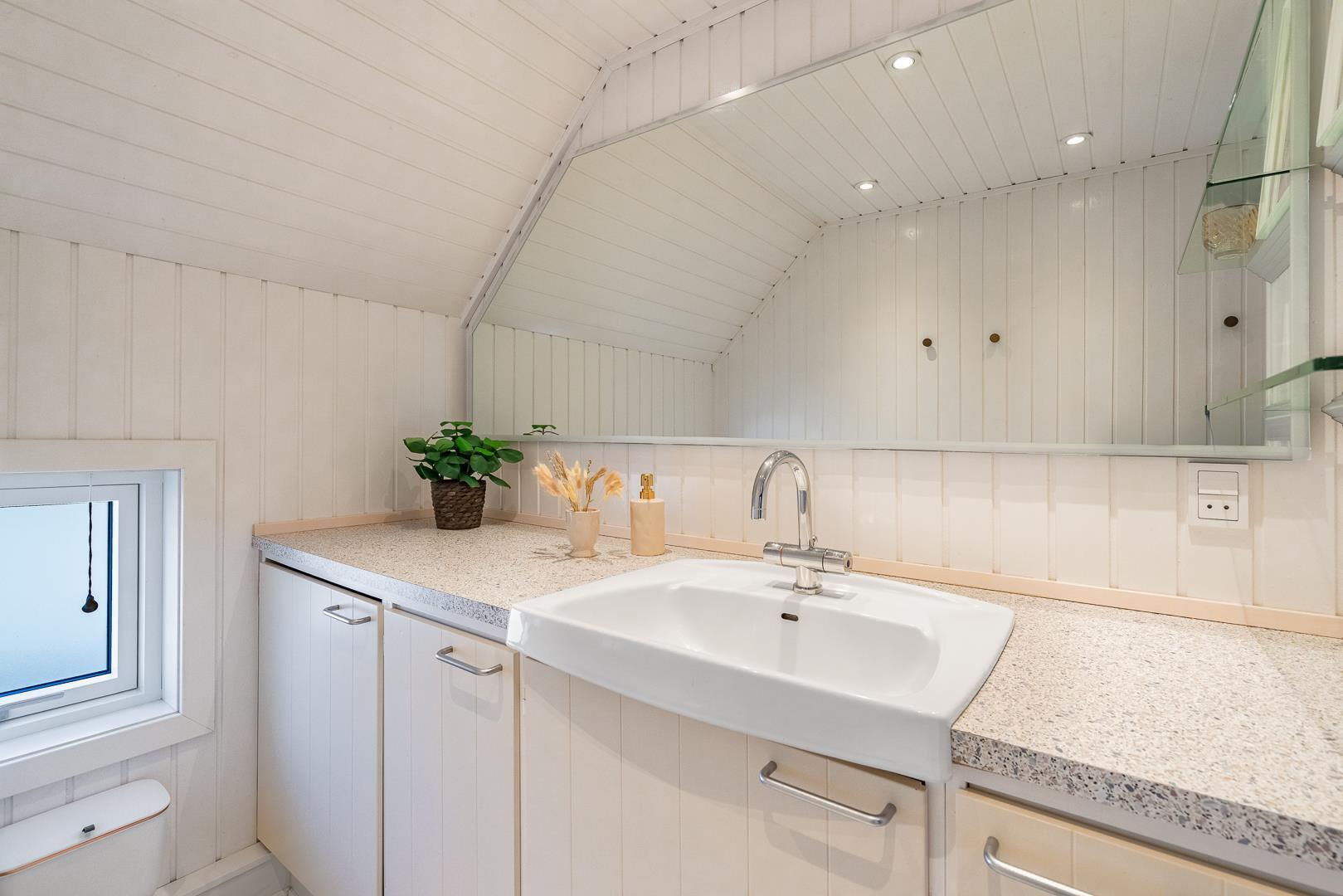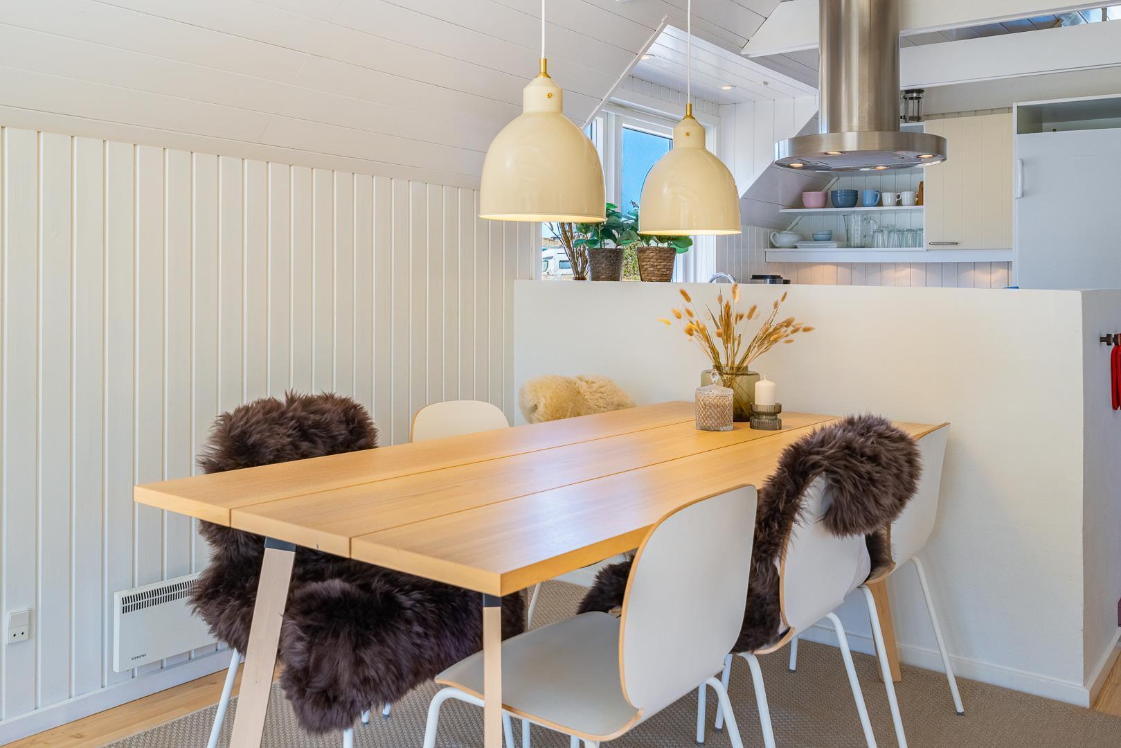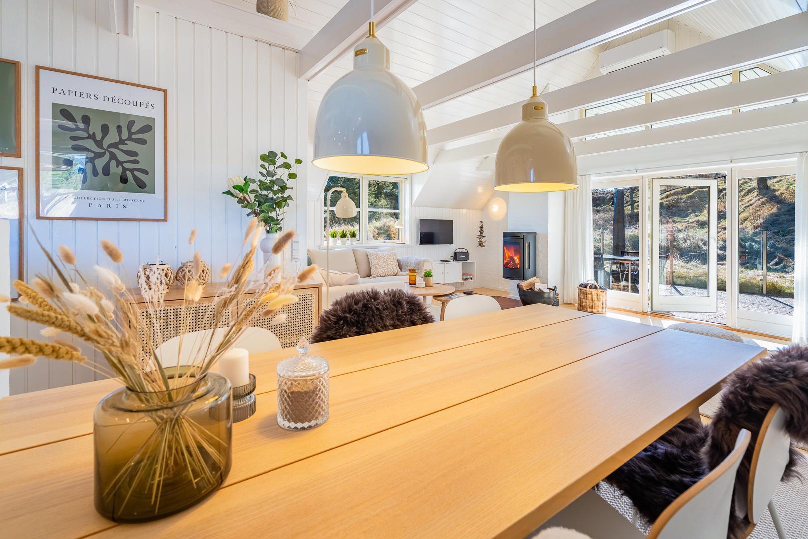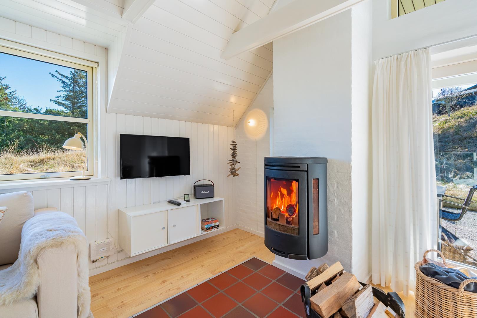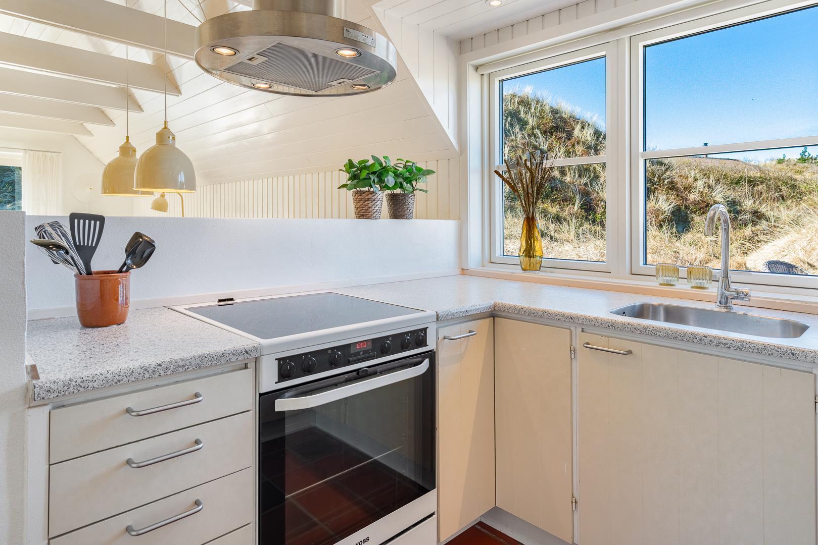 På en kuperet klitgrund ligger dette charmerende kvalitetsferiehus med stråtag. Huset er smagsfuldt, lyst og venligt indrettet. Der er trægulve i hele huset. Indvendigt står huset flot køkken og badeværelse og moderne møbler. Her er et hus der har sjæl og moderniseret med nænsom hånd. Der hems og flere dejlige terrasse, hvoraf en er delvis overdækket. Der er depot med bla. stort køle /fryseskab. Sengestørrelser: dobbeltseng 180x200 cm. (2 madrasser), dobbeltseng 180x200 cm. (2 madrasser), dobbeltseng (Hems) 140x200 cm. (1 madras)