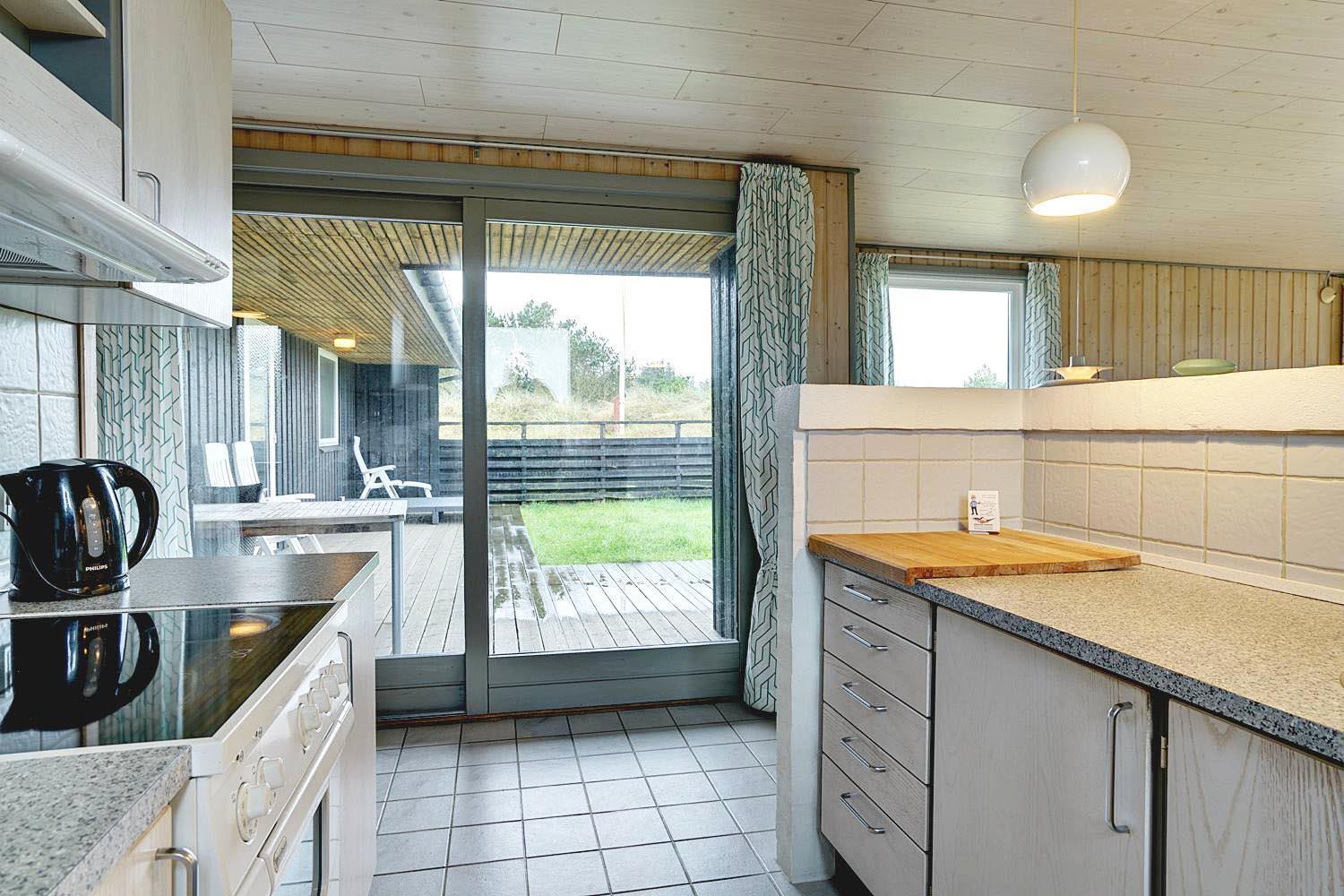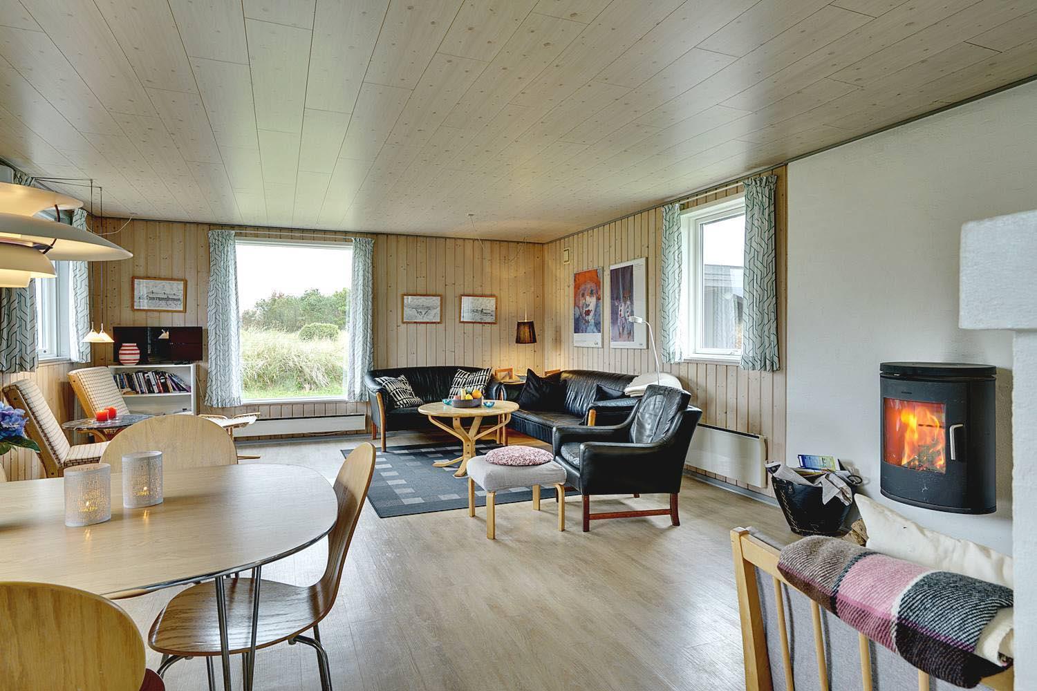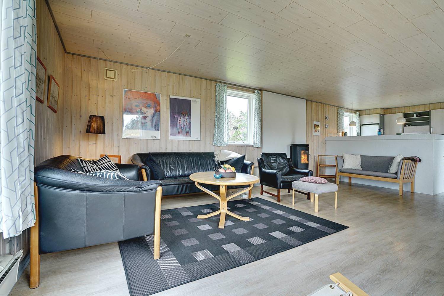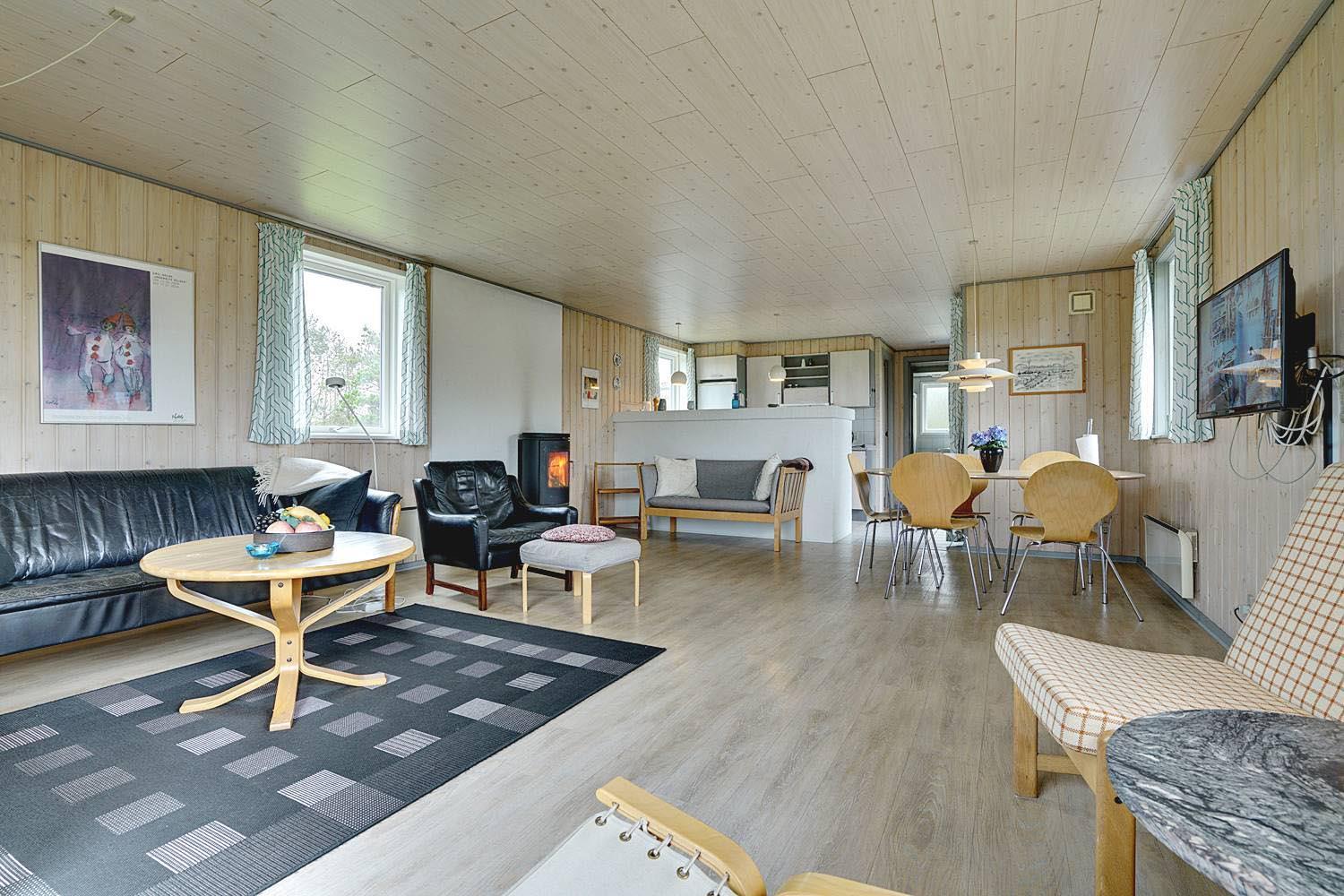 Rummeligt feriehus beliggende på en pragtfuld naturgrund i rolige omgivelser. Køkken ligger i åben forbindelse med den hyggelig stue med brændeovn. Overalt er huset indrettet i lyse, venlige farver. Der er flere skønne terrasser hvoraf den ene er overdækket, og en der er helt lukket. Her er altid mulighed for at finde læ.