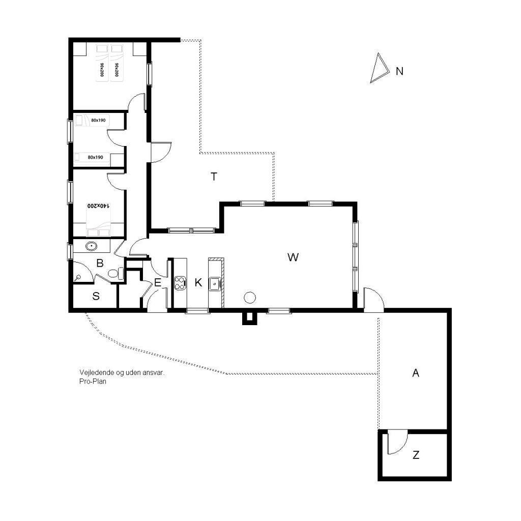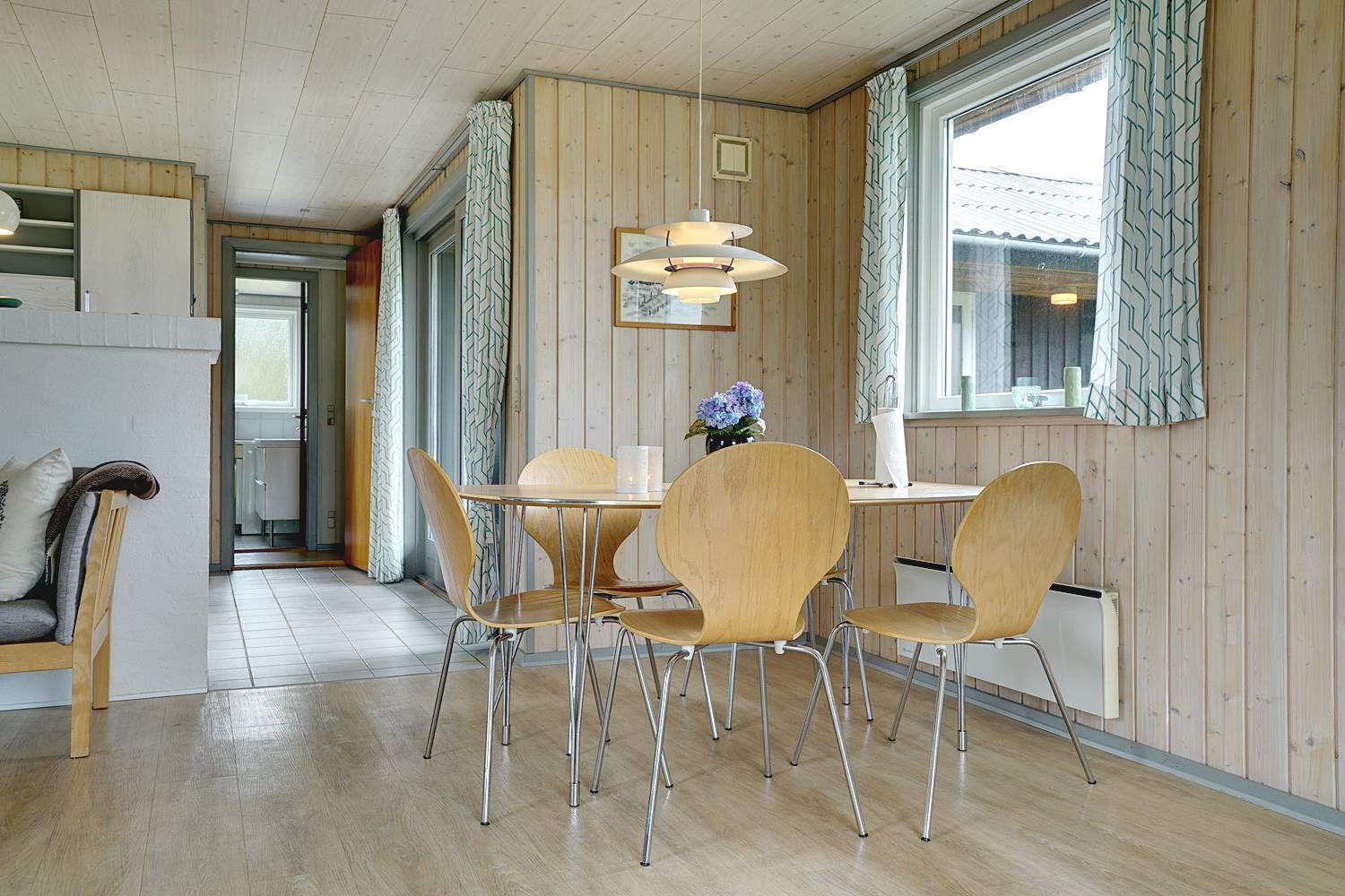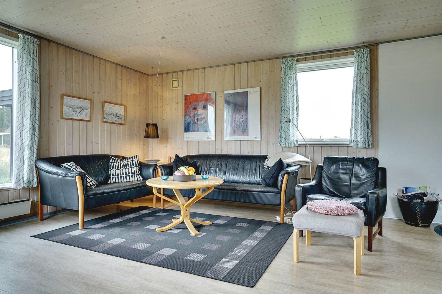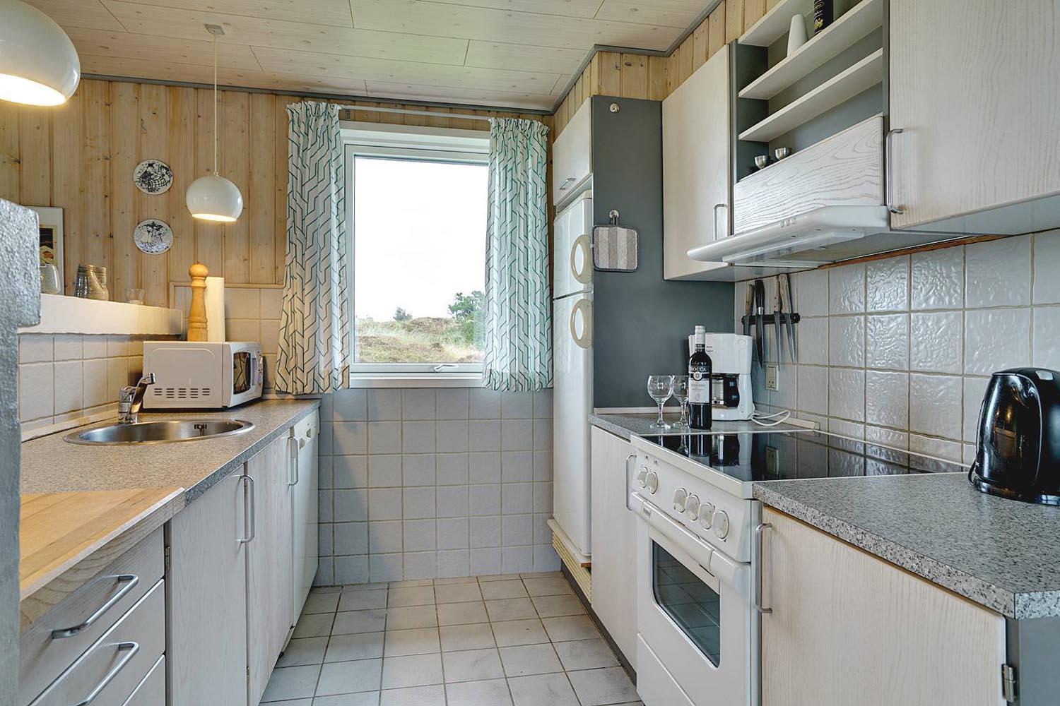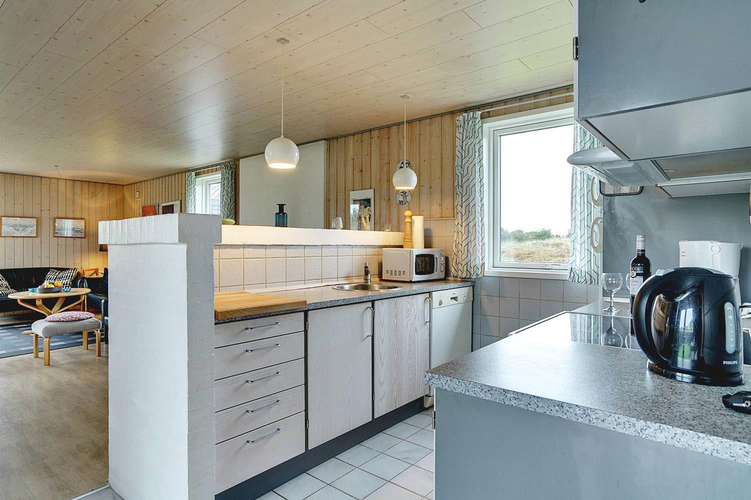 Rummeligt feriehus beliggende på en pragtfuld naturgrund i rolige omgivelser. Køkken ligger i åben forbindelse med den hyggelig stue med brændeovn. Overalt er huset indrettet i lyse, venlige farver. Der er flere skønne terrasser hvoraf den ene er overdækket, og en der er helt lukket. Her er altid mulighed for at finde læ.