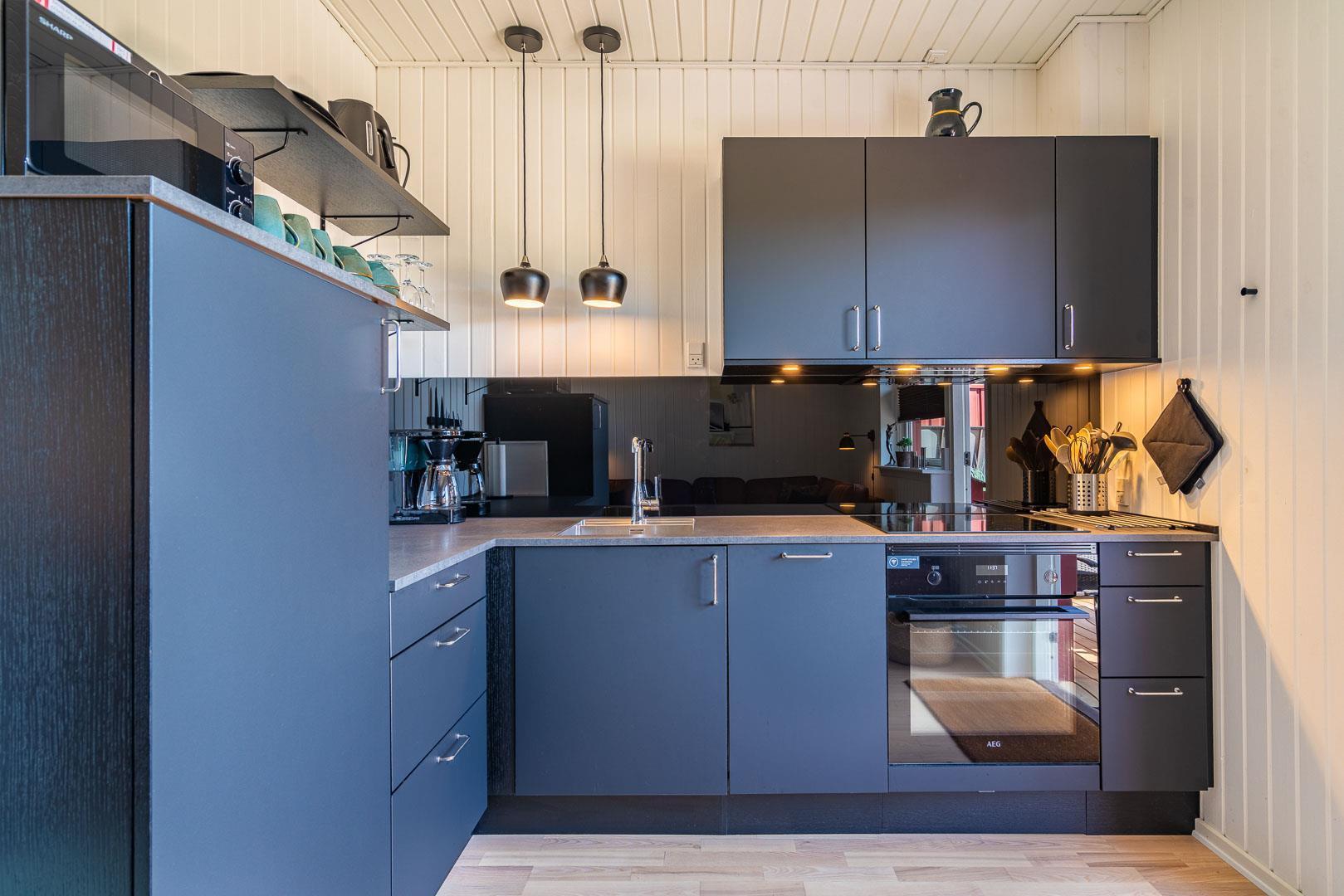 Hyggelig lille bungalow lejlighed med køkken, badeværelse med håndklædetørrer og to soveværelser.