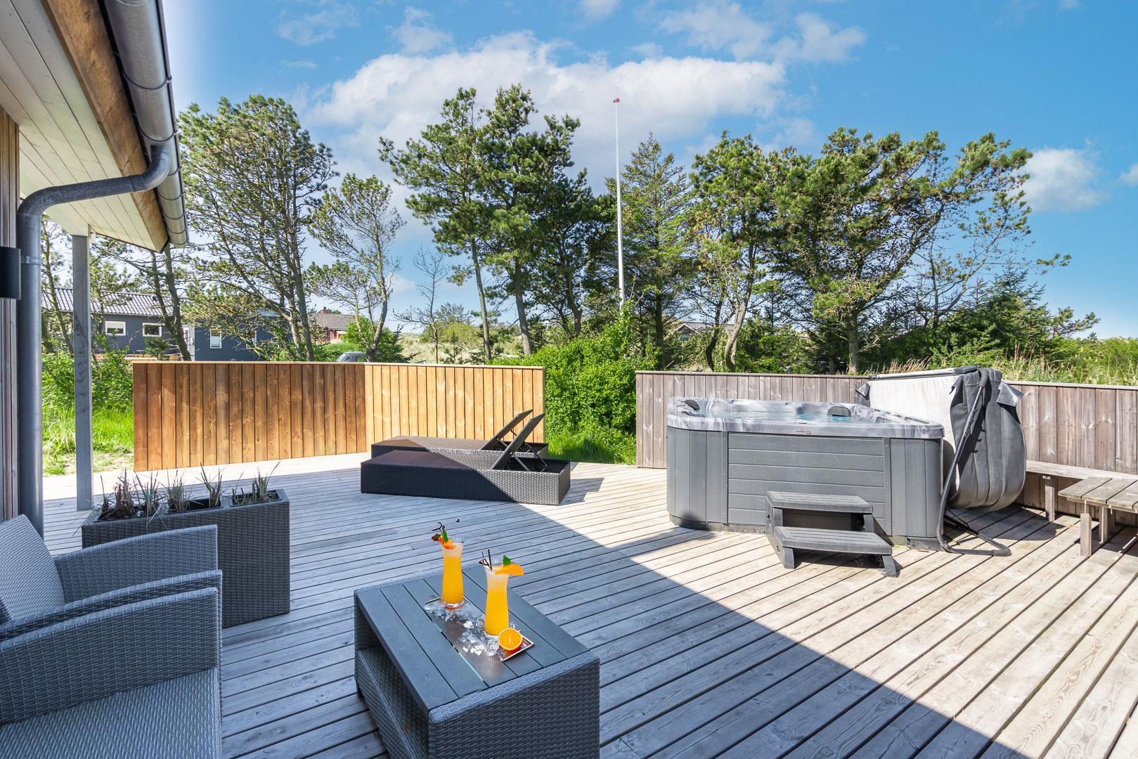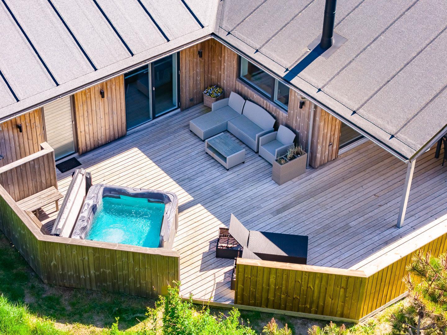 Dette aktivitetshus med udespa har alt hvad man skal bruge for at for at få en fantastisk ferie. Huset er nyopført og rummer aktiviteter og faciliteter, som hele familien vil se tilbage på med glæde. Agerhønevej 12 - Henne Strand byder på et stort, lyst og kombineret køkkenalrum og stue. Her kan hele familien hygge sig og nyde hinandens selskab, hvad enten det er over en hygge middag eller et spil. I dette pragtfulde aktivitetshus er der også tænkt på husets små gæster, så her er både rutchebane, gynge og trampolin.