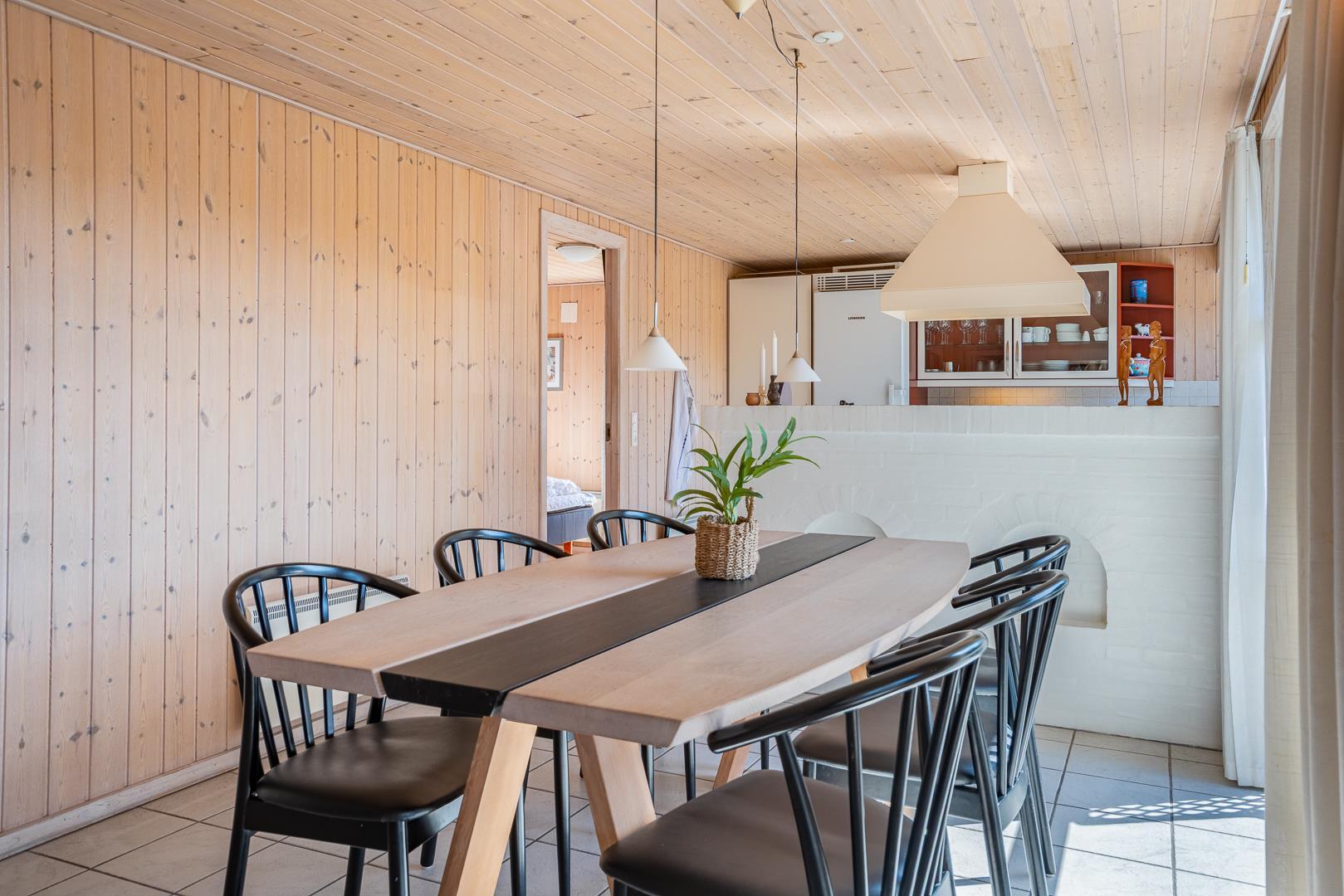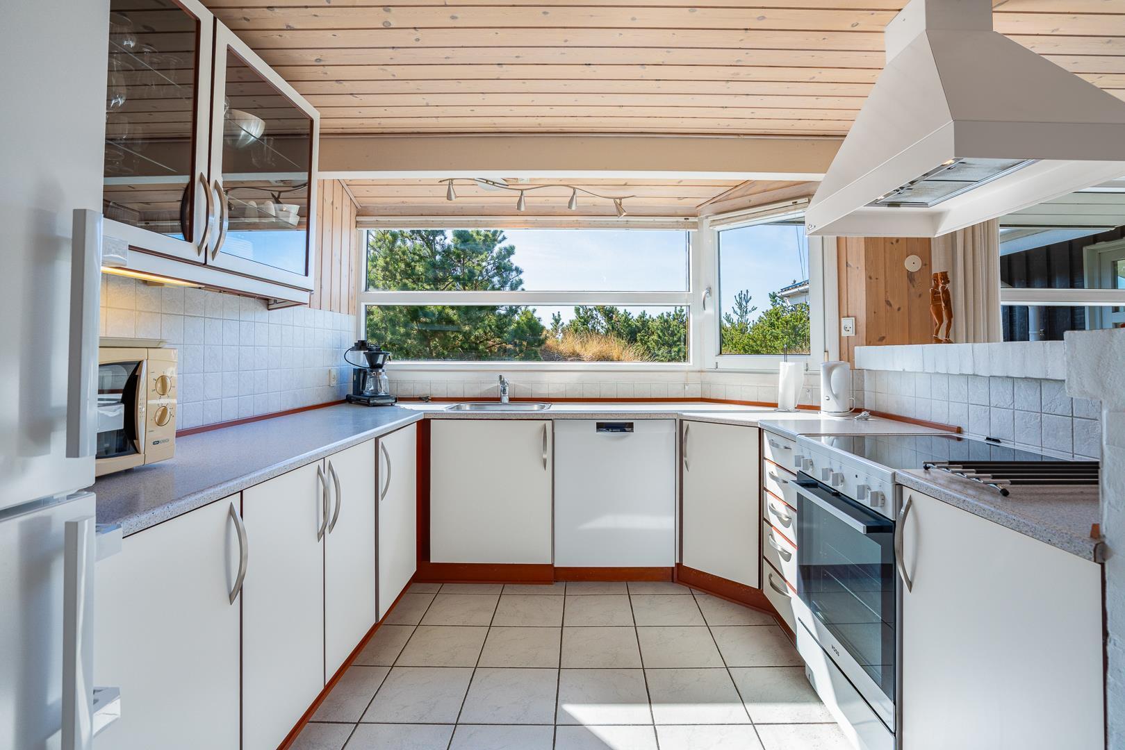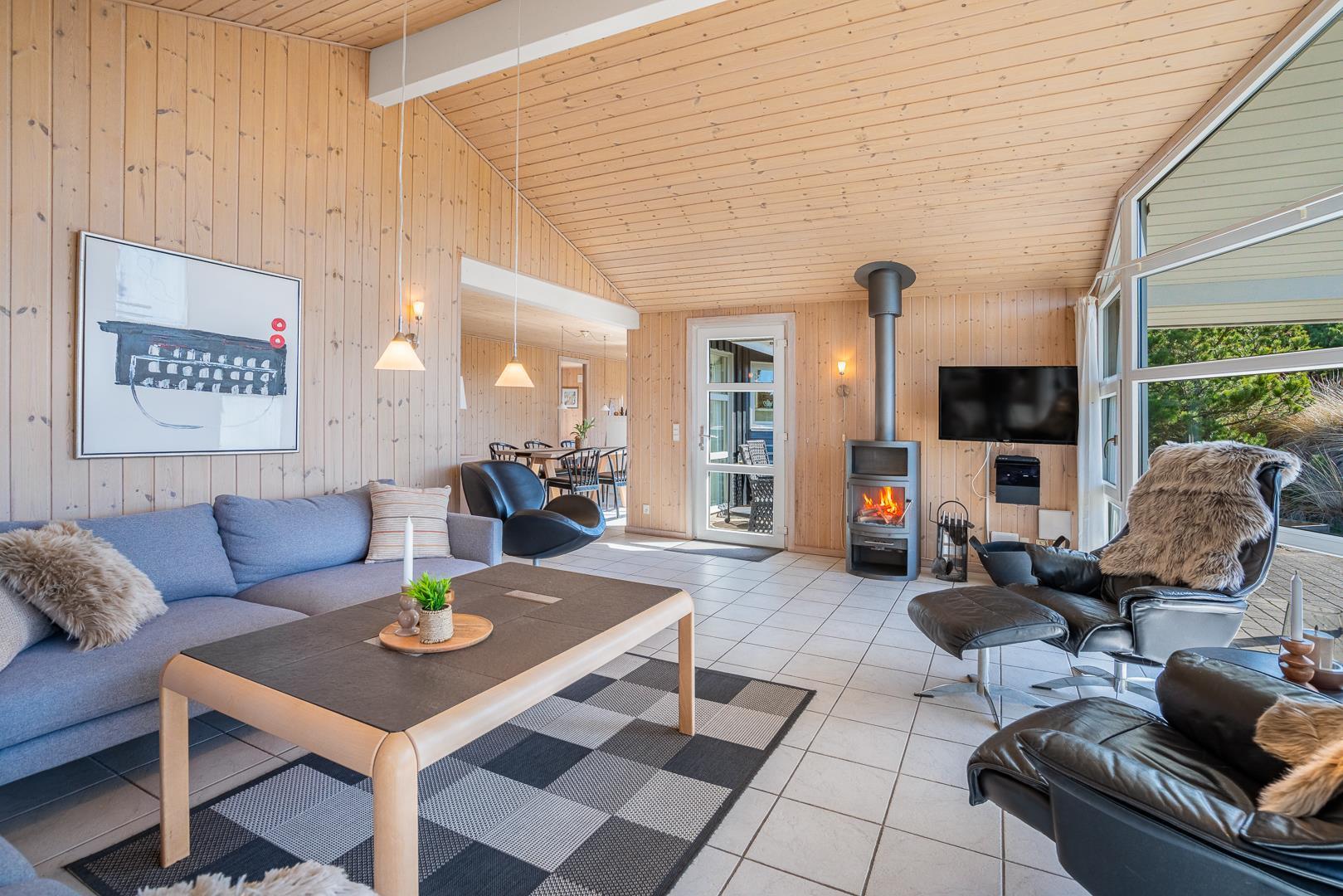 Feriehuset er lyst og velindrettet, og byder dig velkommen med åbne arme, med lyse farver og skønne møbler der skaber en følelse af harmoni og ro. Køkkenet, der smelter sammen med stuen, inviterer til hyggelige stunder og fælles måltider. I stuen finder du desuden brændeovnen der sørger for at skrue ekstra op for hyggen. Herfra er der udgang til de skønne terrasser, hvor der er gode muligheder for at finde læ og nyde naturens skønhed året rundt. Ved terrassen finder du et gyngestativ og en sandkasse – god underholdning til de mindste feriegæster.