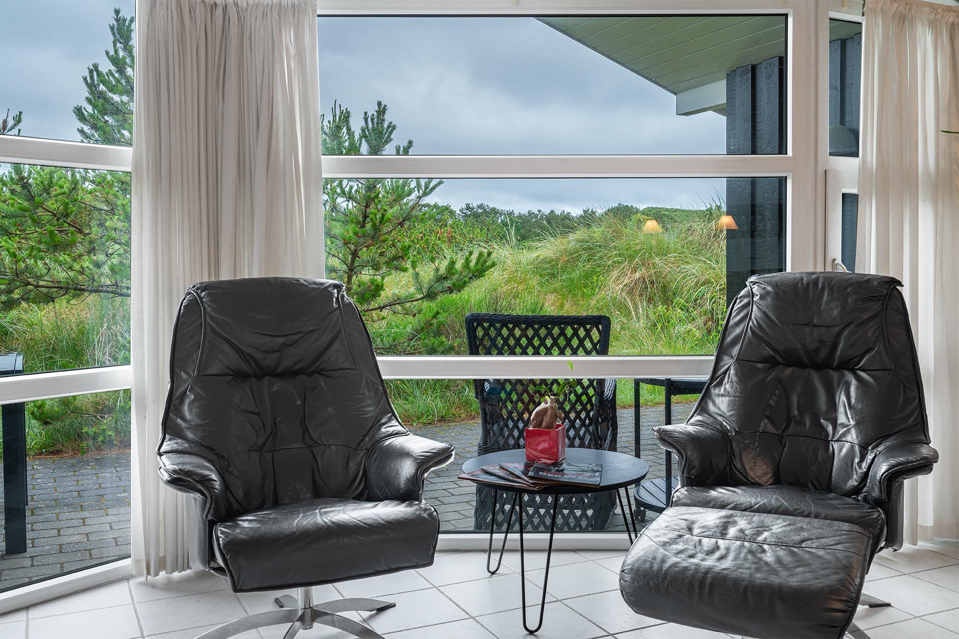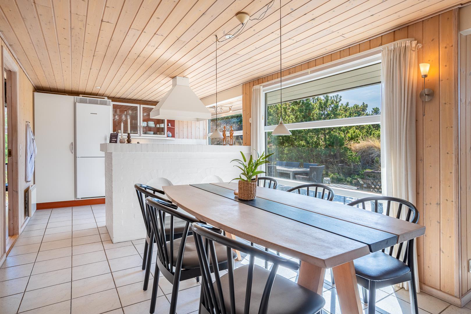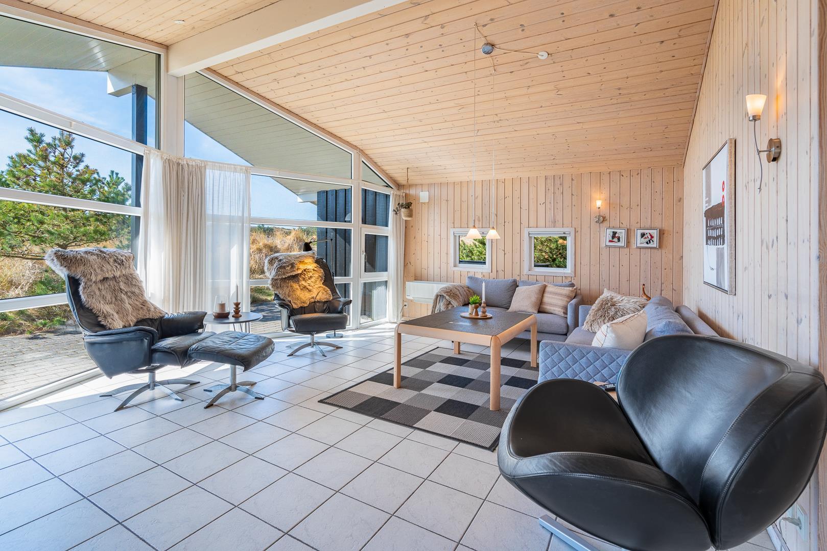 Feriehuset er lyst og velindrettet, og byder dig velkommen med åbne arme, med lyse farver og skønne møbler der skaber en følelse af harmoni og ro. Køkkenet, der smelter sammen med stuen, inviterer til hyggelige stunder og fælles måltider. I stuen finder du desuden brændeovnen der sørger for at skrue ekstra op for hyggen. Herfra er der udgang til de skønne terrasser, hvor der er gode muligheder for at finde læ og nyde naturens skønhed året rundt. Ved terrassen finder du et gyngestativ og en sandkasse – god underholdning til de mindste feriegæster.