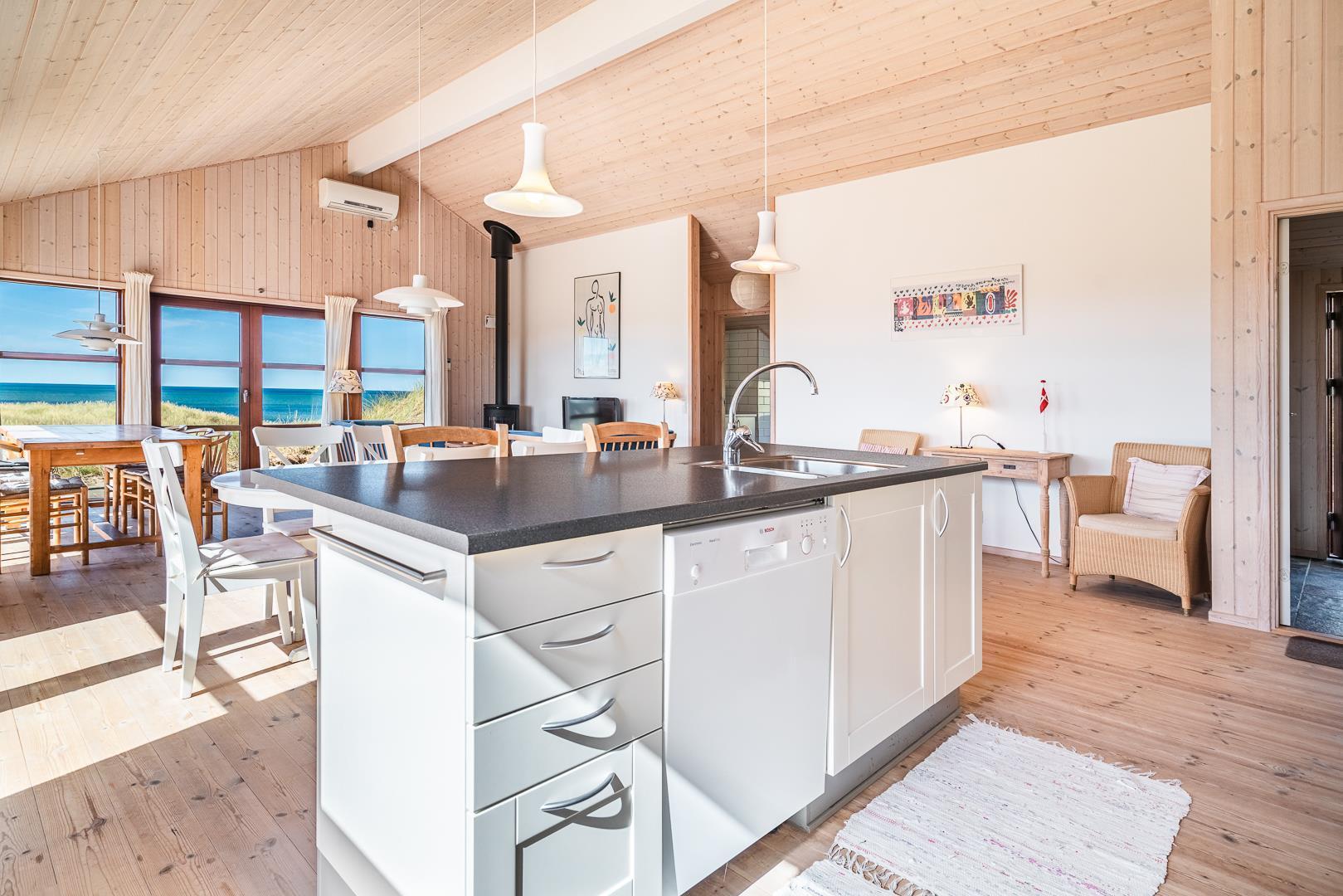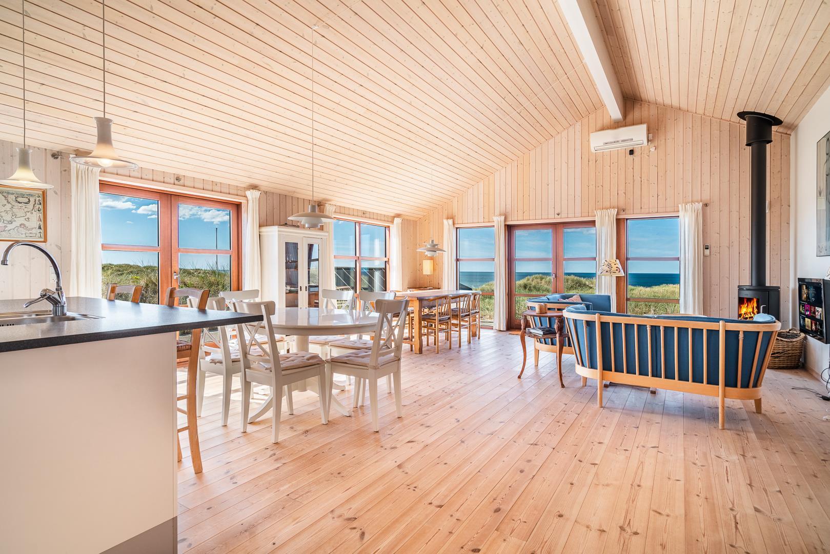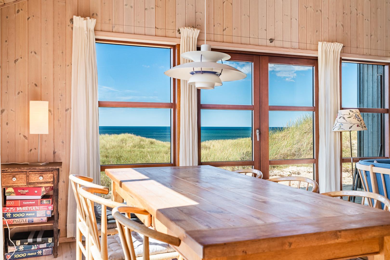 PANORAMUDSIGT. På en af Hennes bedst beliggende grunde, med direkte panorama udsigt over det storslåede Vesterhav og klitterne, tilbydes dette nyere træhus til udlejning. Huset ligger med kun 50 m til stranden, et stenkast fra vandet. Her er flere dejlige terrasser, hvoraf den ene er overdækket. Indendørs er der 4 soverum, hvorfra der fra 3 soverum er udgang. Pæn og hyggelig stue med stort vinduesparti med storslået udsigt over de marehalm beklædte klitter. Lyst køkken med opvaskemaskine og separat fryser på ca. 50 liter. Huset er inddelt i 2 afdelinger med 2 soverum og badeværelse i hver afdeling, det ene badeværelse har spa og sauna. Begge badeværelser er med gulvvarme. Der er TV såvel i stuen som i et soverum. Bryggers med adgang fra entreen med vaskemaskine og tørretumbler. Varmepumpe, som er miljøvenlig og strømbesparende, derudover hjælper brændeovn med at holde varmen på de kølige dage. Huset udlejes uden hund og rygning. Naturligvis er der gratis WIFI. Et pænt hus på en fantastisk, unik og enestående grund charmerende på alle årstider, hvad enten det er når Vesterhavet om sommeren viser sig fra sin pæneste side, eller det er om vinteren, hvor Vesterhavet viser tænder. Huset egner sig ikke for gangbesværede. Da huset ligger i klitterne, er der kun mulighed for parkering for 2 biler ved huset. Depotrum privat.