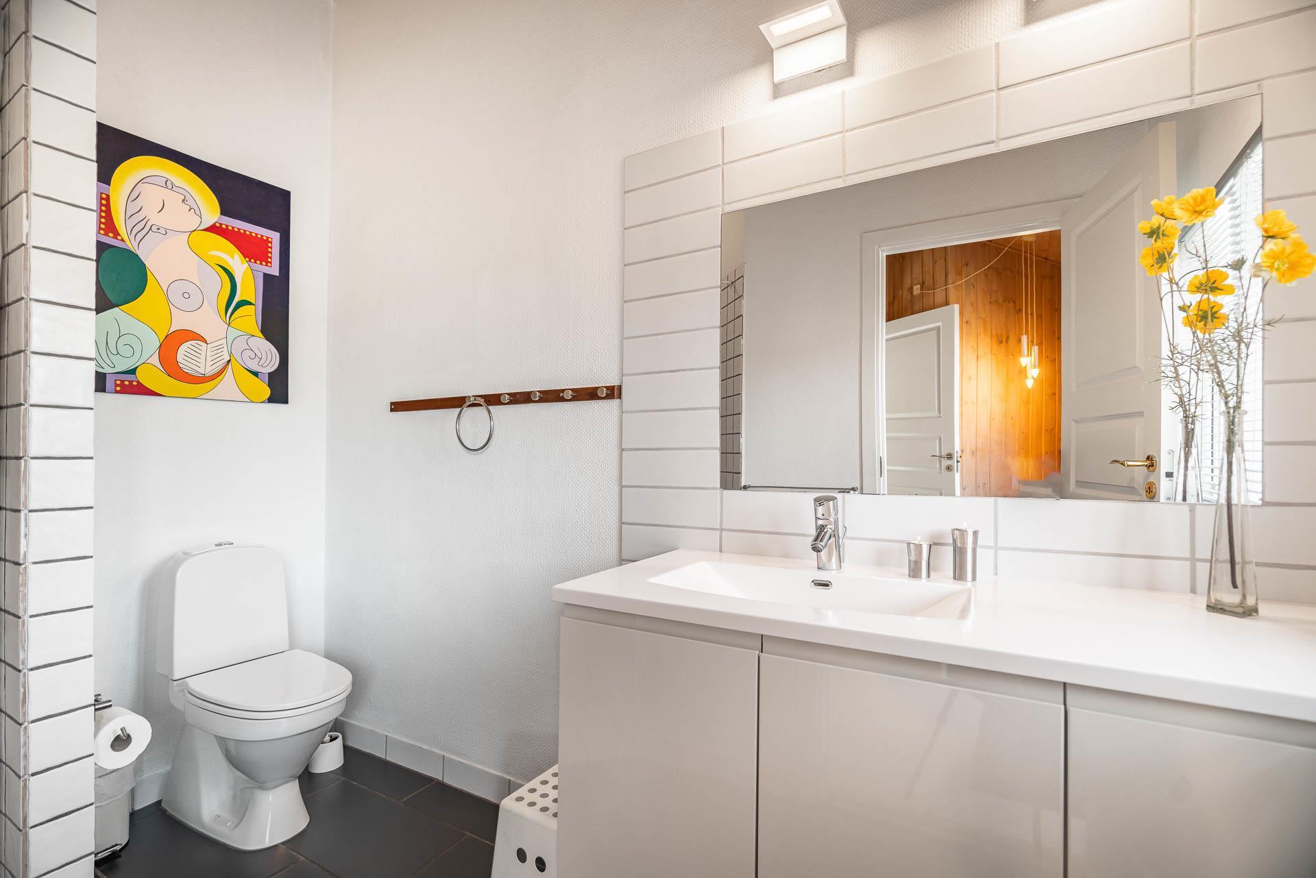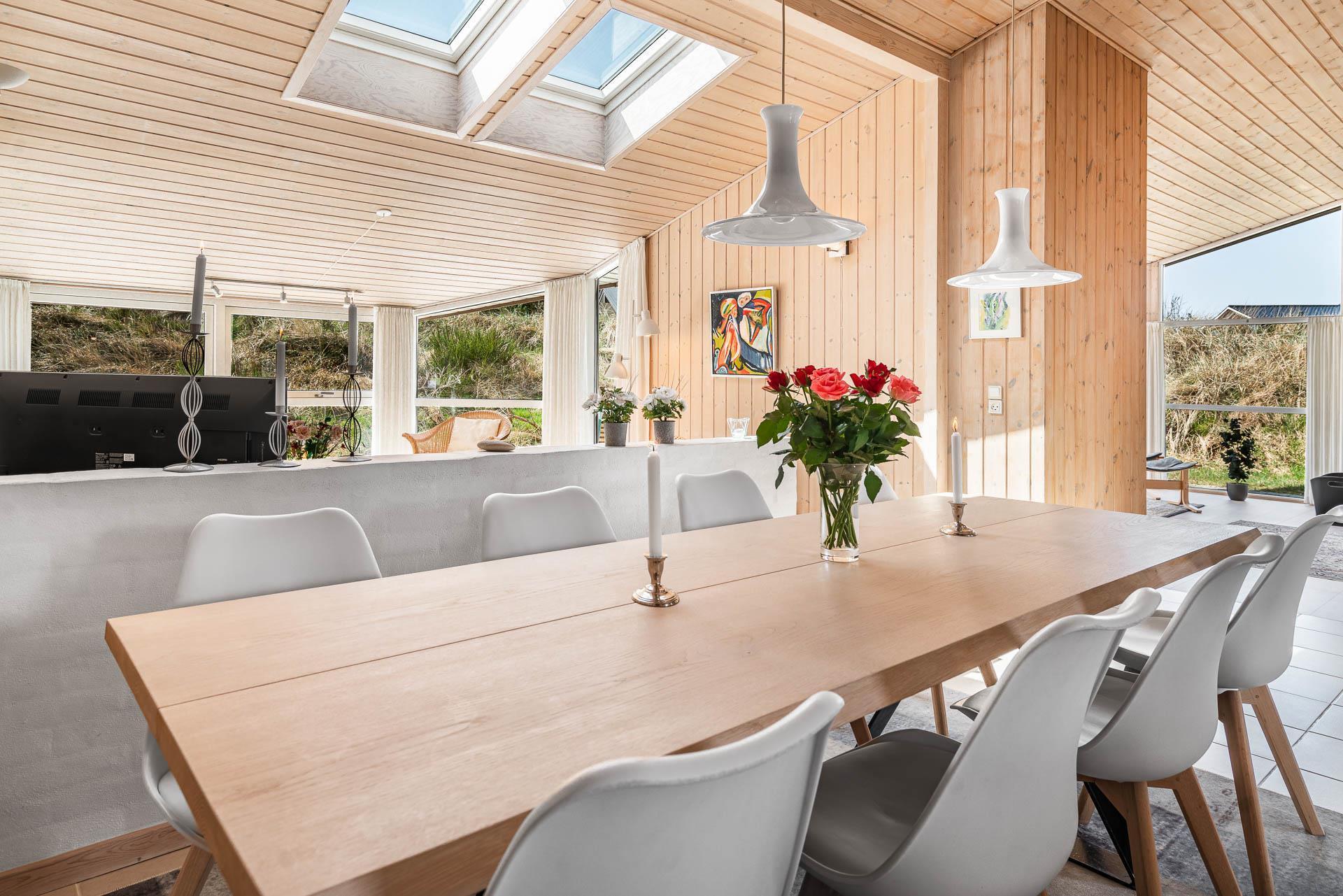 Med en unik beliggenhed og ikke langt fra strand og Henne Strand By ligger dette dejlige og meget vedligeholdte sommerhushus med en dejlig lyst udestue. Hyggelig smagfuldt møbleret pejsestue, hvor I kan slappe af og nyde den behagelige varme med udsigt til den kupere naturgrund. Flot lyst funktionelt køkken med kogeø. En halvmur fra køkken til havestuen adskiller spisestuen fra den hyggelige udestue. Omkring feriehuset er der anlagt flere dejlige terrasser, hvor der altid er mulighed for at finde læ og dermed nyde døgnets lyse timer. Godt redskabsrum til cykler, golfsæt og lignende hvor disse kan opbevares. Gratis golf på Henne samt Outrup Golfklub.