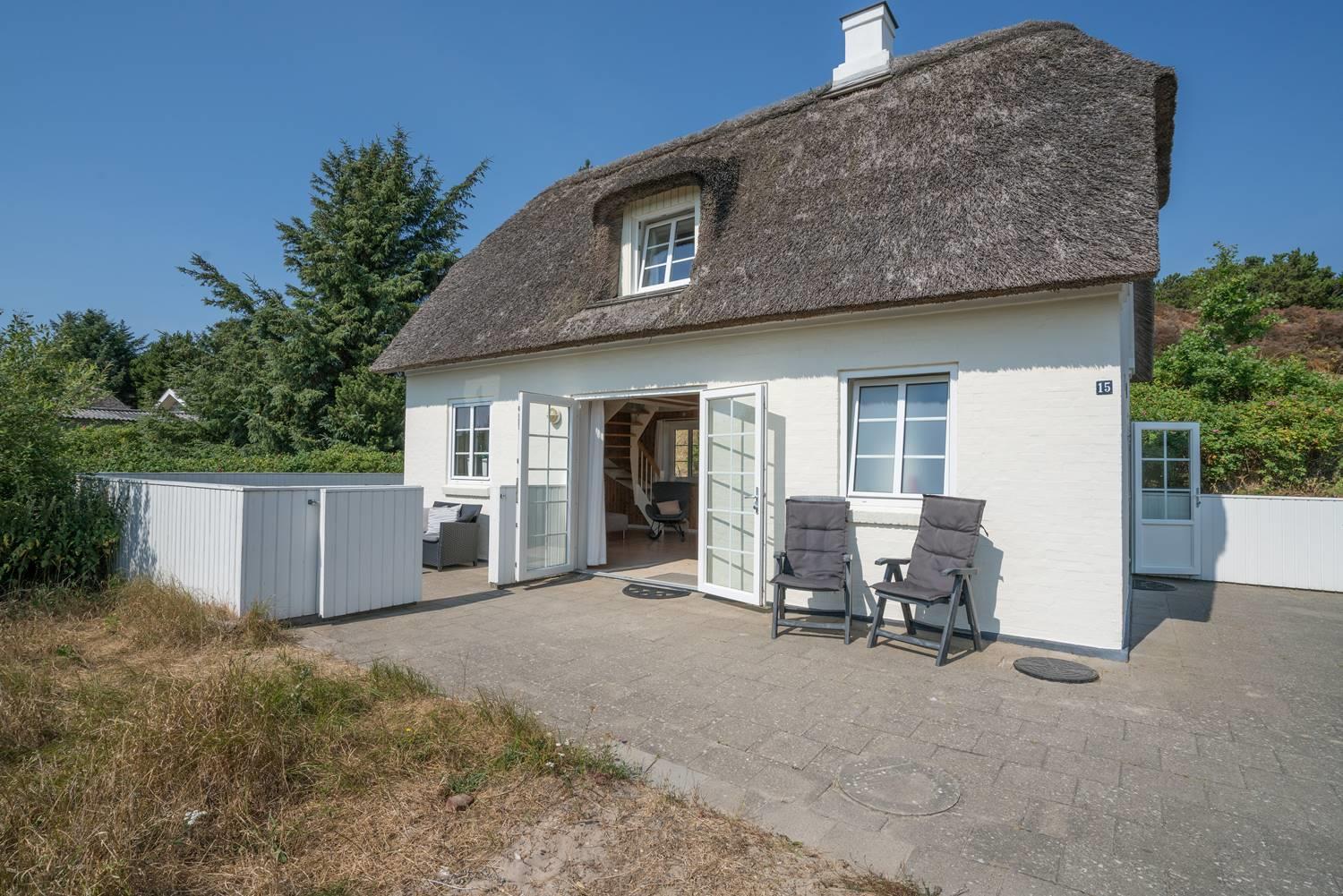 Hyggeligt og velholdt stråtækt sommerhus nær Henne Strand med stor lukket terrasse og klassisk charme.