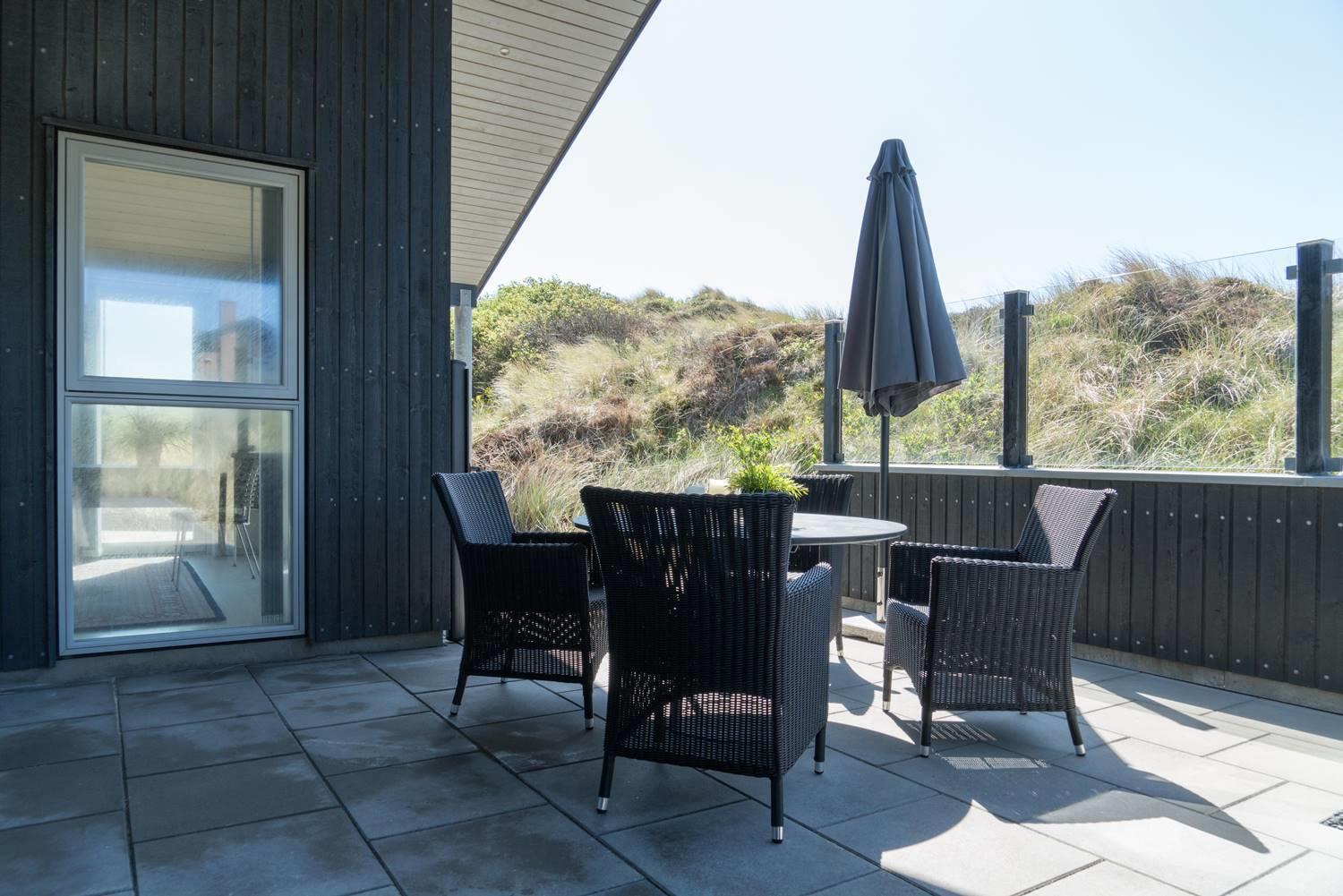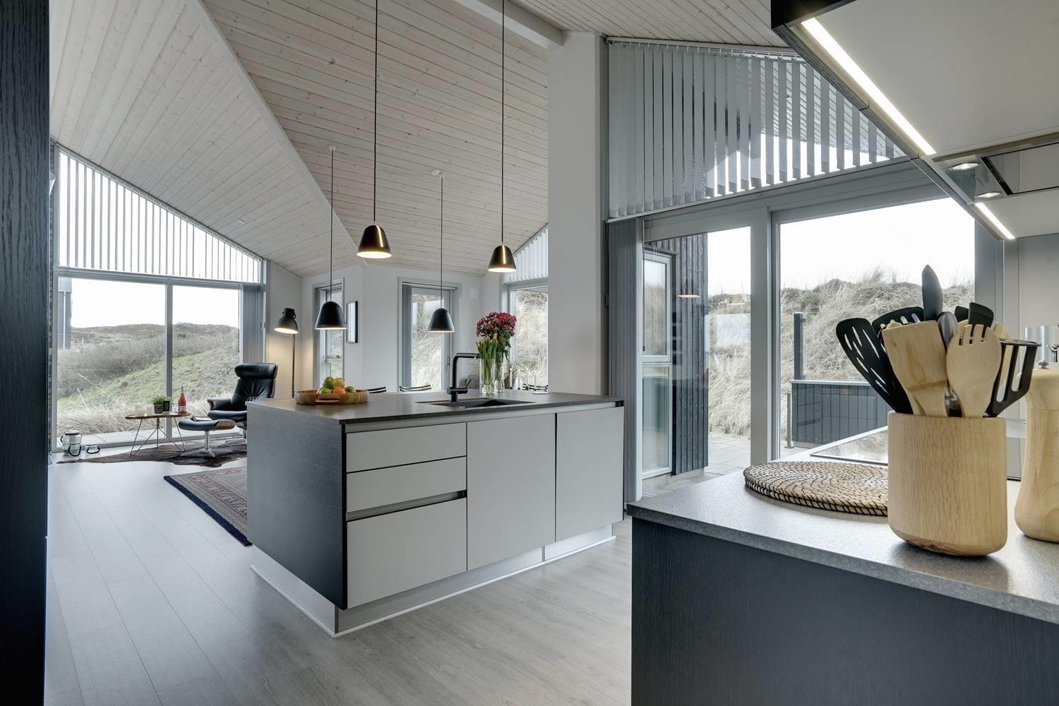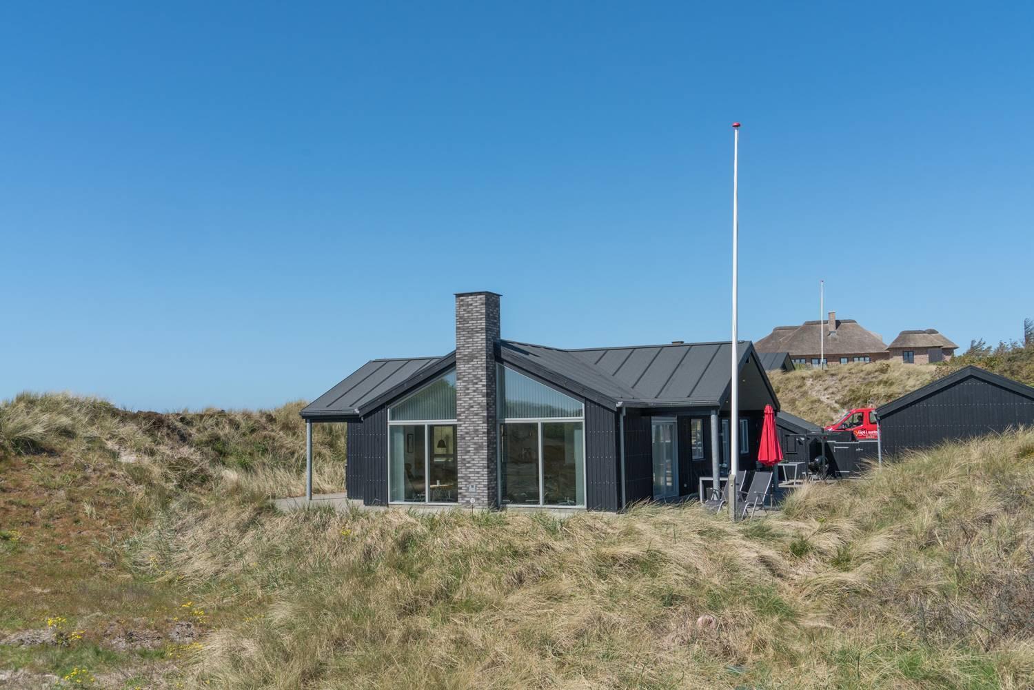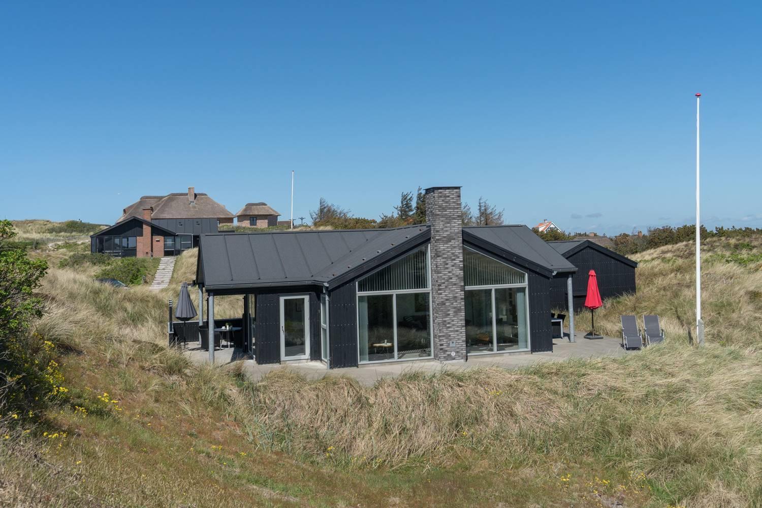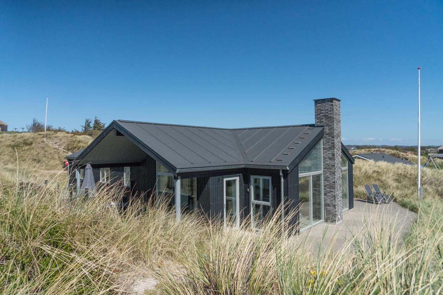 Kun få hundrede meter fra stranden ligger dette stilfulde luksushus. Huset er højt beliggende og ugeneret på en let kuperet klitgrund med skøn udsigt over området. Huset er rummeligt med store rum, højt til loftet og masser af lys fra store vinduer. I forbindelse med køkken/alrummet er der dejlig stue, som er indrettet med kvalitetsmøbler og med udsigt over området. Der er 2 flotte badeværelser med bruser i det ene ligeledes spa og sauna. 3 gode soverum alle med dobbeltsenge og god skabsplads, i det ene er der elevationsseng. Kontor med sovesofa. Hems på 18 m2. Stor flisebelagt og delvis overdækket terrasse omkring huset, hvor der altid er muligt at finde en lækrog. Huset er ekstra isoleret og med energibesparende gulvvarme fra luft til vand varmepumpe. Et helt fantastisk luksus feriehus i absolut bedste kvalitet, hvor alt i huset fremstår som nyt og indbydende.