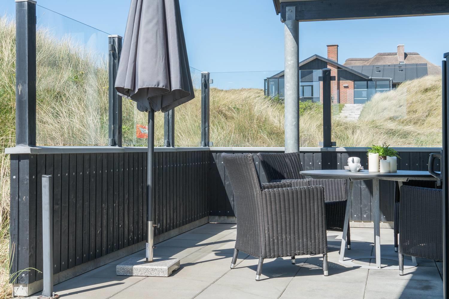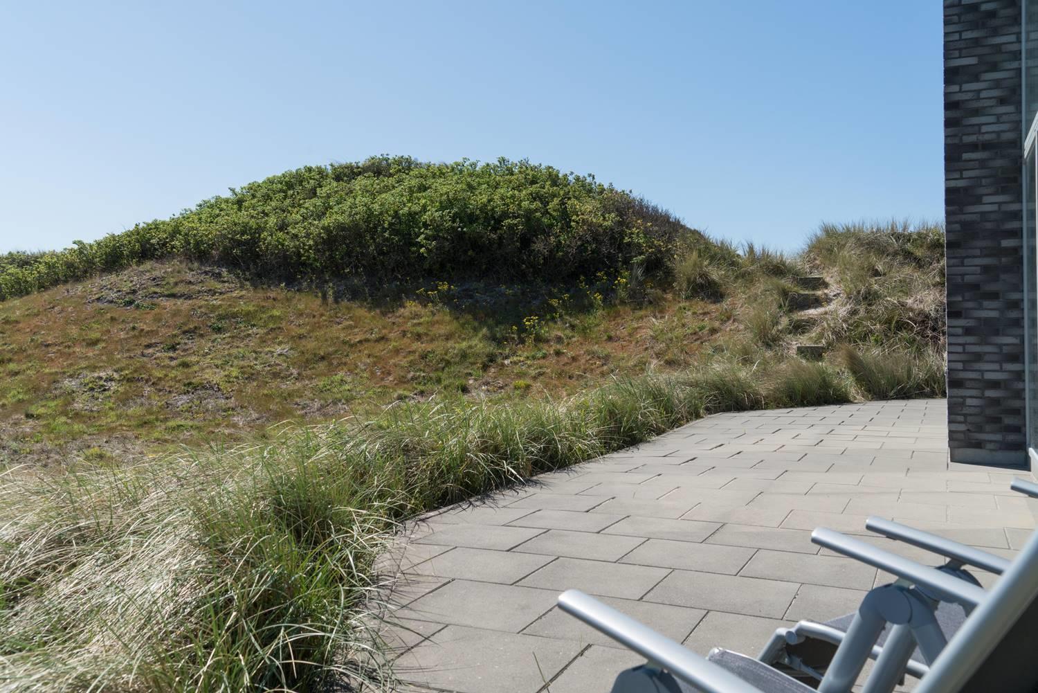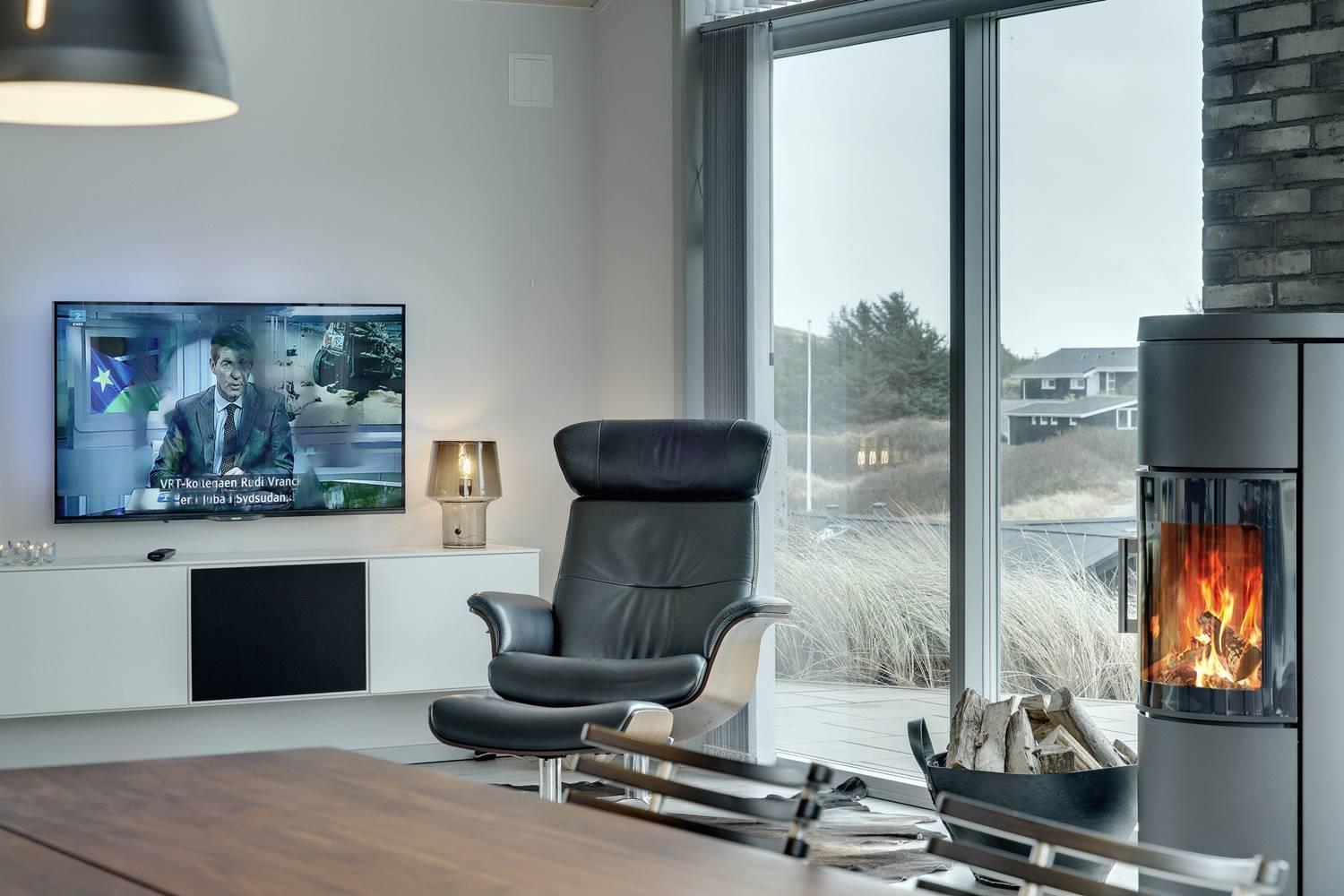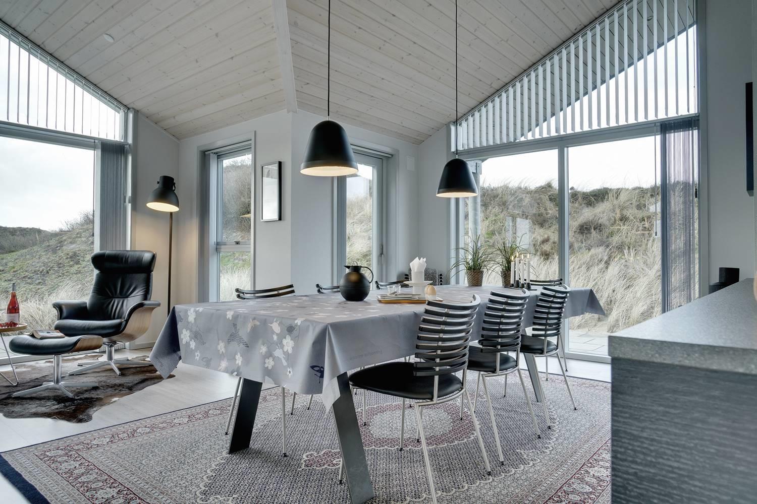 Kun få hundrede meter fra stranden ligger dette stilfulde luksushus. Huset er højt beliggende og ugeneret på en let kuperet klitgrund med skøn udsigt over området. Huset er rummeligt med store rum, højt til loftet og masser af lys fra store vinduer. I forbindelse med køkken/alrummet er der dejlig stue, som er indrettet med kvalitetsmøbler og med udsigt over området. Der er 2 flotte badeværelser med bruser i det ene ligeledes spa og sauna. 3 gode soverum alle med dobbeltsenge og god skabsplads, i det ene er der elevationsseng. Kontor med sovesofa. Hems på 18 m2. Stor flisebelagt og delvis overdækket terrasse omkring huset, hvor der altid er muligt at finde en lækrog. Huset er ekstra isoleret og med energibesparende gulvvarme fra luft til vand varmepumpe. Et helt fantastisk luksus feriehus i absolut bedste kvalitet, hvor alt i huset fremstår som nyt og indbydende.