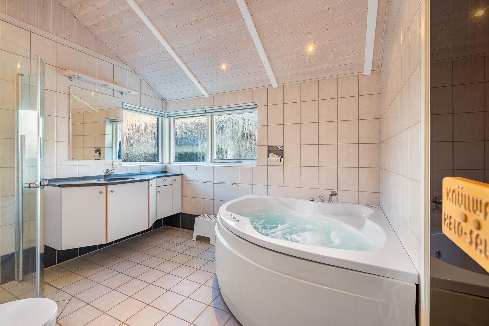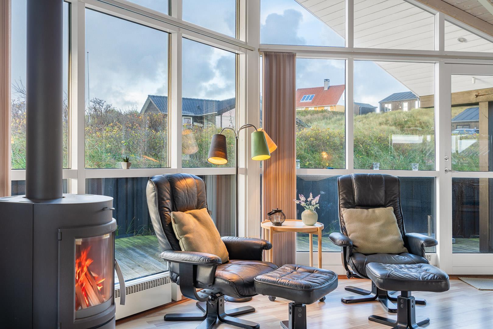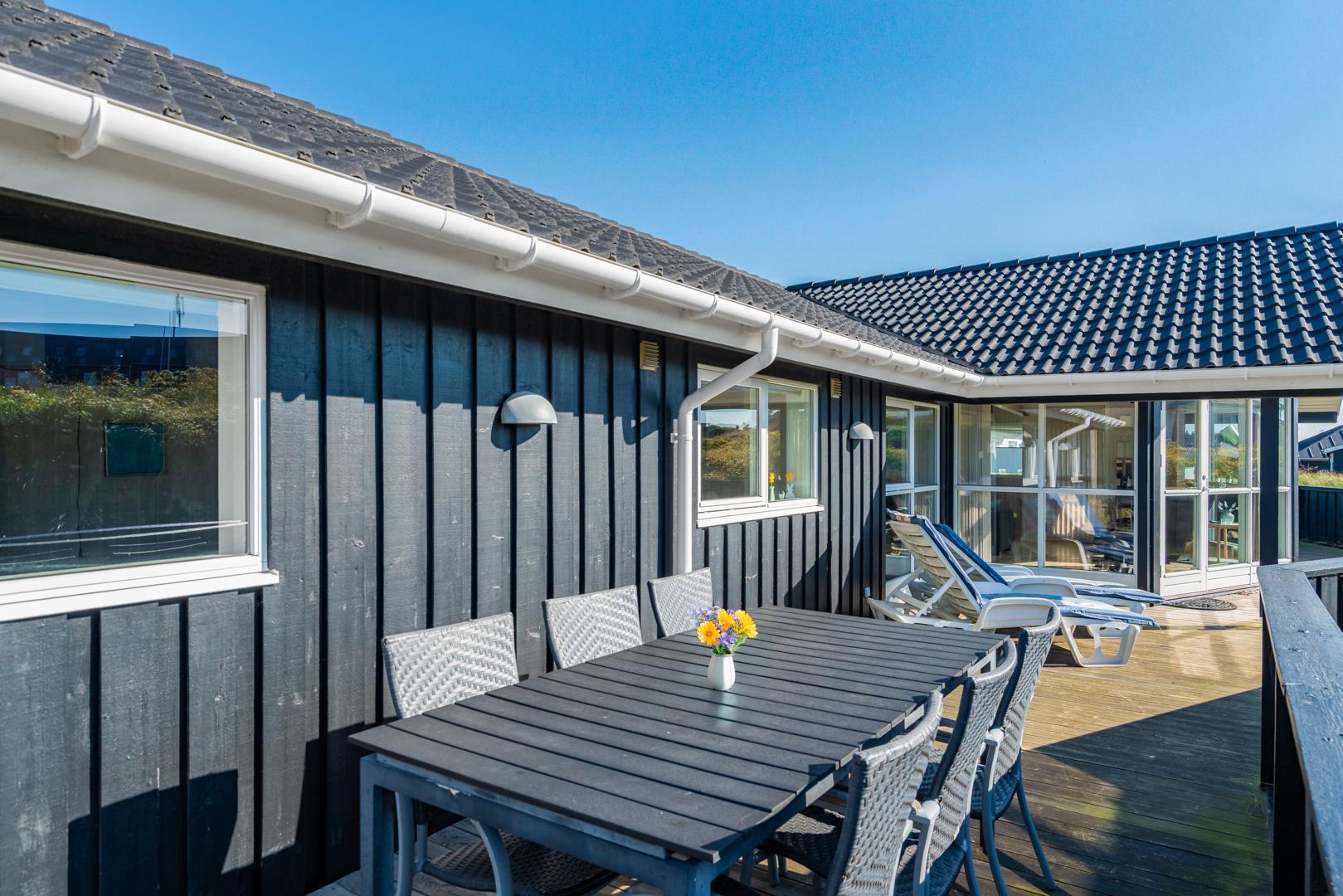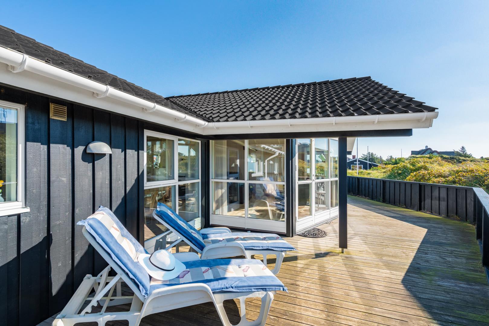 Kvalitetsferiehus med spa og sauna nær Henne Strands centrum og strand, med flere ugenerede terrasser og godt lysindfald.