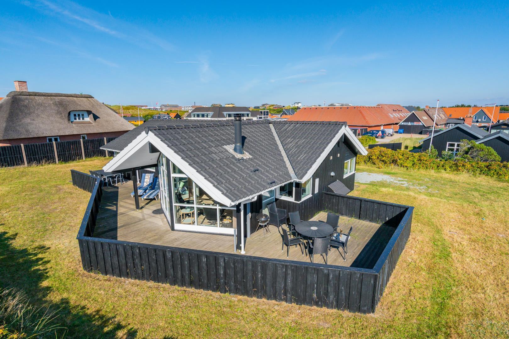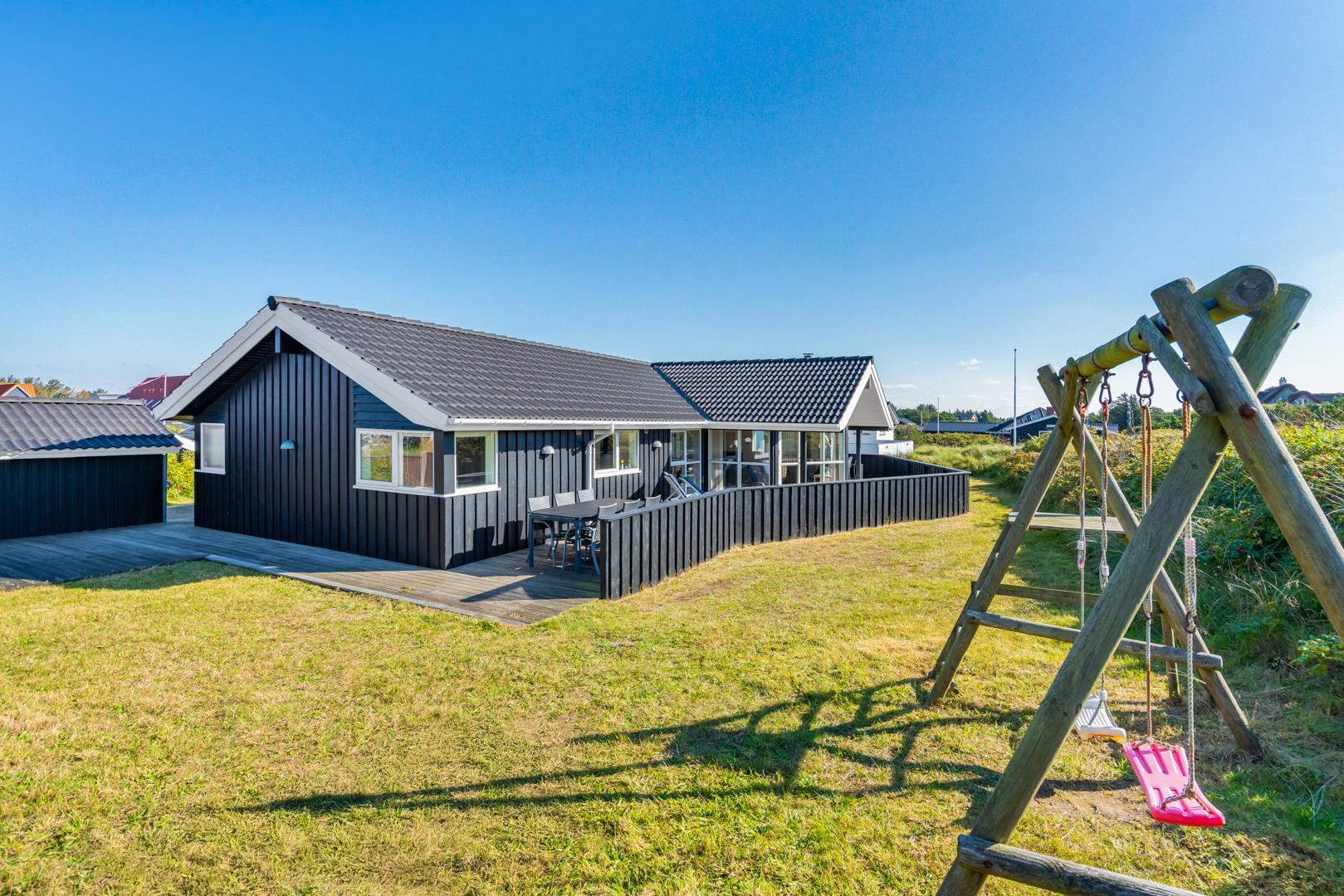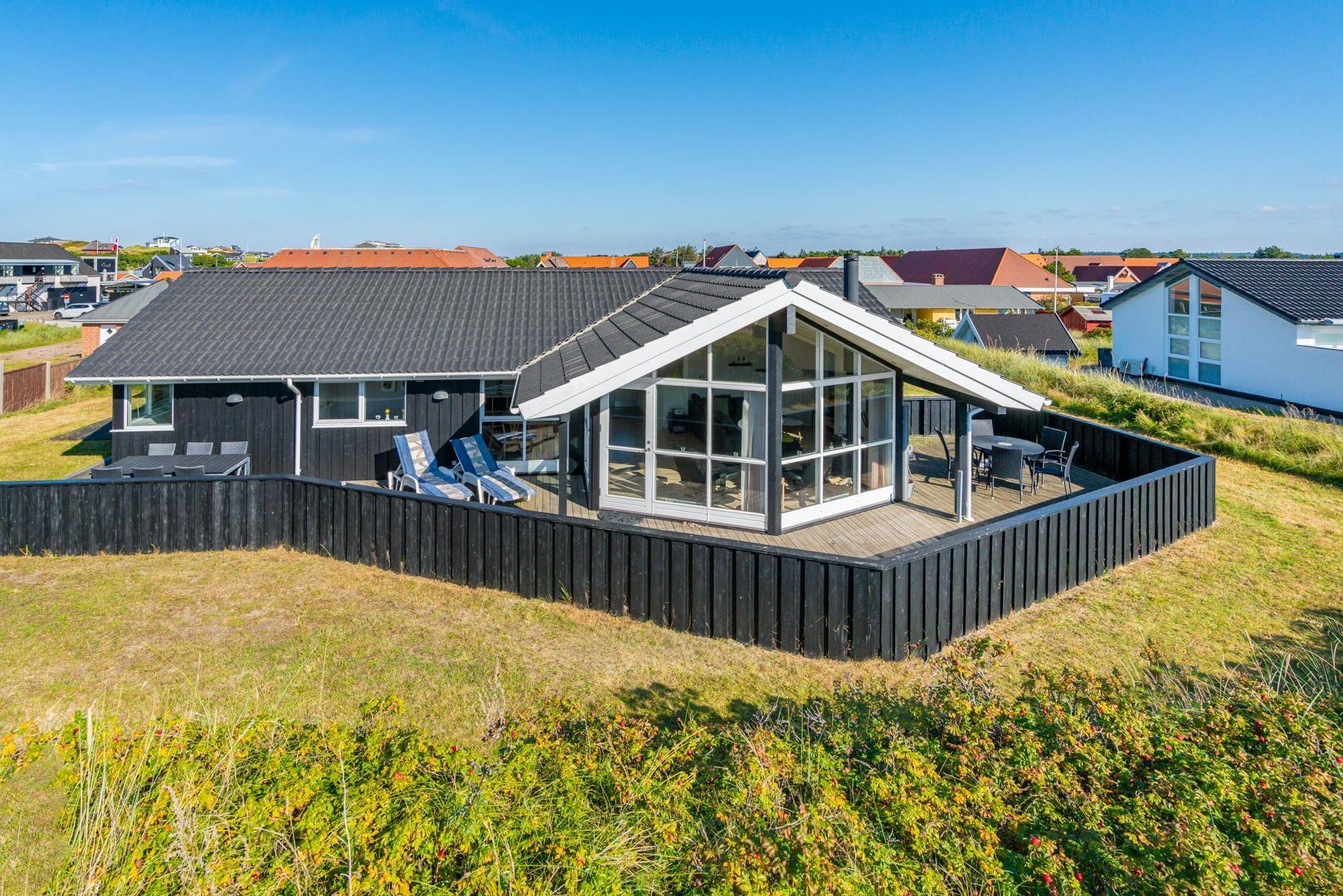 På en skøn klitgrund kun 2 minutters gang fra Henne Strands centrum og stranden, ligger dette kvalitetsferiehus med spa og sauna, godt tilbagetrukket i forhold til vejen, Det store vinduesparti giver et godt lysindfald ind i stuen. Huset råder over flere dejlige ugenerede terrasser, hvor der altid er mulighed for at finde en læ krog.