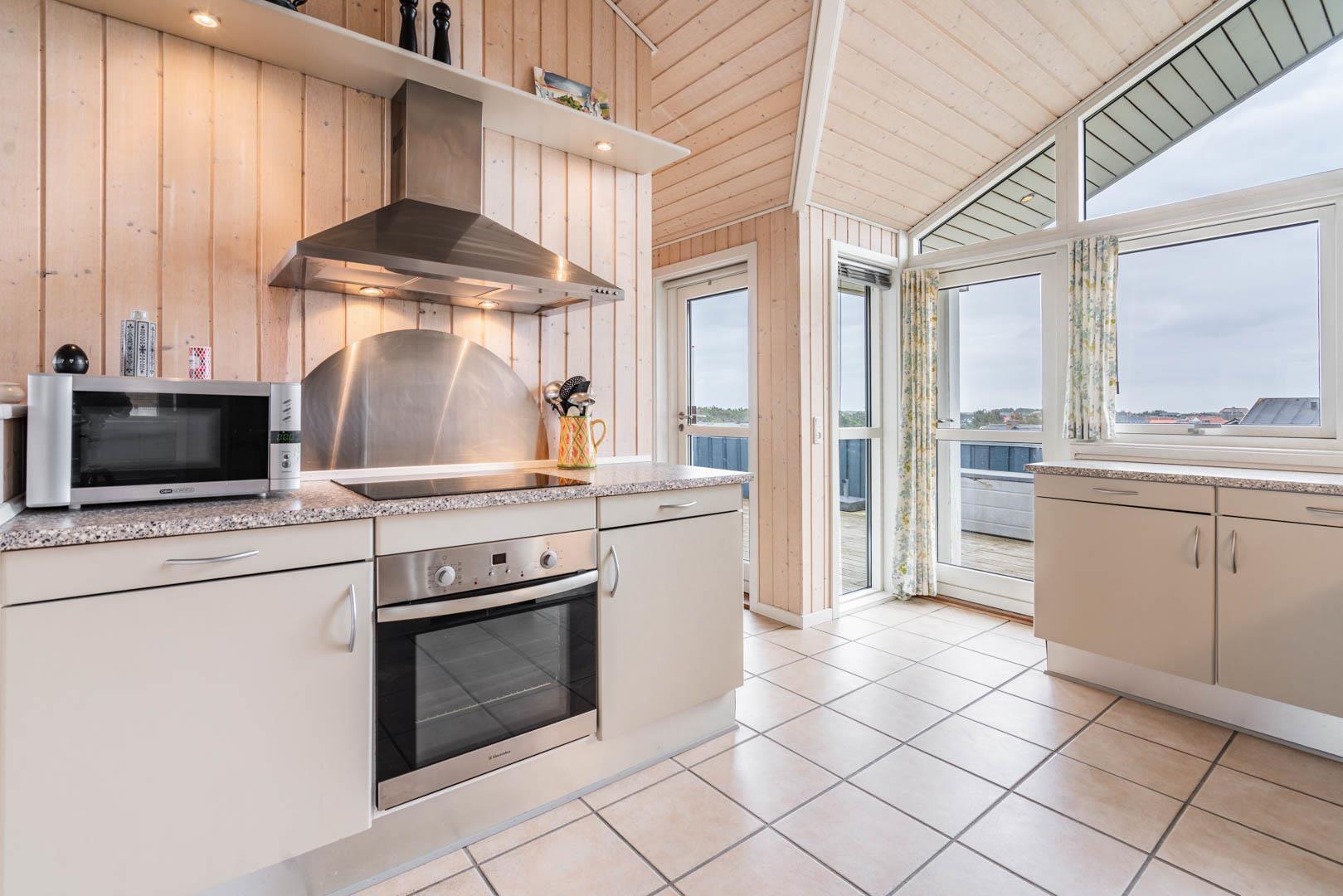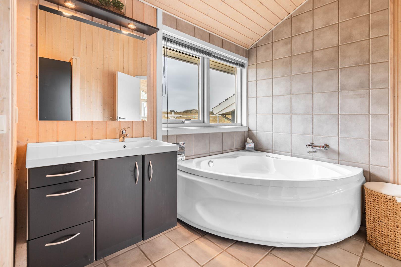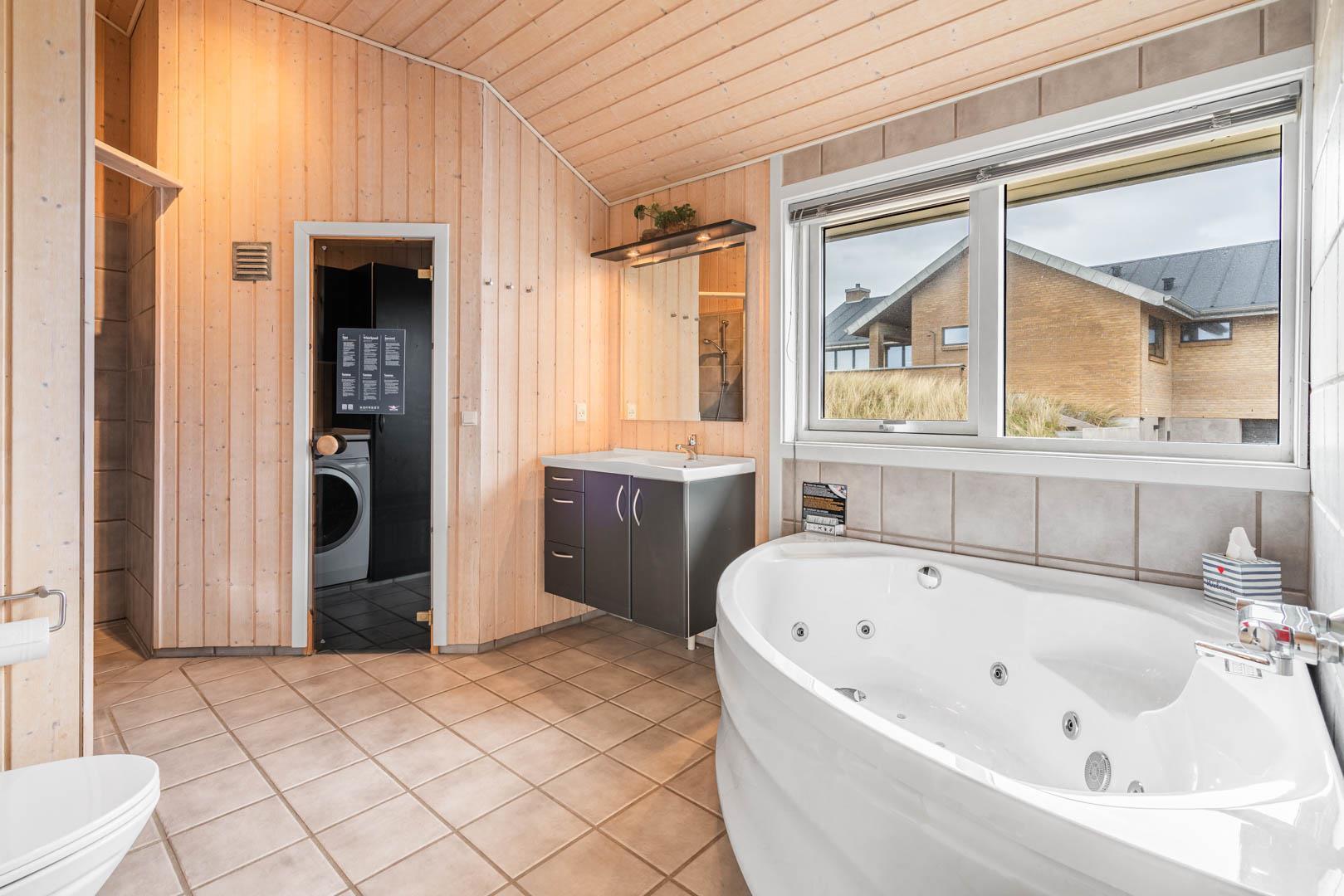 Det åbne køkken er flot og funktionelt, og huset rummer to gode badeværelser – det ene udstyret med både spa og sauna for ekstra komfort og afslapning.