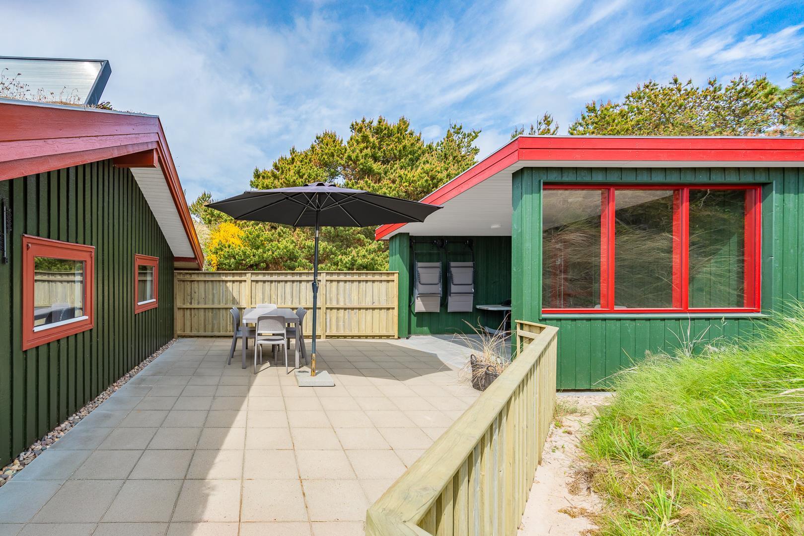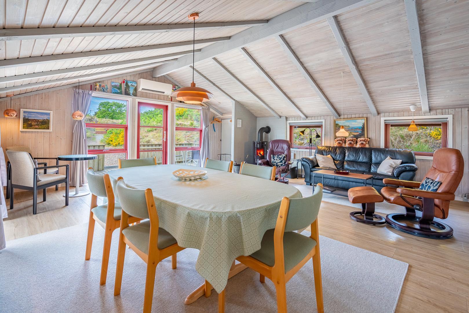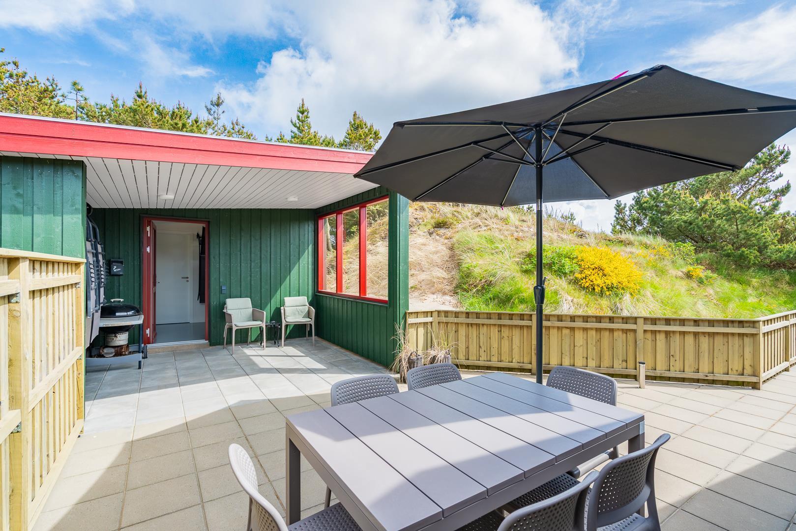 Fra den hyggelige stue er der direkte adgang til en stor, indhegnet træterrasse, som omkranser huset – ideel for dig, der har hund med på ferie. Her kan du nyde solen dagen lang, mens en overdækket terrasse giver mulighed for at nyde de lune sommeraftener.