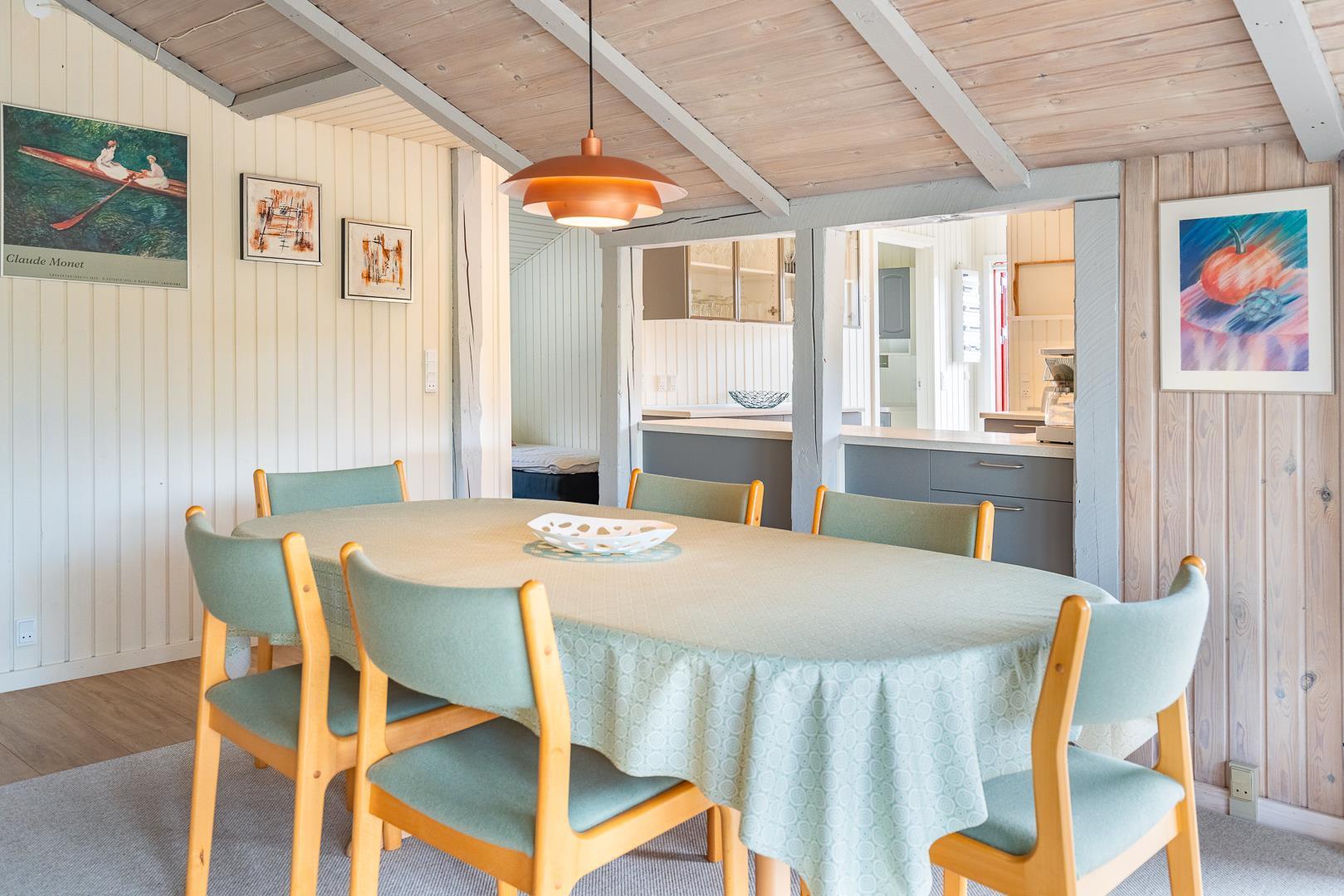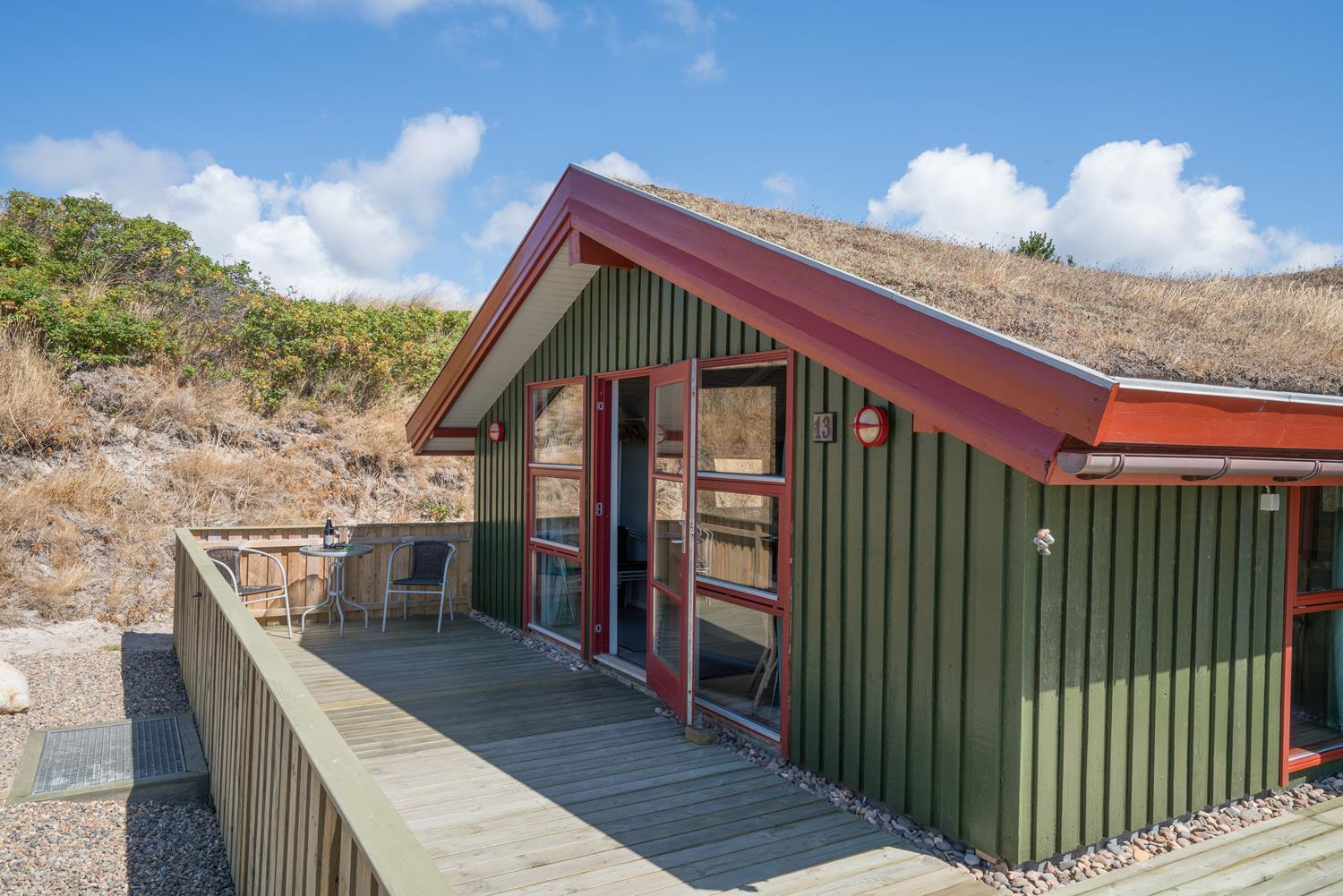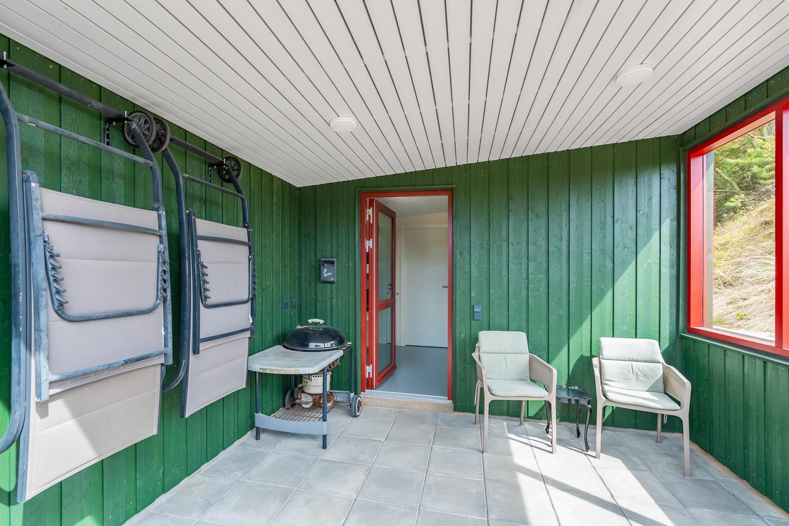 Fra den hyggelige stue er der direkte adgang til en stor, indhegnet træterrasse, som omkranser huset – ideel for dig, der har hund med på ferie. Her kan du nyde solen dagen lang, mens en overdækket terrasse giver mulighed for at nyde de lune sommeraftener.