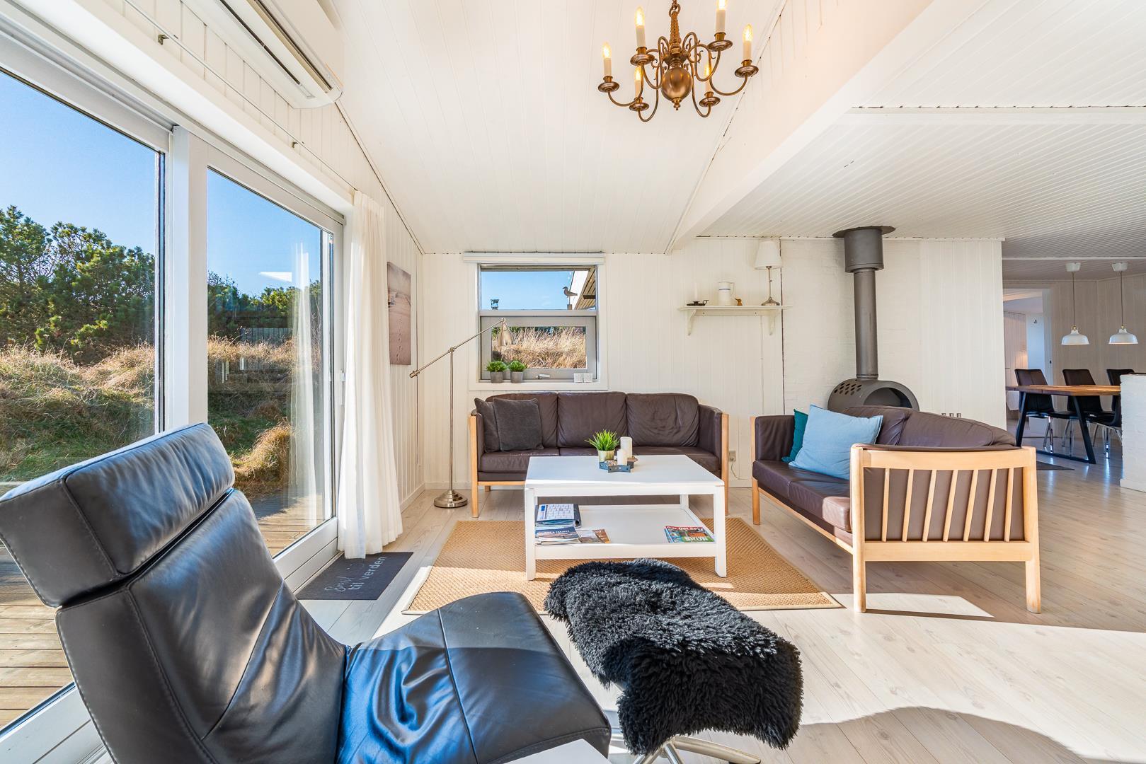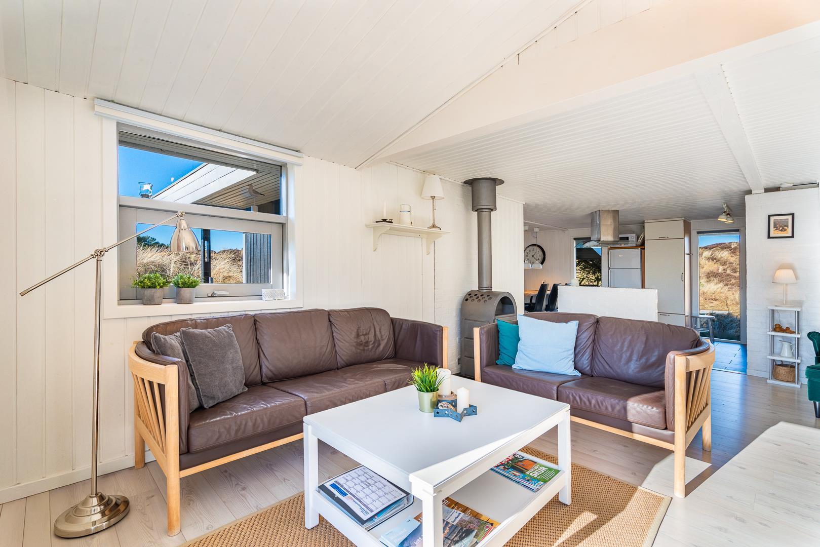Husets køkken er i åben forbindelse med huset store stue som er indrettet med komfortable møbler. Der er udgang til husets terrasse fra stuen. I stuen er der flere hyggekroge, hvor man kan trække sig tilbage med en god bog eller nyde varmen fra husets brændeovn.