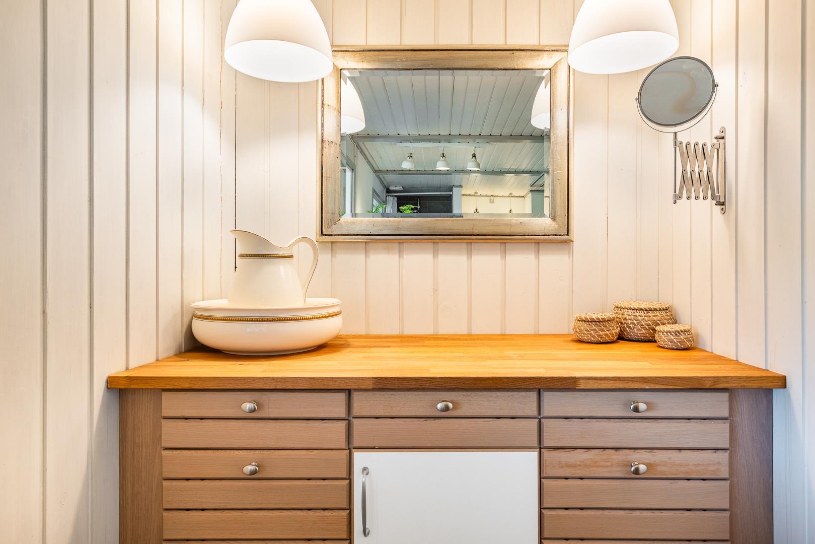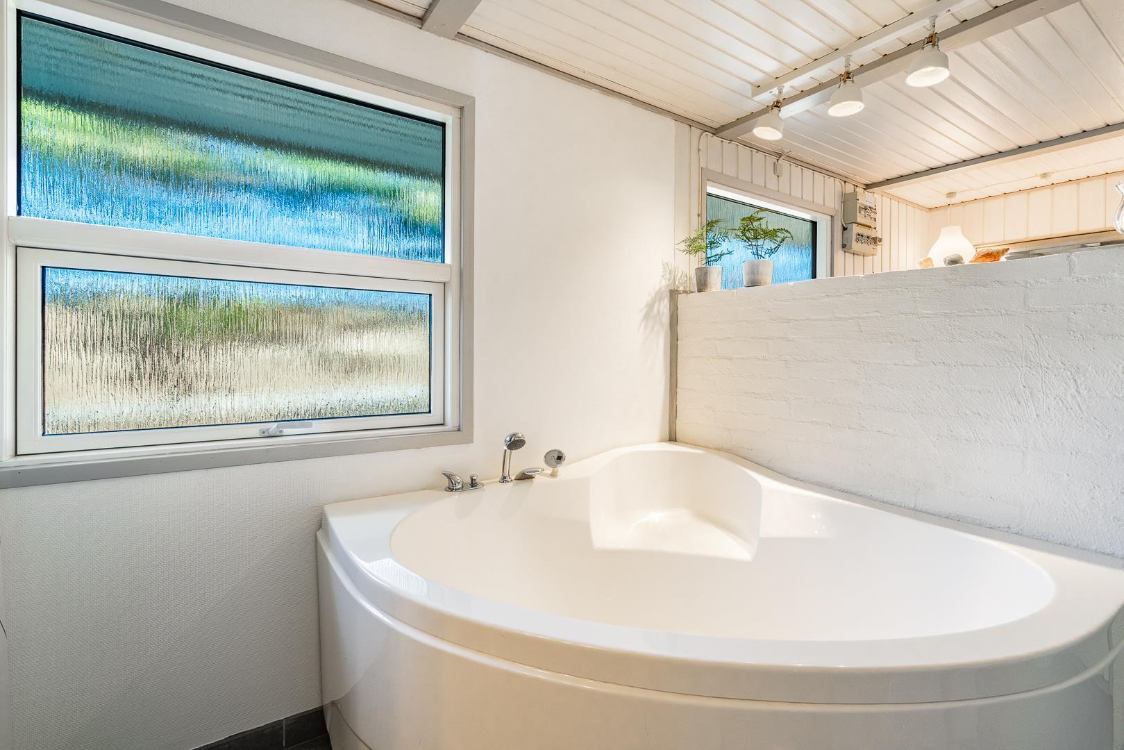 Stort badeværelse med badekar og sauna.