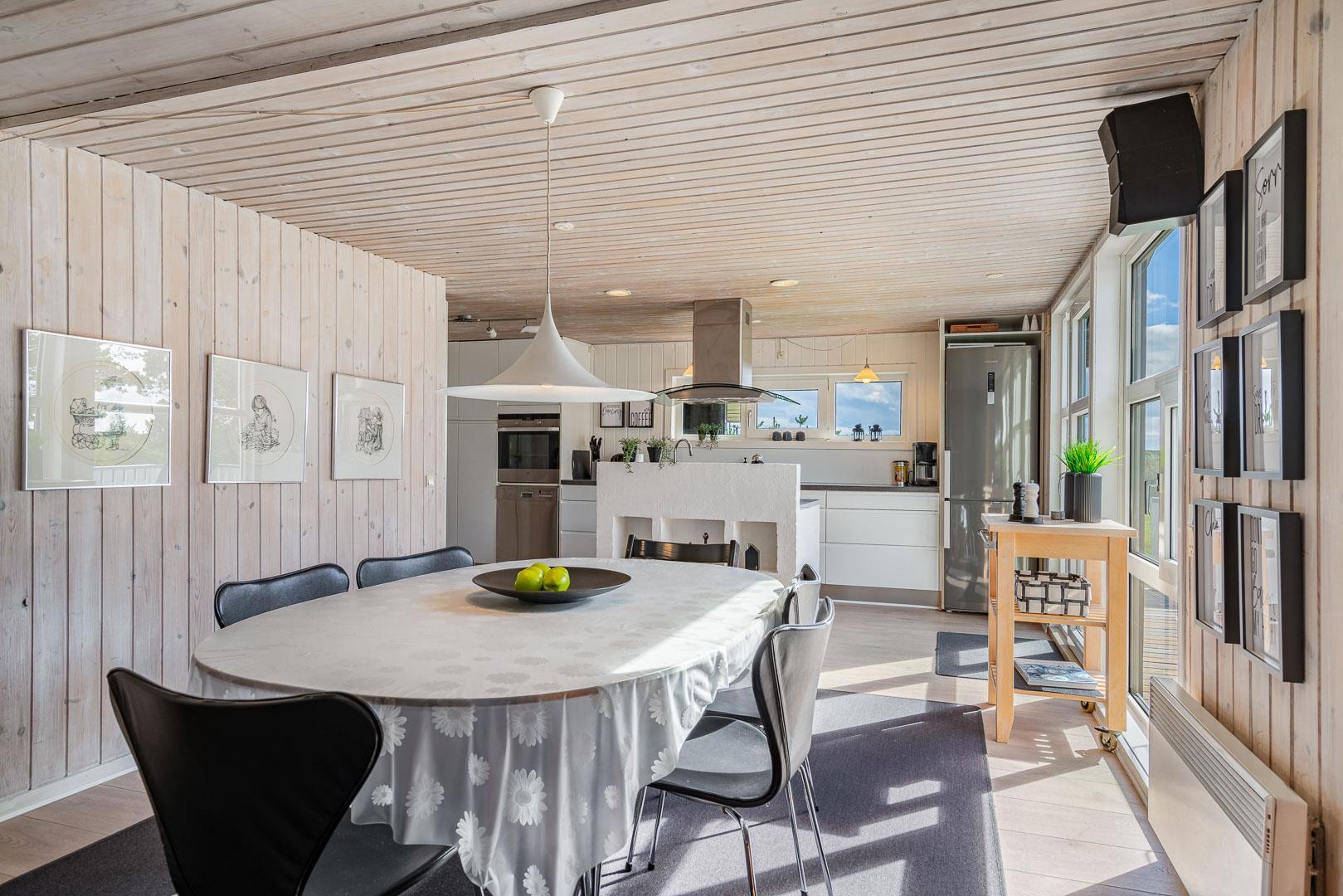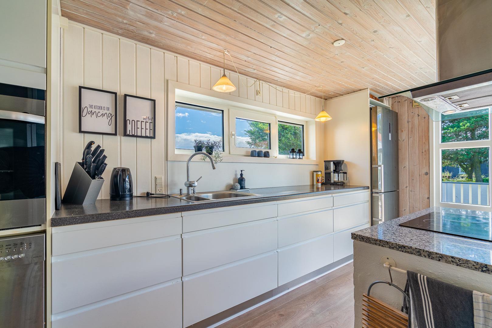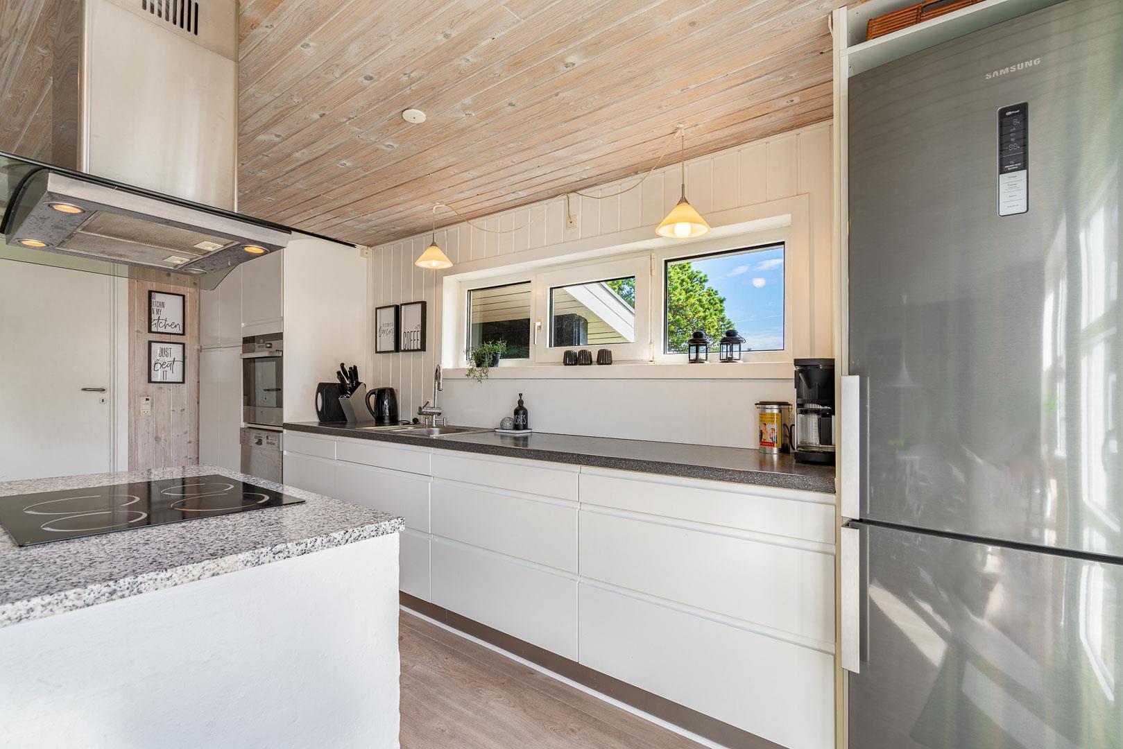 Det lækre åbne køkken, smelter sammen med stuen og danner hjertet af dette sommerhus, hvor madlavning og familieliv forenes i harmoni. Med loft til kip og store vinduespartier badet i naturligt lys, vil du opleve en følelse af rummelighed og velvære, mens du nyder udsigten til den frodige natur omkring dig. I stuen finder du også en brændeovn, der skaber hygge og varme på kølige aftener, og midt i rummet venter en stor spiseplads, hvor hele familien kan samles til gode måltider og hyggeligt samvær.