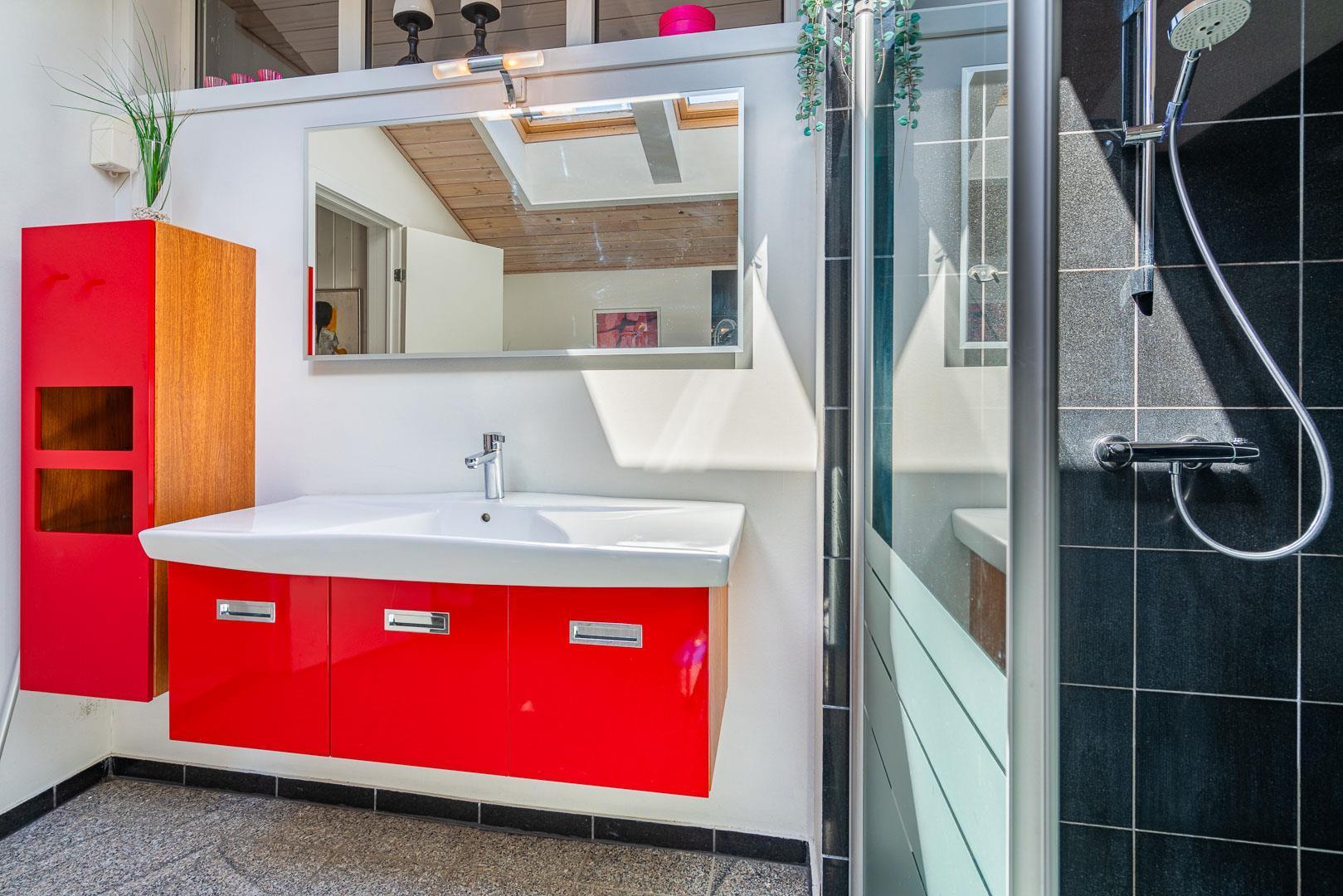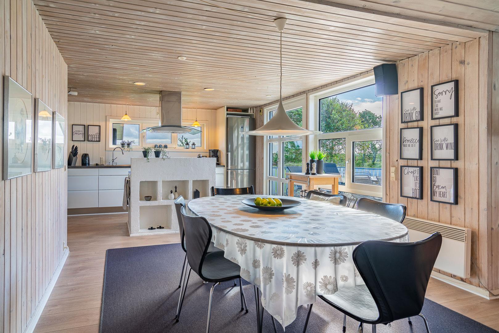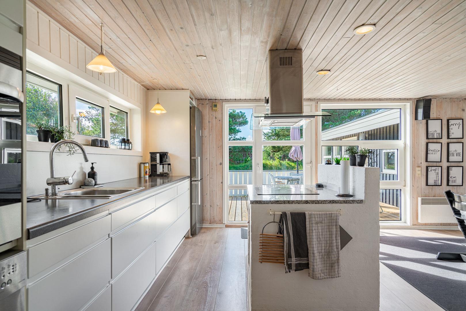 Det lækre åbne køkken, smelter sammen med stuen og danner hjertet af dette sommerhus, hvor madlavning og familieliv forenes i harmoni. Med loft til kip og store vinduespartier badet i naturligt lys, vil du opleve en følelse af rummelighed og velvære, mens du nyder udsigten til den frodige natur omkring dig. I stuen finder du også en brændeovn, der skaber hygge og varme på kølige aftener, og midt i rummet venter en stor spiseplads, hvor hele familien kan samles til gode måltider og hyggeligt samvær.