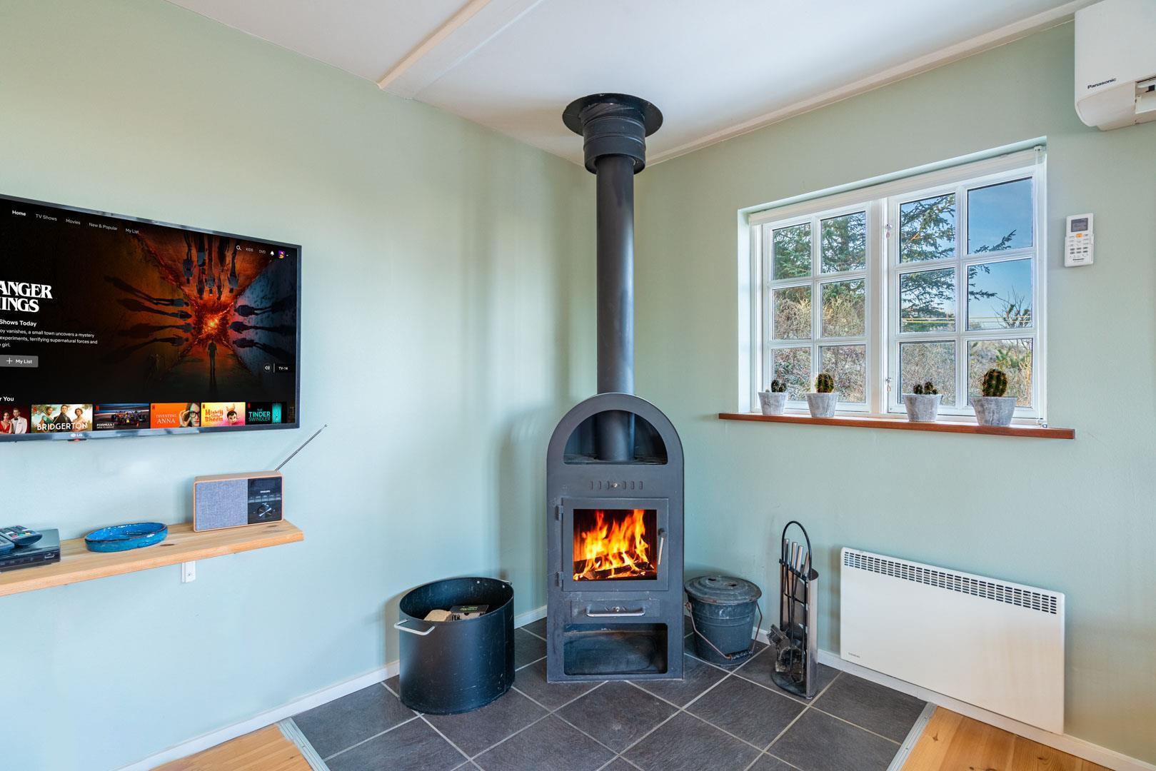 Fra stuen er der udgang til flere skønne terrasser. Brændeovnen er perfekt placeret og spreder derfor hygge og varme til hele rummet. I stueetagen finder du også begge badeværelser, hvoraf det ene er med sauna, samt et soveværelse med en dobbeltseng.