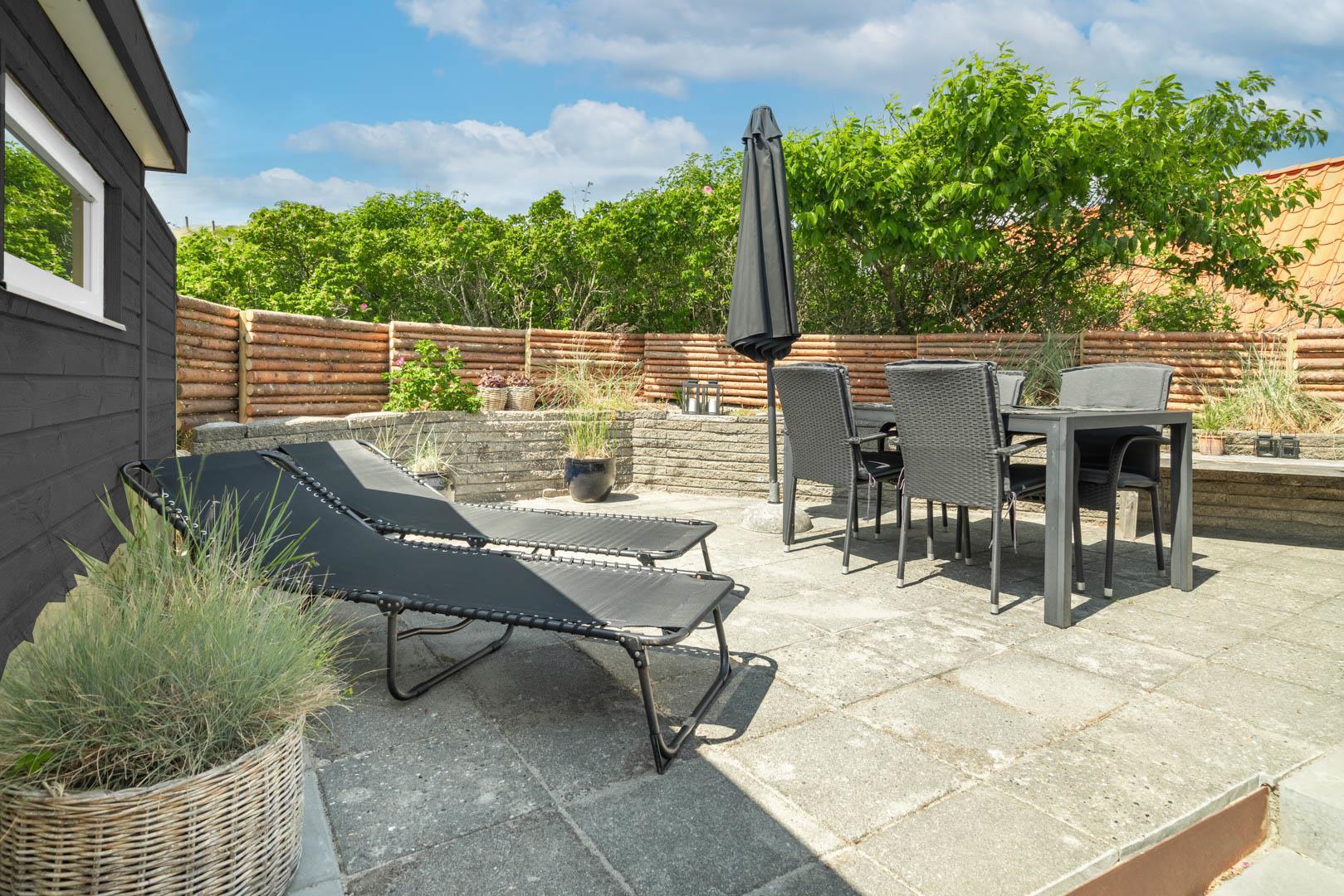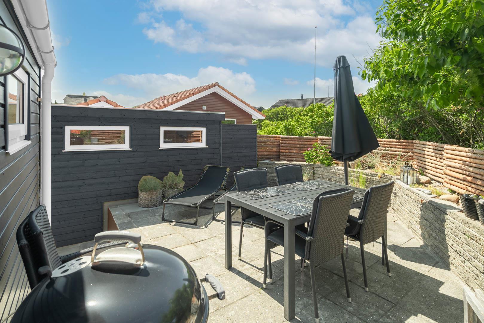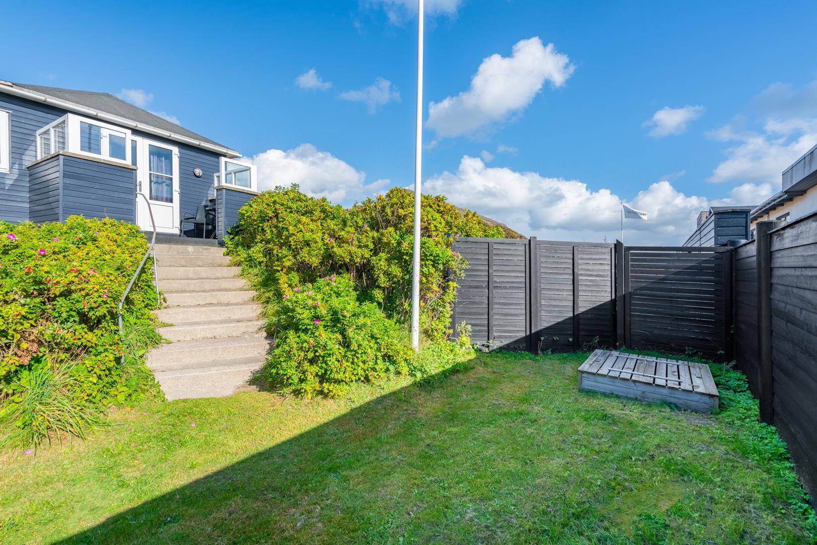 Grunden har en lille græsplæne omkranset af Rosa Rogusa. Der er to hyggelige terrasser, en vestvendt gårdhave og en terrasse mod øst til morgensolen. Her er der Havemøbler og webergrill til fri afbenyttelse.