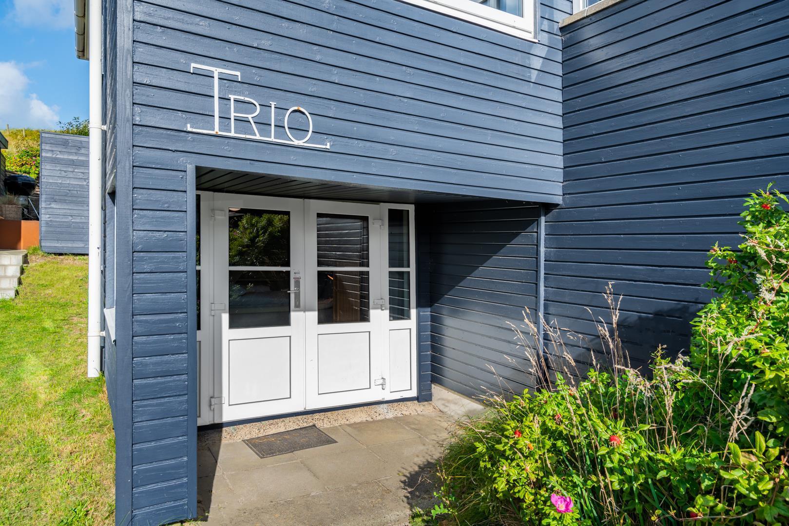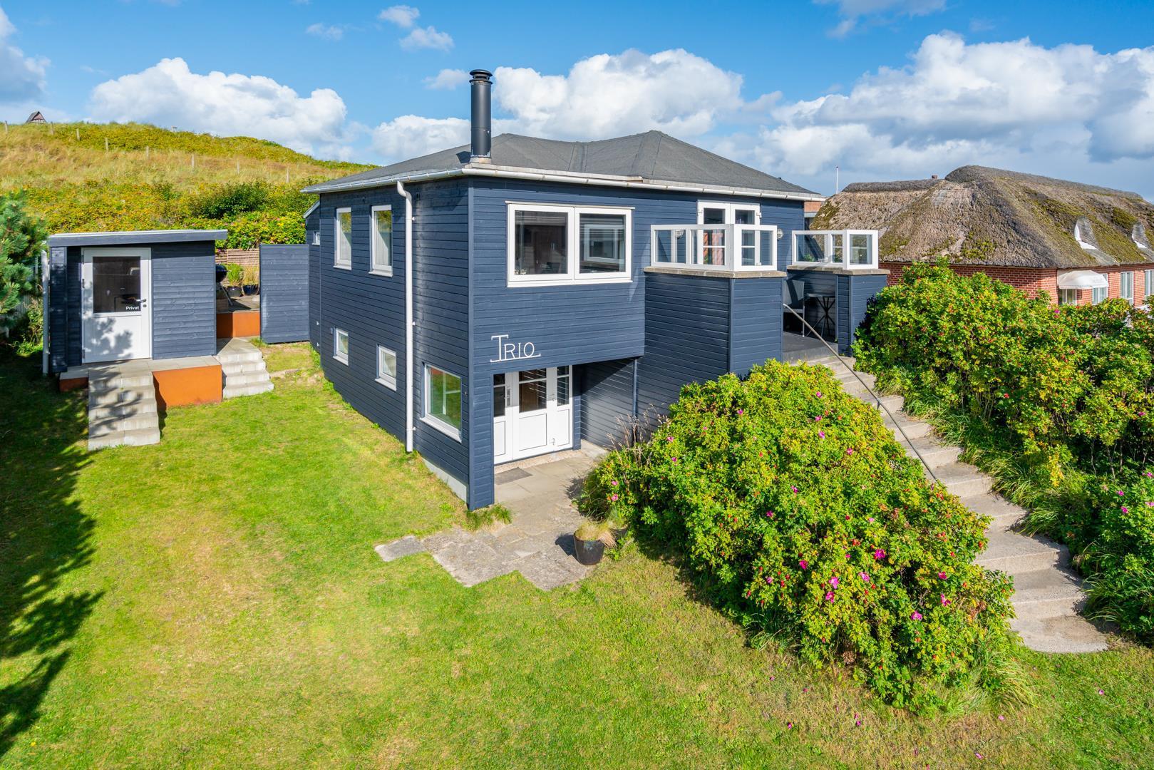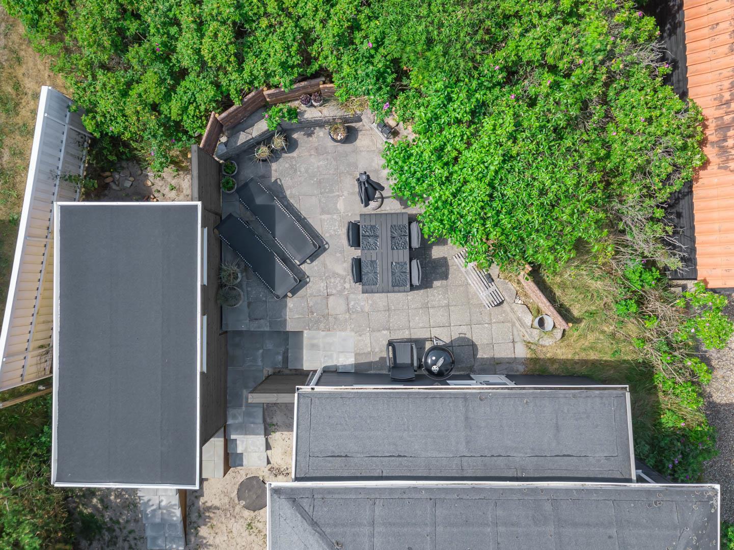 Grunden har en lille græsplæne omkranset af Rosa Rogusa. Der er to hyggelige terrasser, en vestvendt gårdhave og en terrasse mod øst til morgensolen. Her er der Havemøbler og webergrill til fri afbenyttelse.