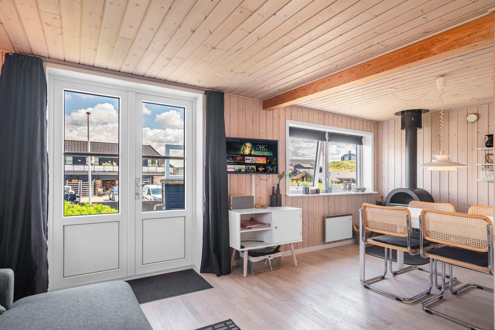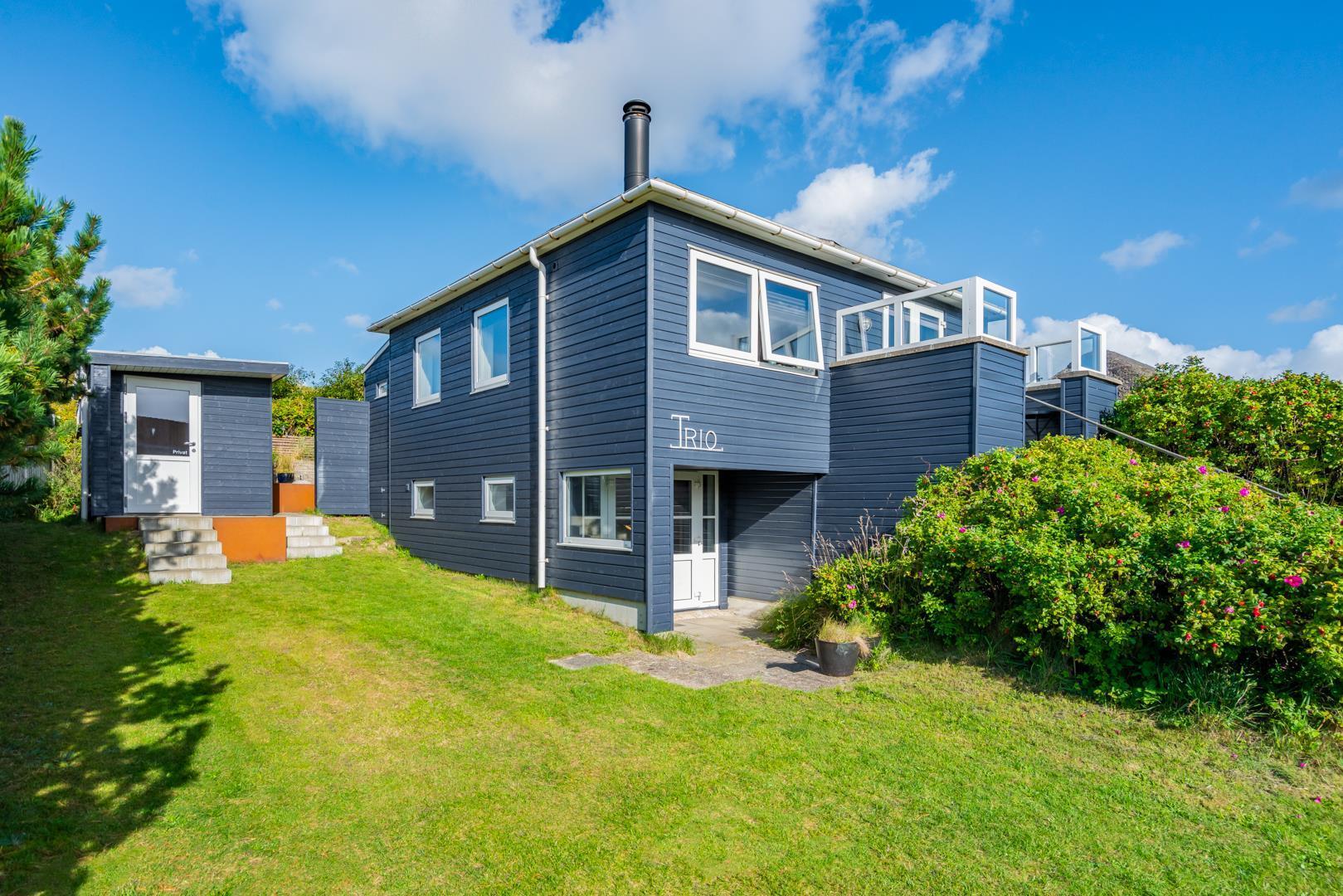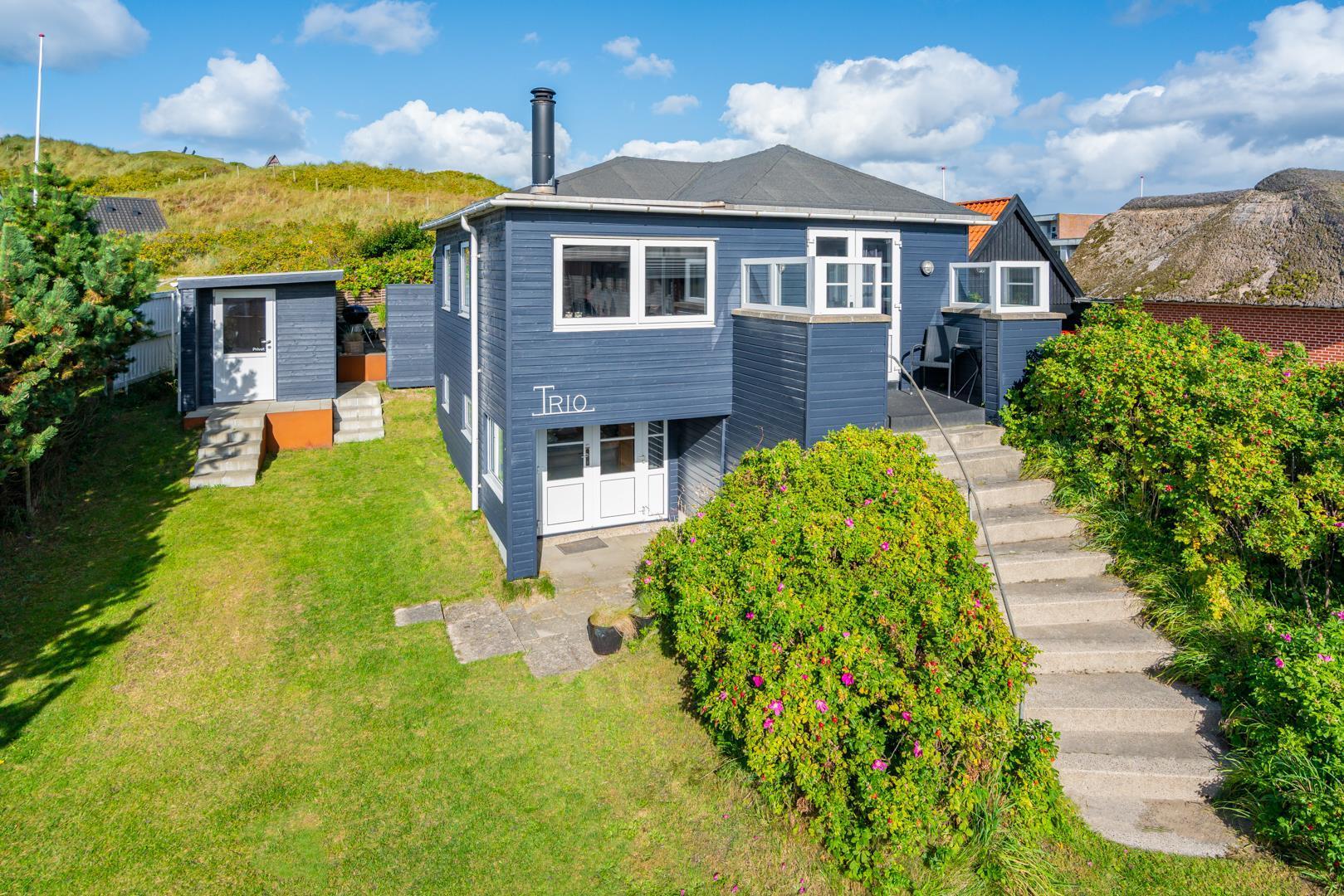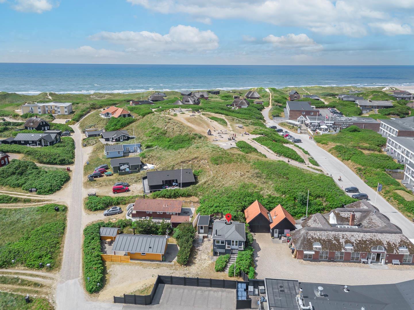 En charmerende perle, centralt beliggende i Henne Strand. Sommerhuset fremstår overalt lyst og venligt. Huset er indrettet med køkken- alrum, stue med brændeovn, bad og soverum i 1. plan.Fra stuen skøn udsigt over klitter og Henne Strand. I underetagen er der et soveværelse med udgang til terrasse. Der er mulighed for opkobling til Chromecast, desuden er der en bluetooth højtaler til rådighed.