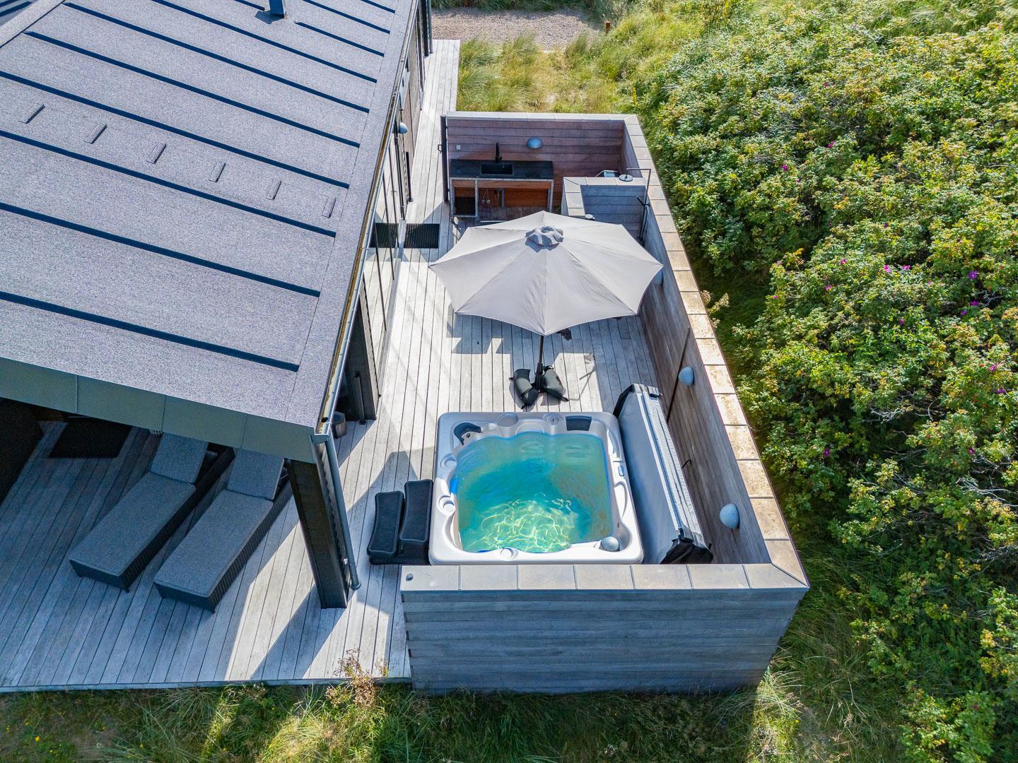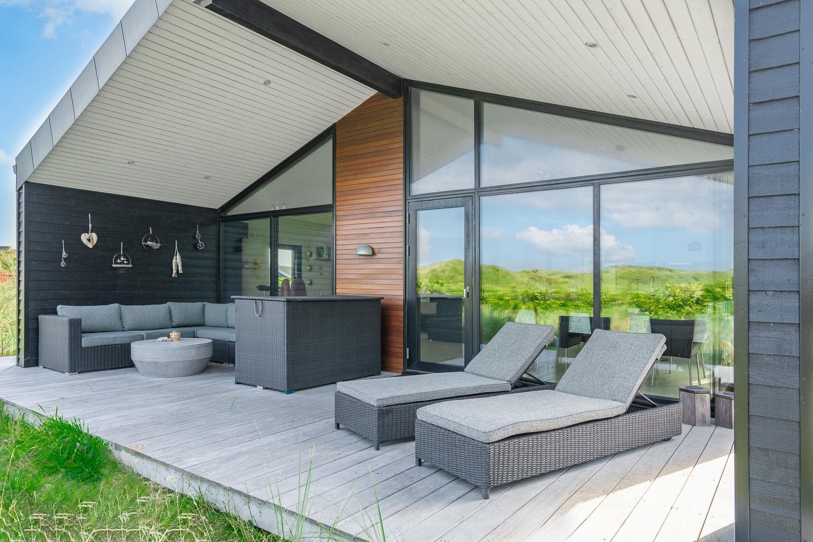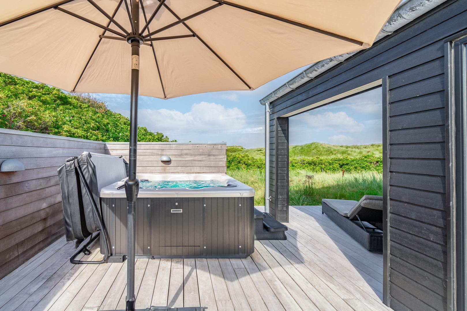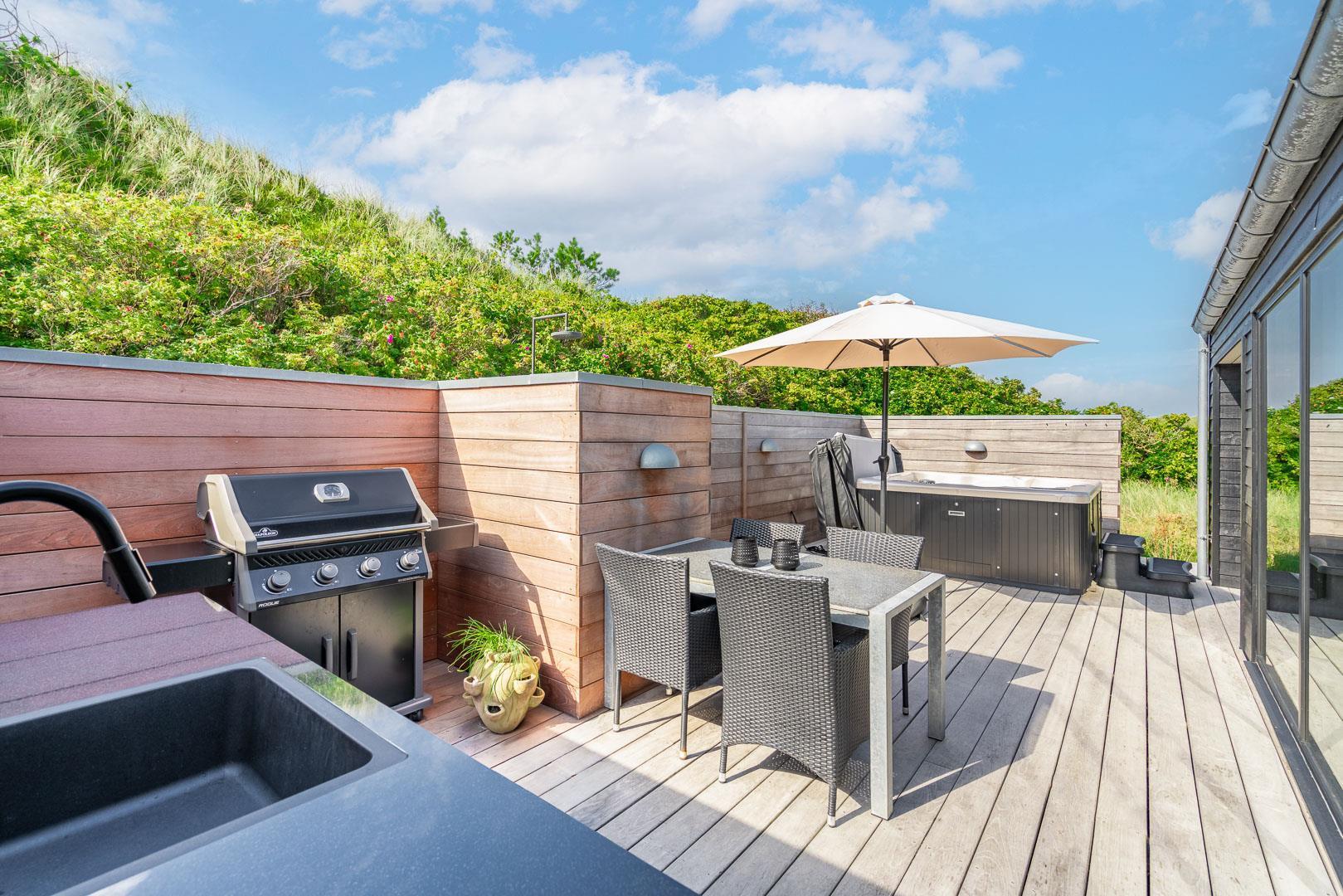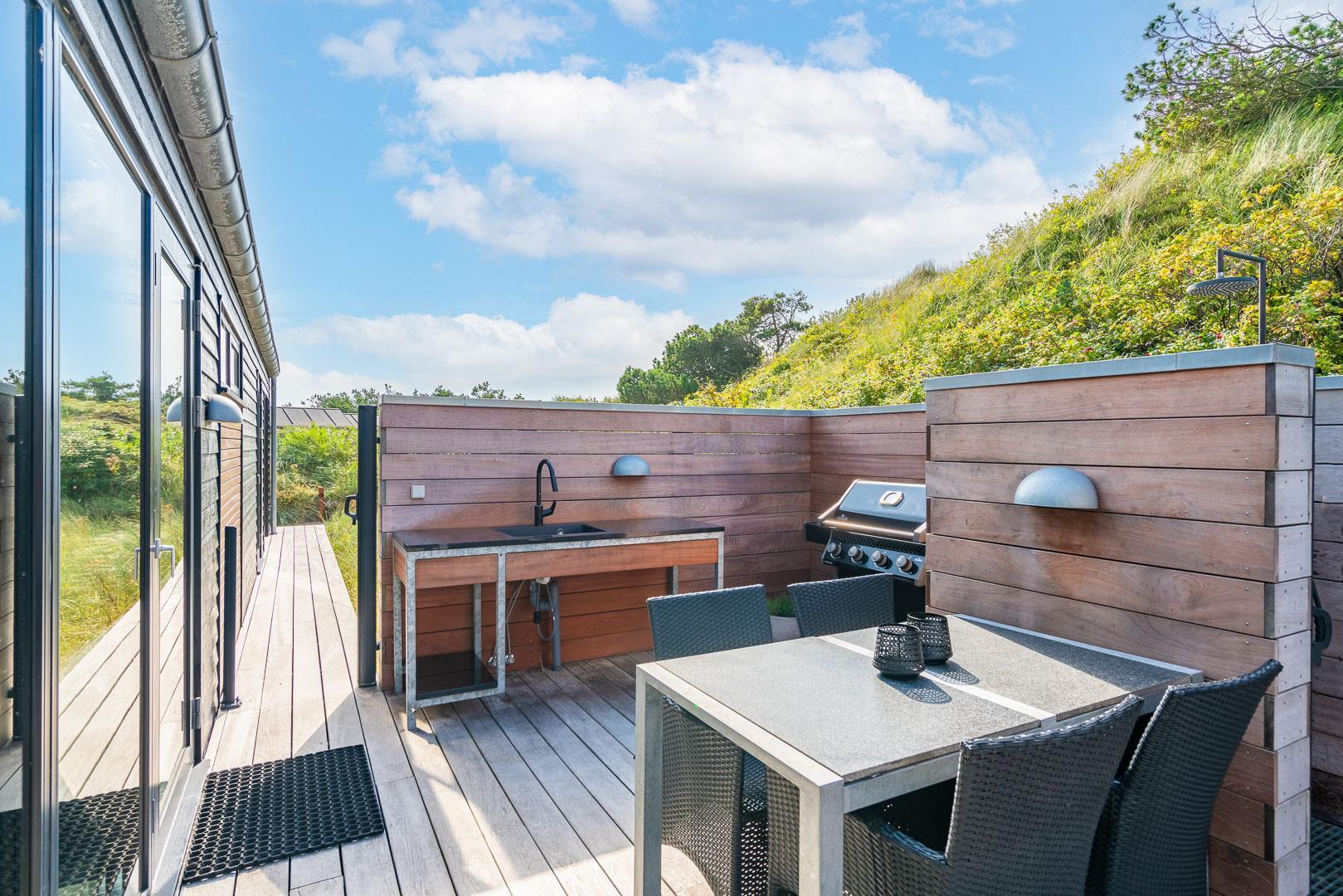 Det sorte træhus prydes af en skøn og delvist overdækket terrasse med en gode lækroge, perfekt til at nyde solrige dage og milde sommeraftener. Her finder du også en skøn udespa, udebruser og udekøkken, der fuldender udendørsoplevelsen. (Bemærk: Vandet til udekøkkenet og udebruseren er lukket fra uge 44 til uge 18).