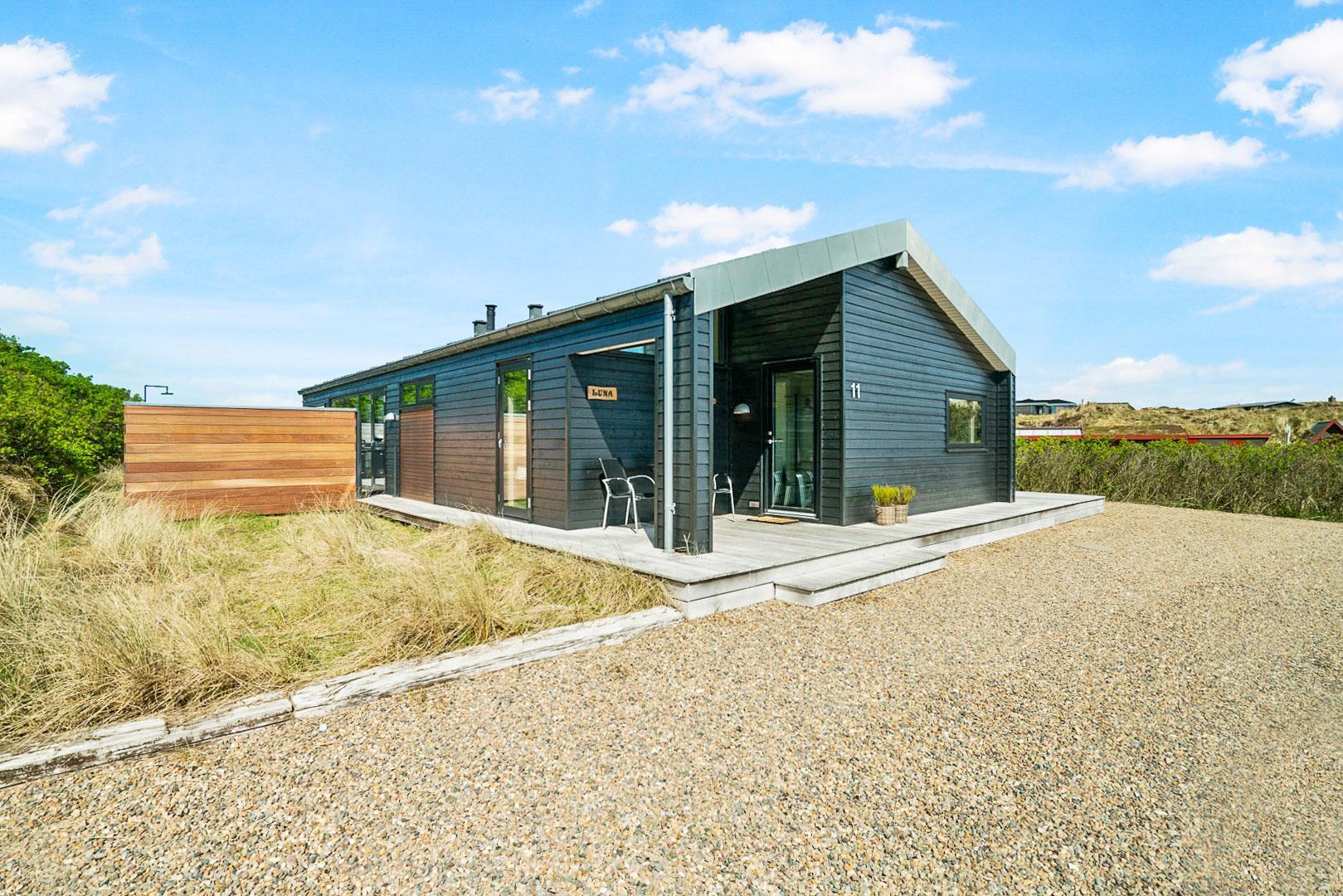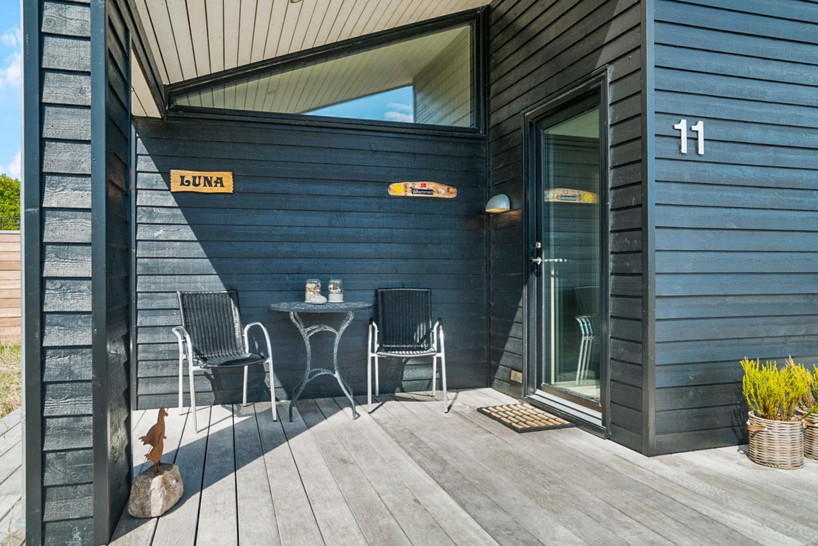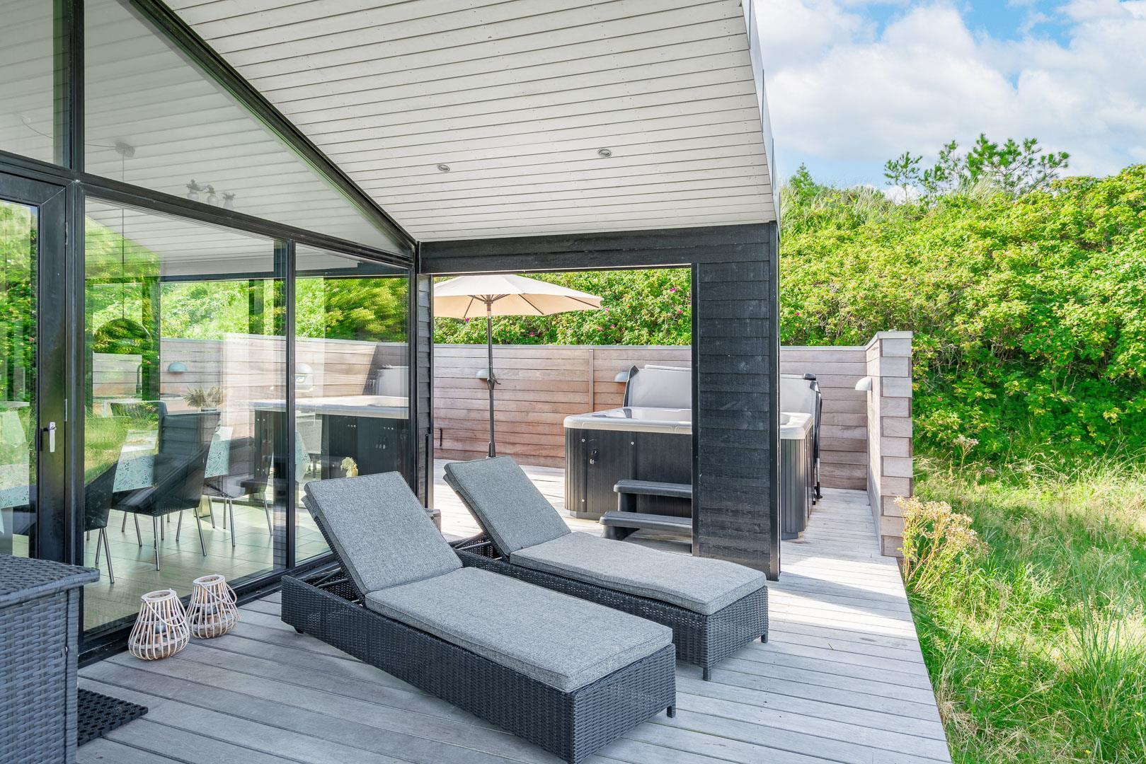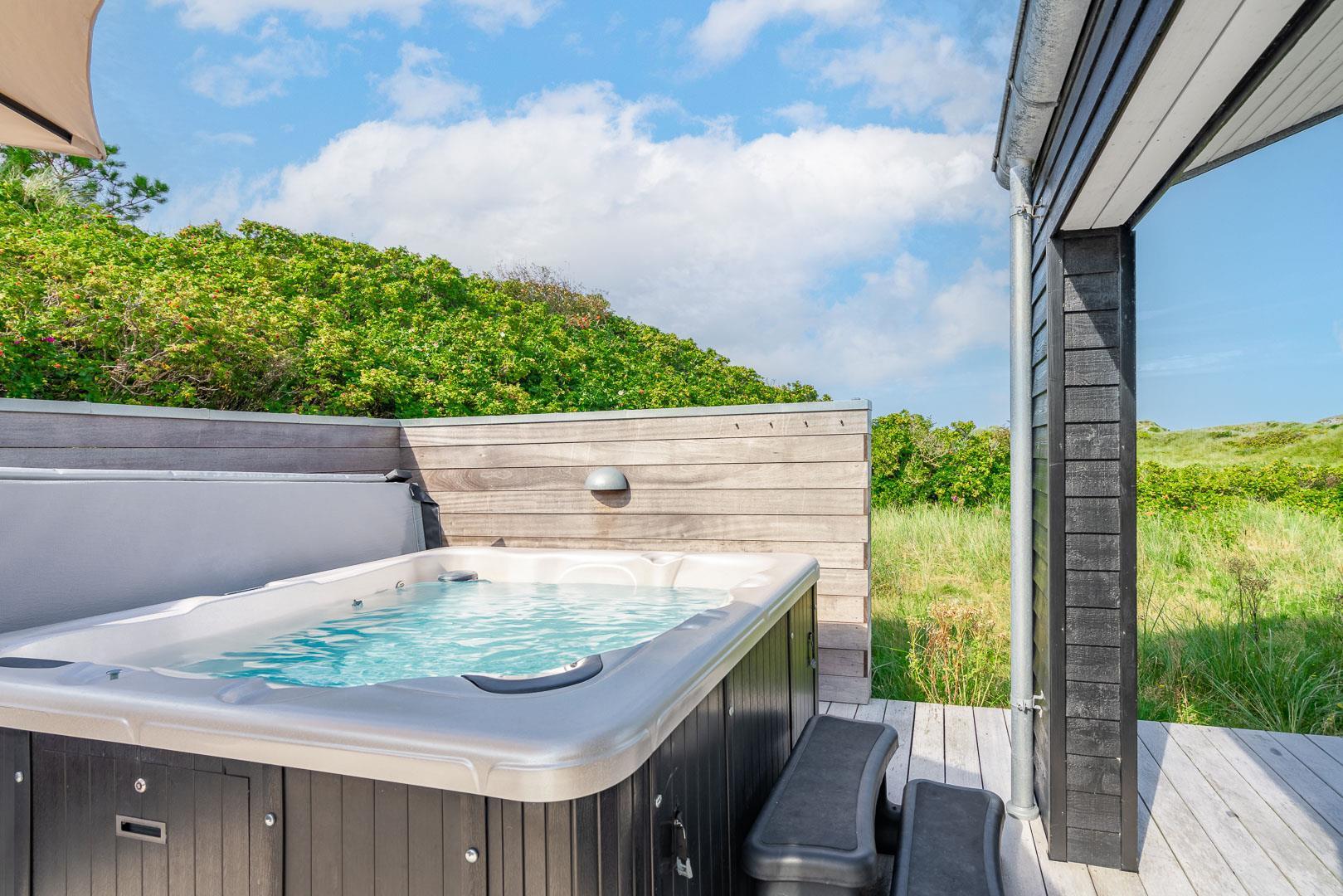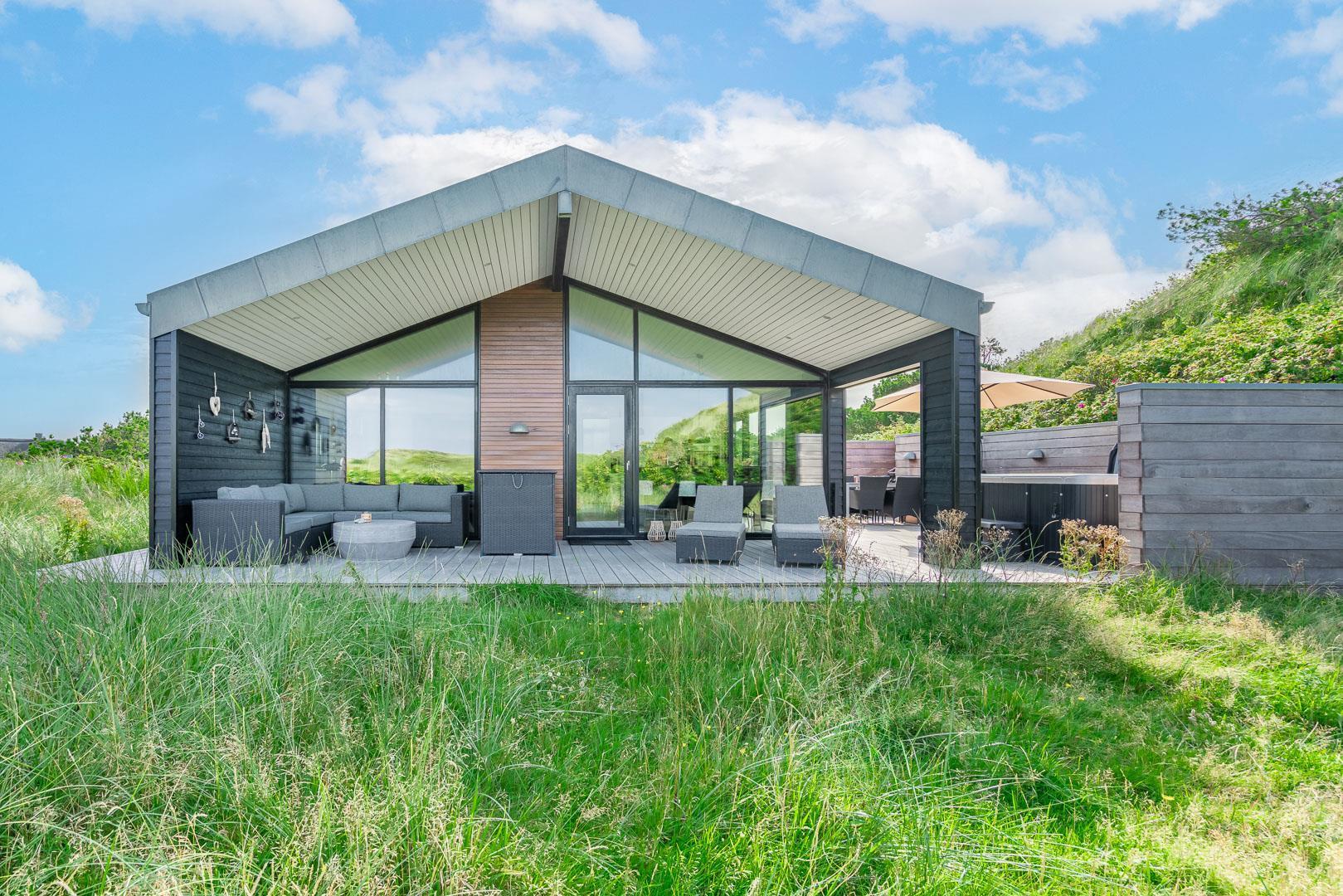 Det sorte træhus prydes af en skøn og delvist overdækket terrasse med en gode lækroge, perfekt til at nyde solrige dage og milde sommeraftener. Her finder du også en skøn udespa, udebruser og udekøkken, der fuldender udendørsoplevelsen. (Bemærk: Vandet til udekøkkenet og udebruseren er lukket fra uge 44 til uge 18).