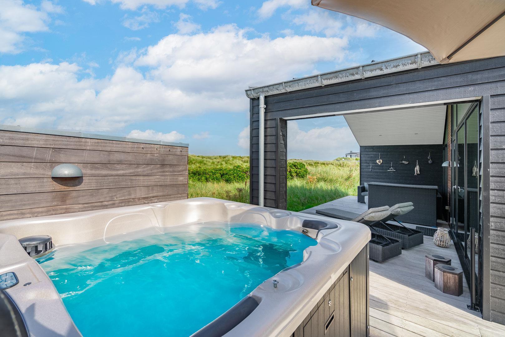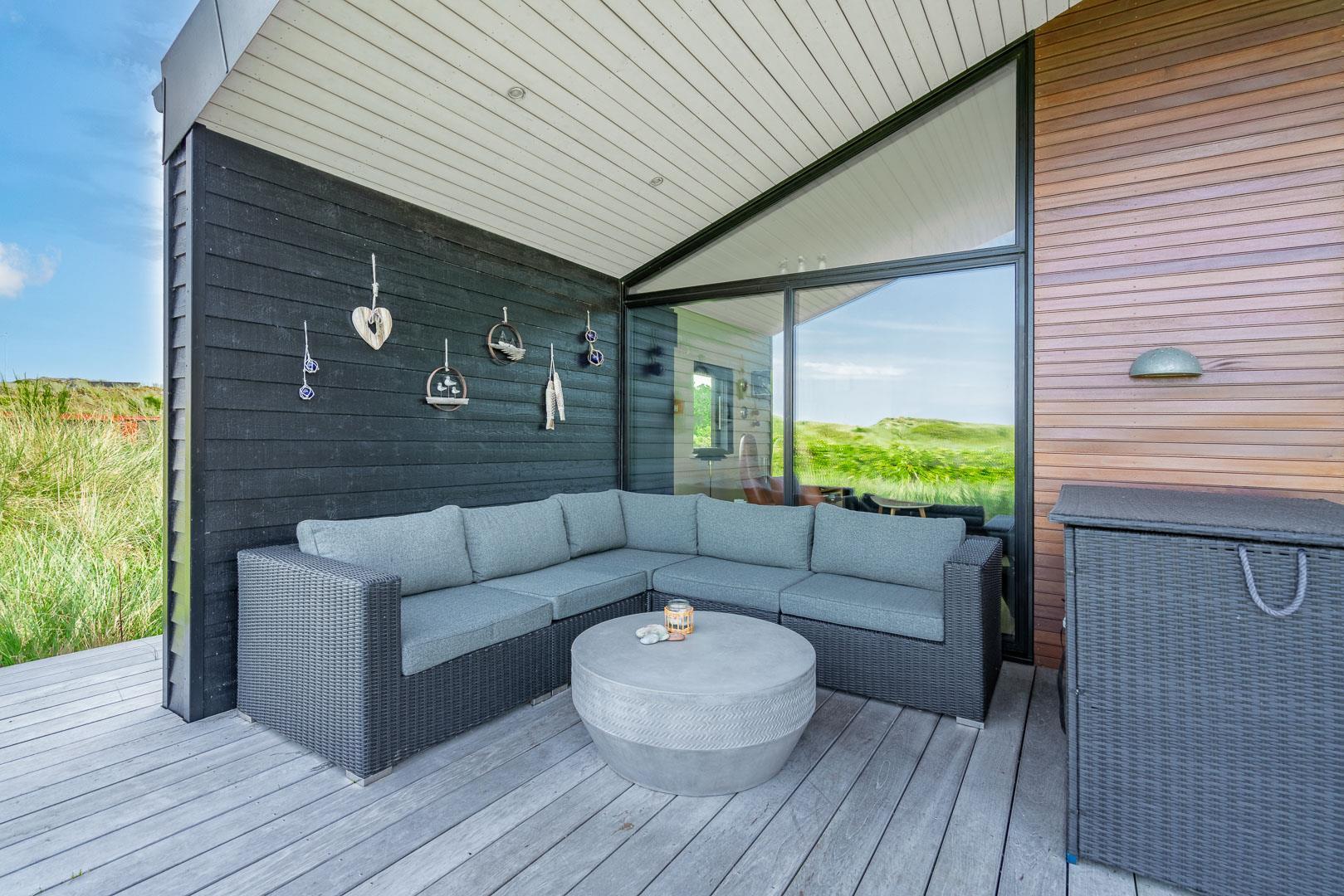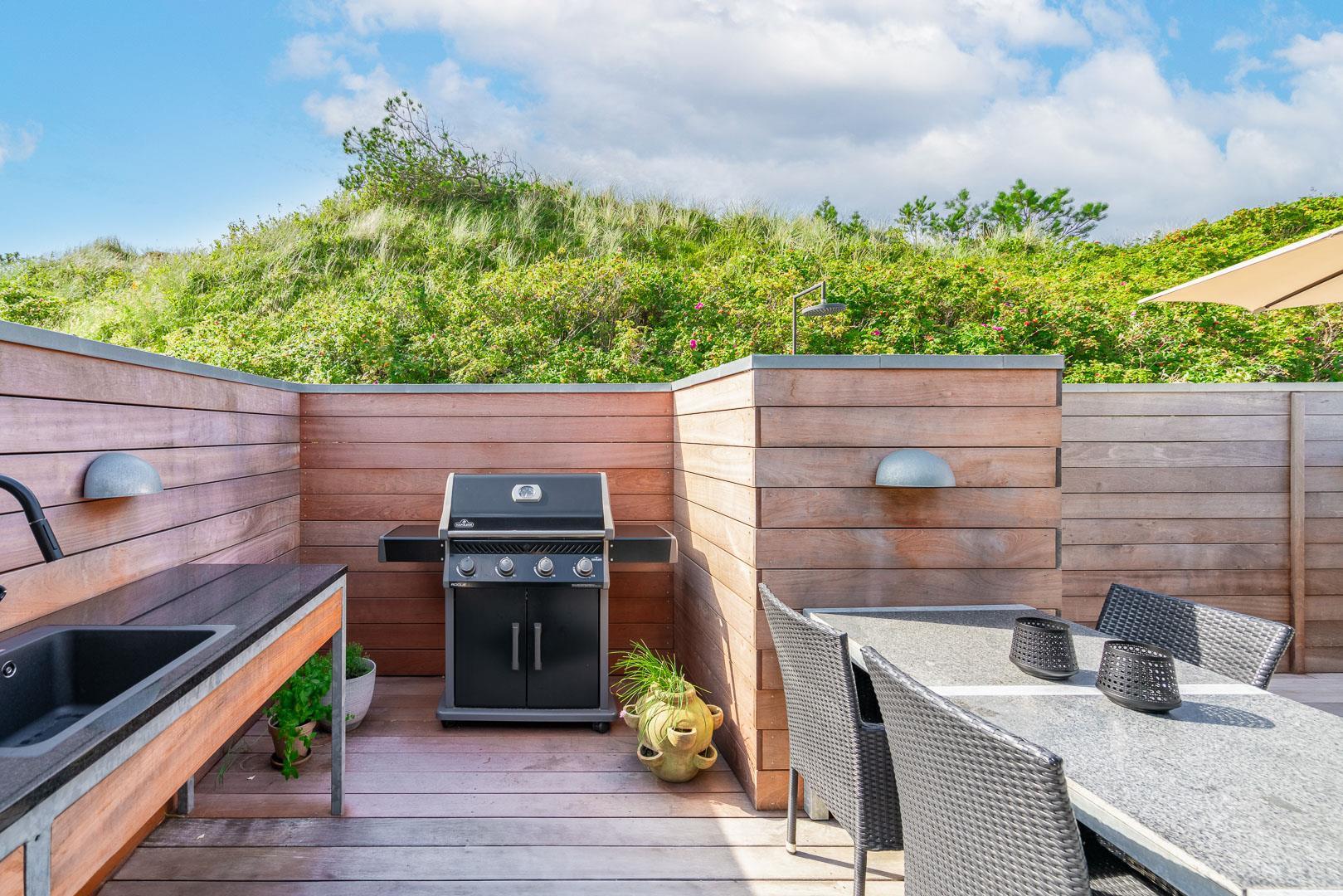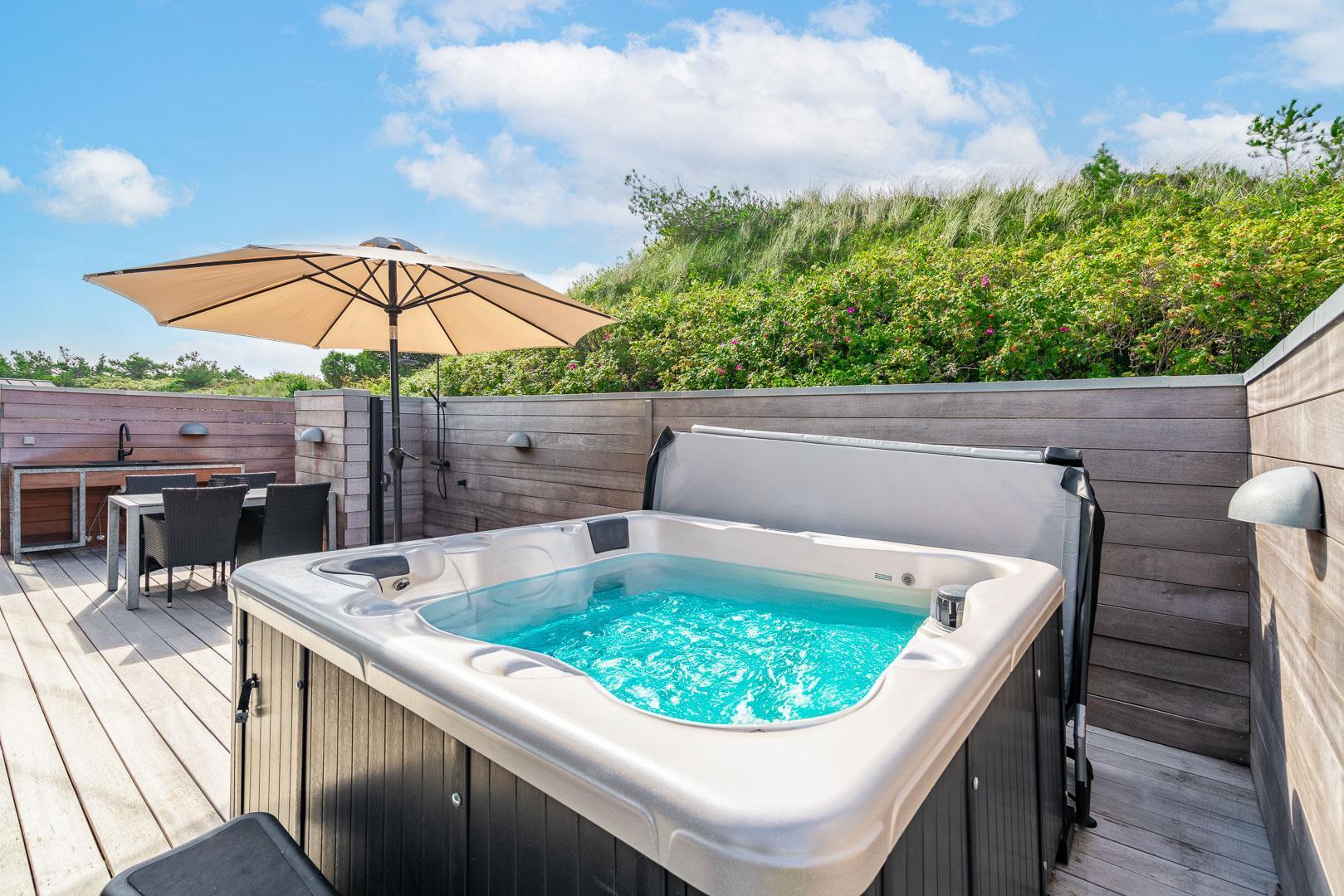 Det sorte træhus prydes af en skøn og delvist overdækket terrasse med en gode lækroge, perfekt til at nyde solrige dage og milde sommeraftener. Her finder du også en skøn udespa, udebruser og udekøkken, der fuldender udendørsoplevelsen. (Bemærk: Vandet til udekøkkenet og udebruseren er lukket fra uge 44 til uge 18).