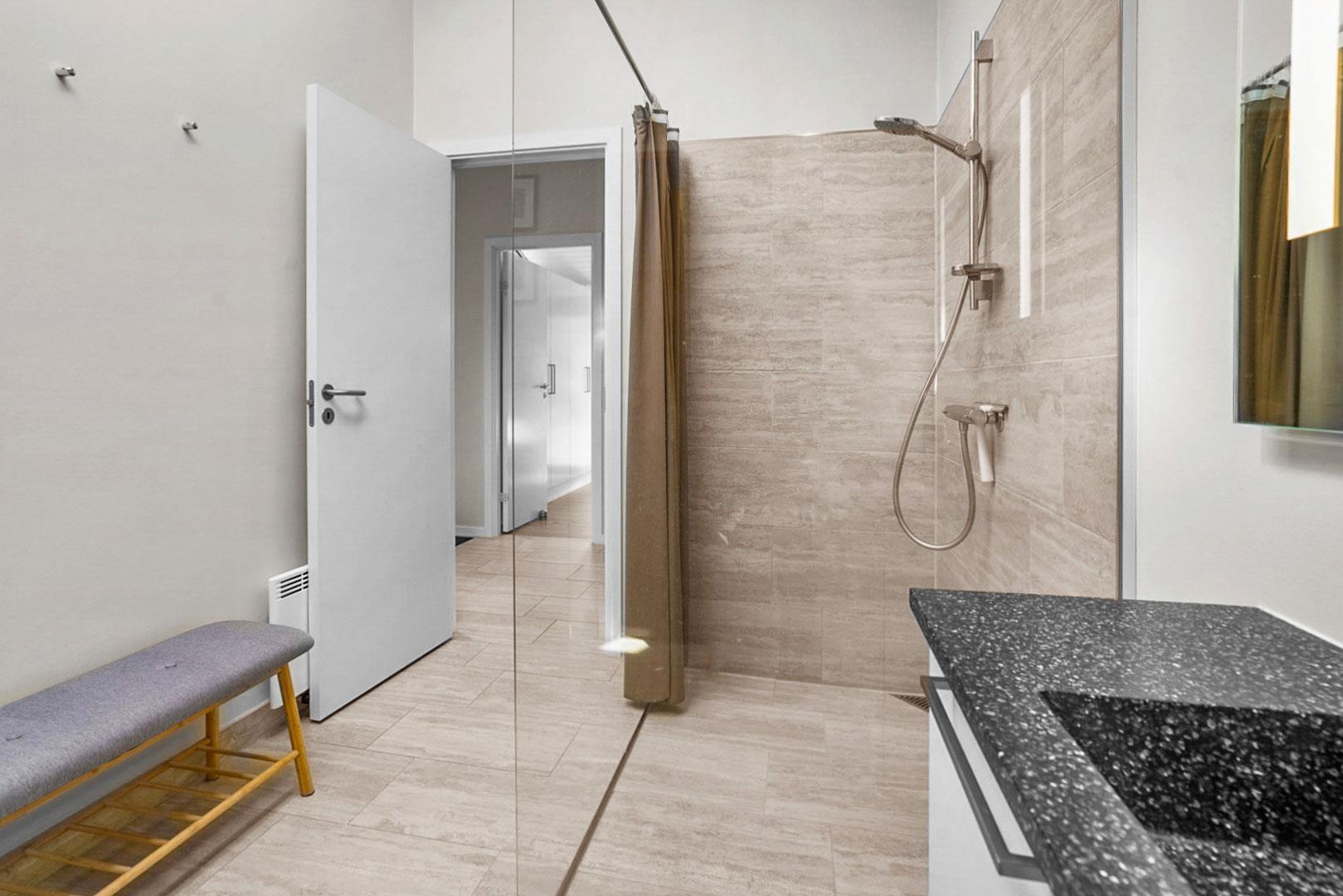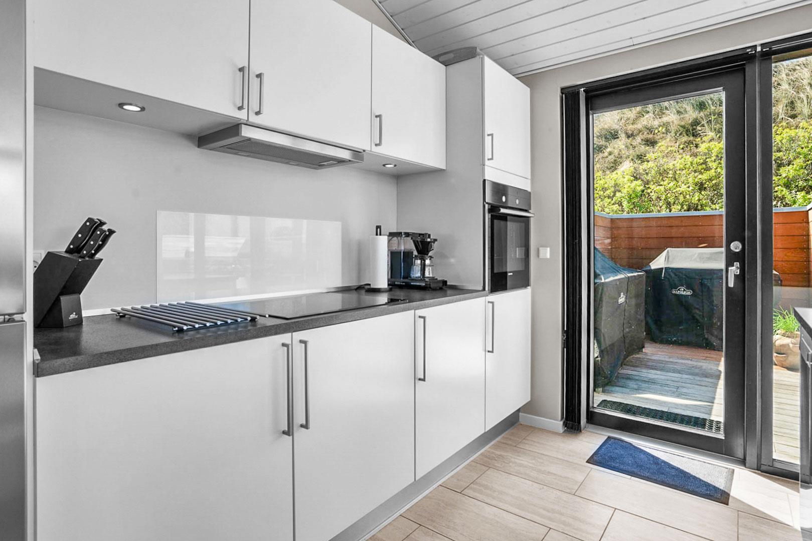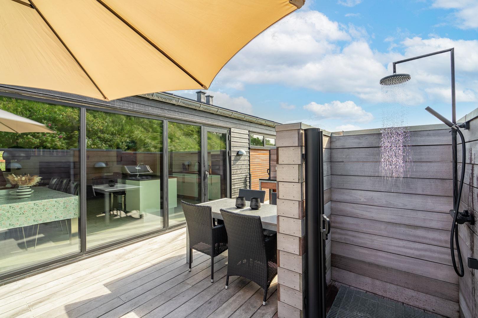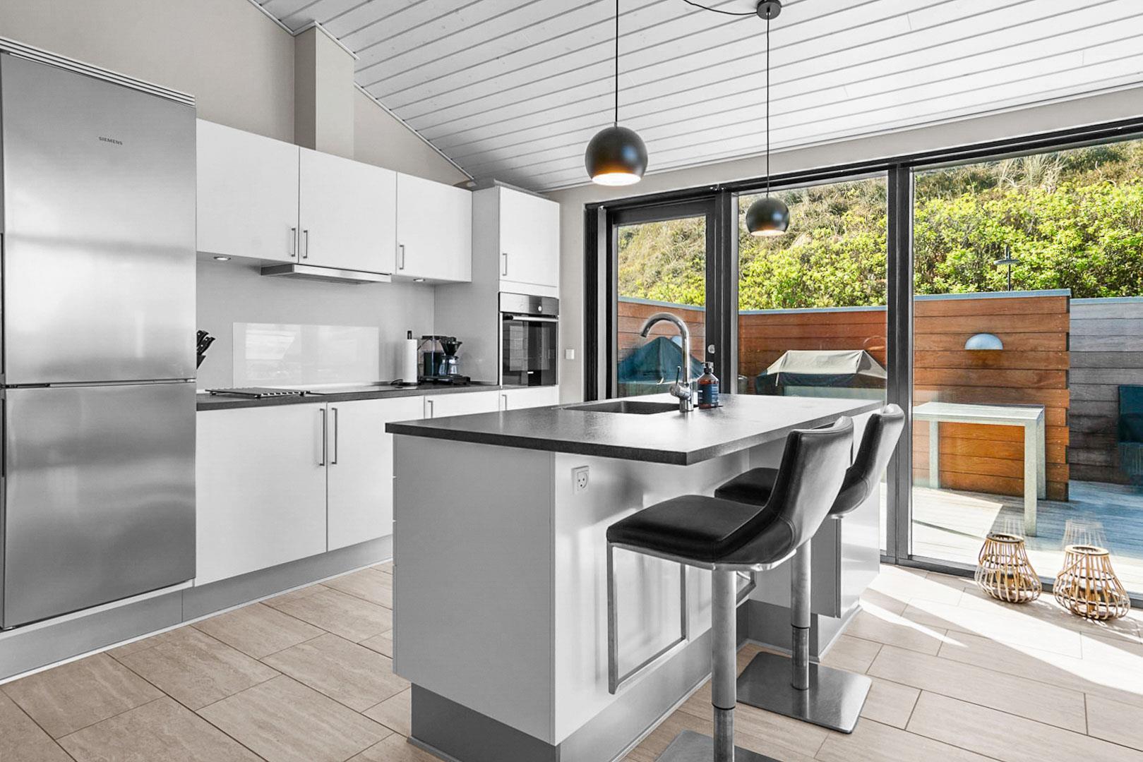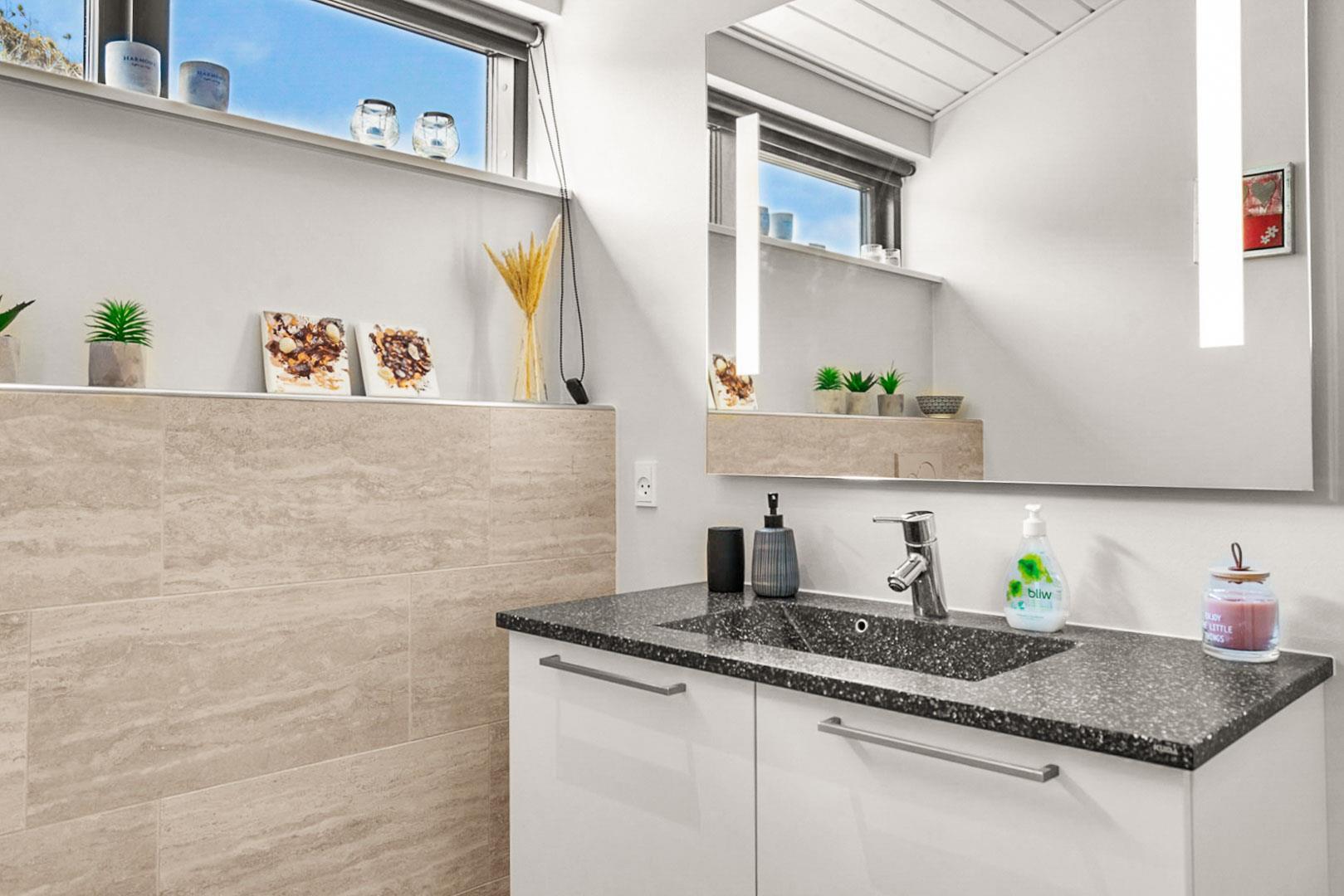 Det sorte træhus prydes af en skøn og delvist overdækket terrasse med en gode lækroge, perfekt til at nyde solrige dage og milde sommeraftener. Her finder du også en skøn udespa, udebruser og udekøkken, der fuldender udendørsoplevelsen. (Bemærk: Vandet til udekøkkenet og udebruseren er lukket fra uge 44 til uge 18).