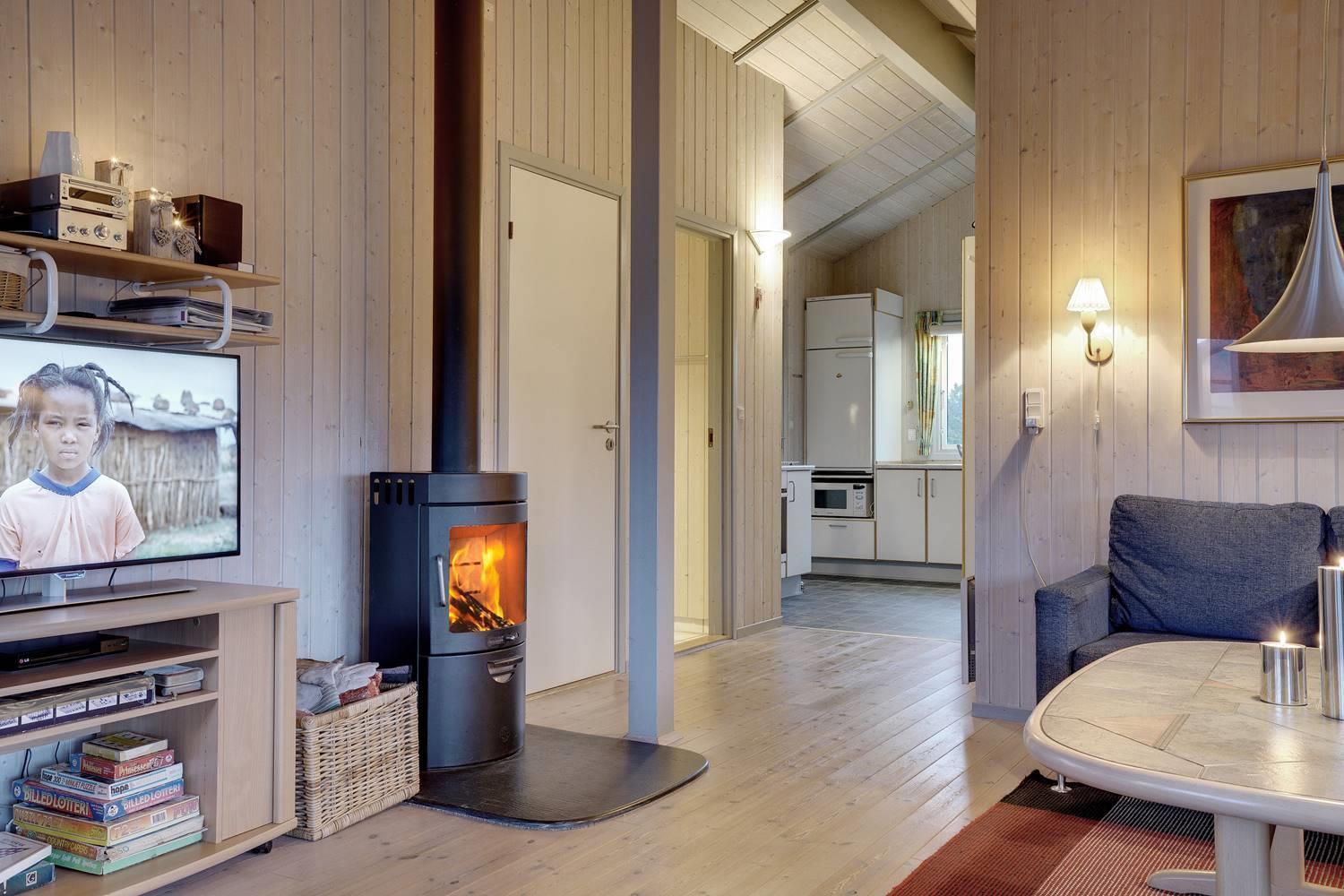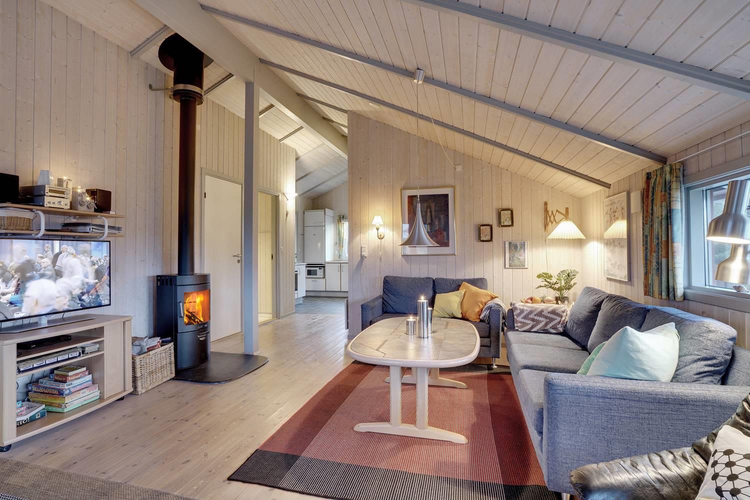 Husets hjerte er den hyggelige stue med brændeovn, der skaber varme og stemning på kølige aftener. Herfra er der direkte adgang til de store træterrasser – delvist overdækkede – hvor man kan nyde kaffen om morgenen eller aftensolen over klitlandskabet. Terrasserne er perfekte til afslapning, grillhygge og samvær i det fri.