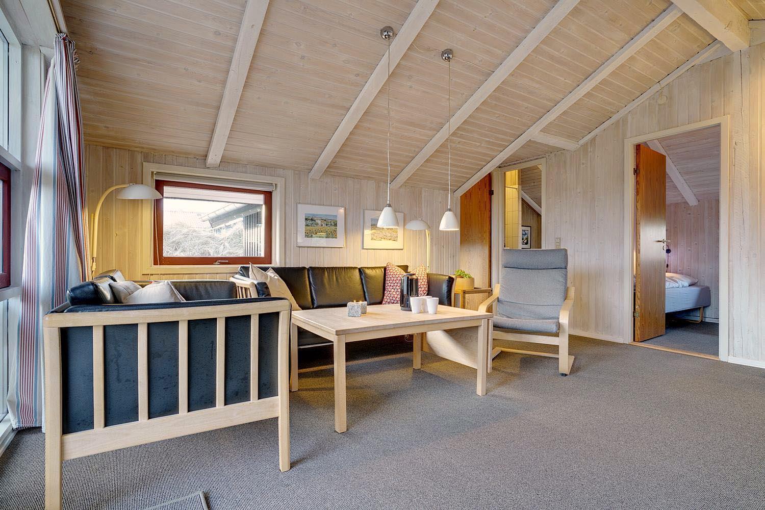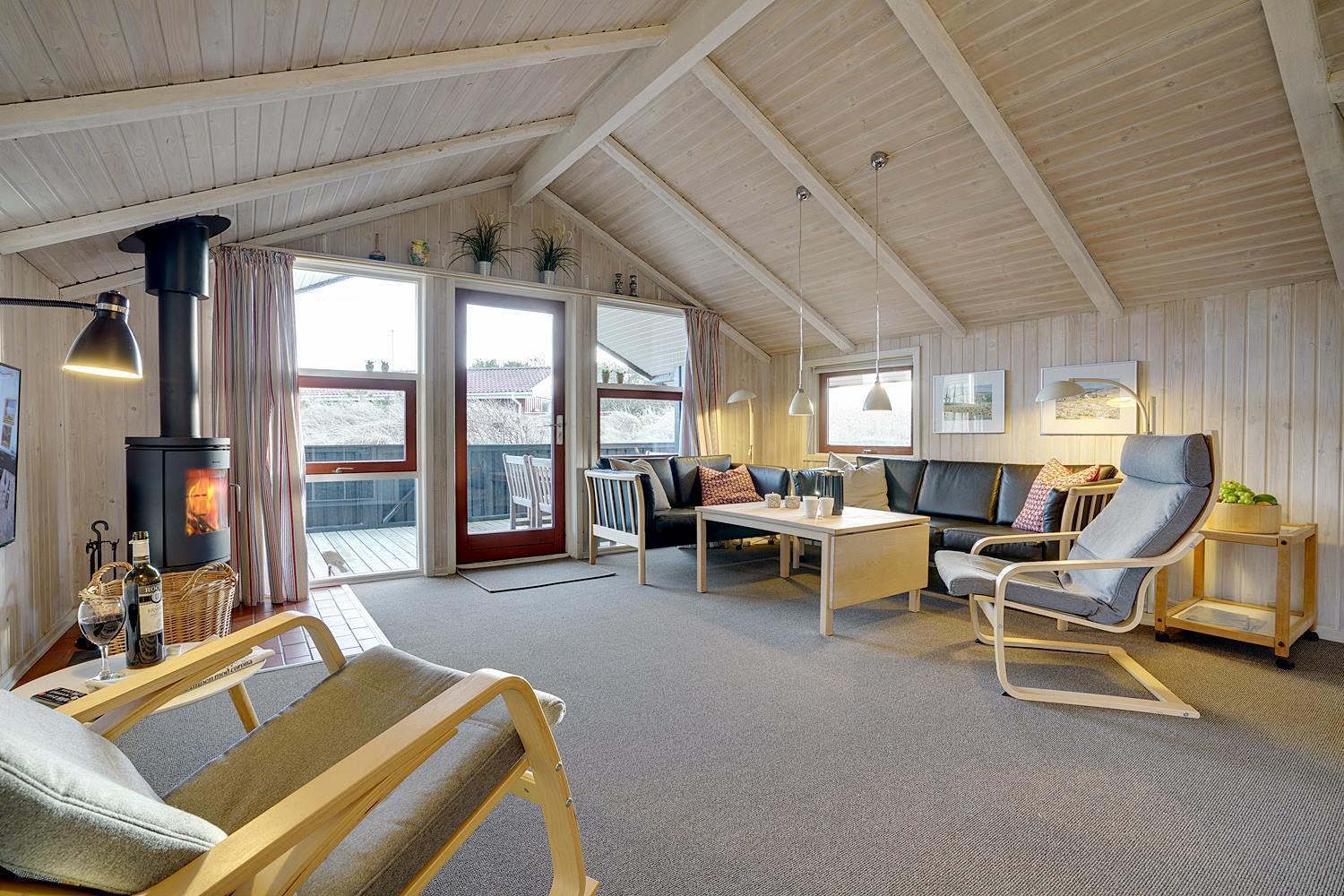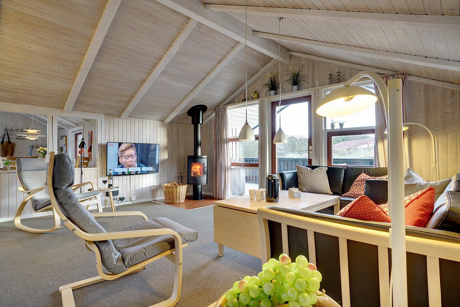 Huset byder på en lys og hyggelig stue med komfortable møbler og direkte adgang til terrassen.