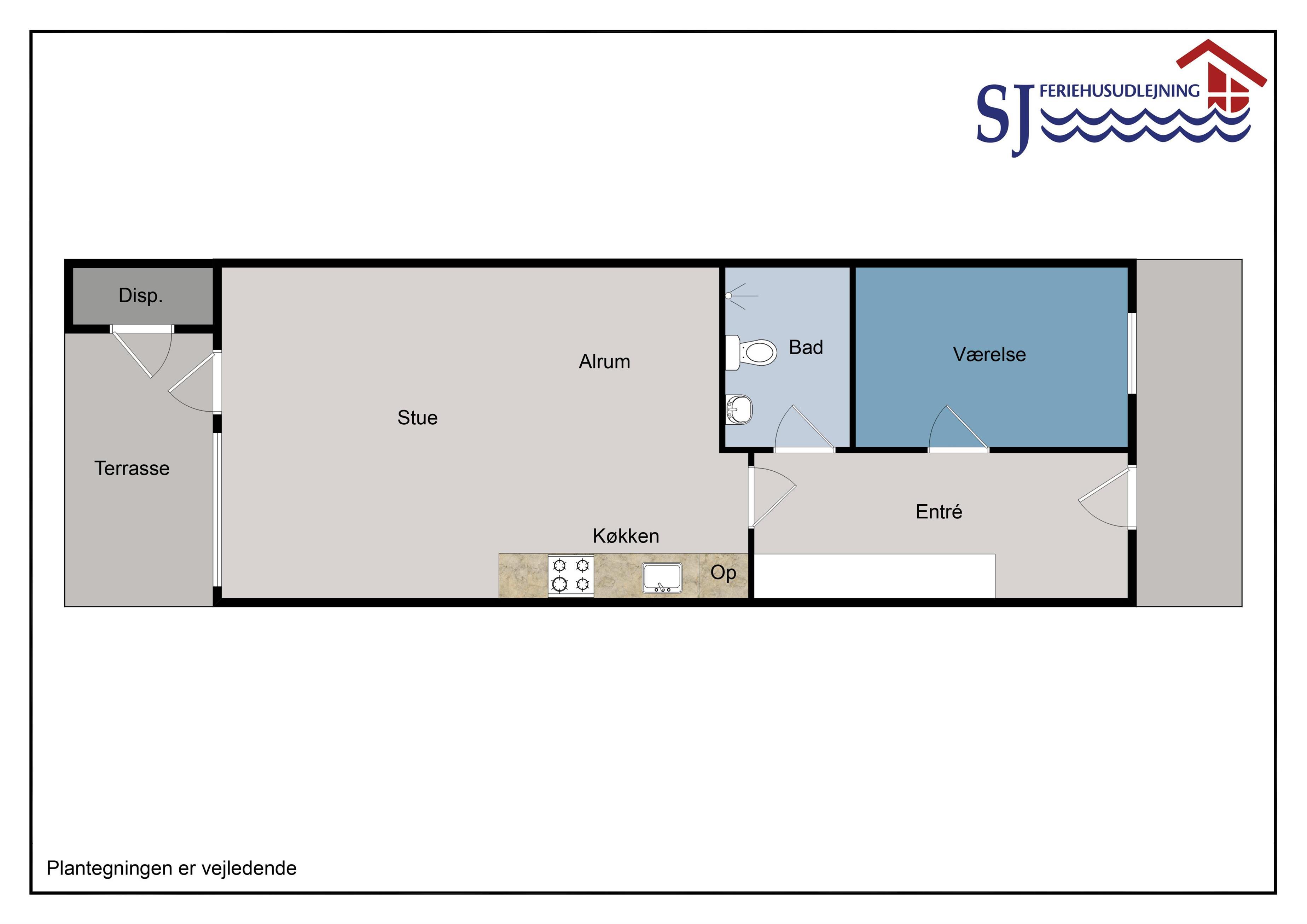 Pæn ferielejlighed til 4 personer beliggende i stueplan. Kombineret køkken og stue. Badeværelse med toilet, håndvask og bruser. 1 soverum: 1DS + 1S tæppe på gulvet. Køkkenet er indrettet med el-keramisk kogeplade, miniovn, opvaskemaskine og køleskab med lille frostbox. Stuen er indrettet med polster og lædermøbler, kabel-TV, der er 2 sovesofaer i stuen, som kan slåes ud, så der bliver i alt 3 sovepladser, der er tæppe på gulvet. Fra stuen er der udgang til lille delvis overdækket terrasse med havemøbler og 1 solvogn.