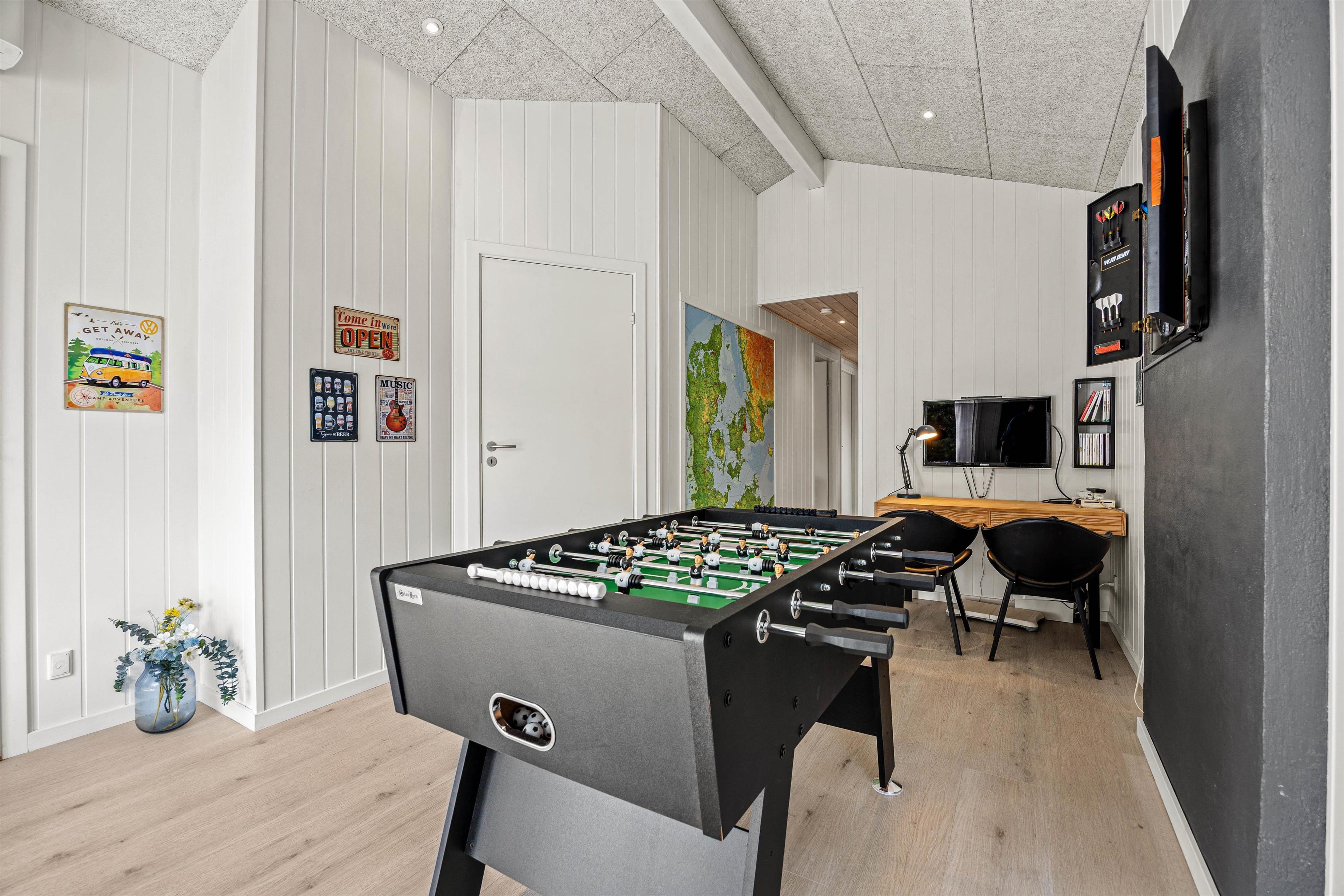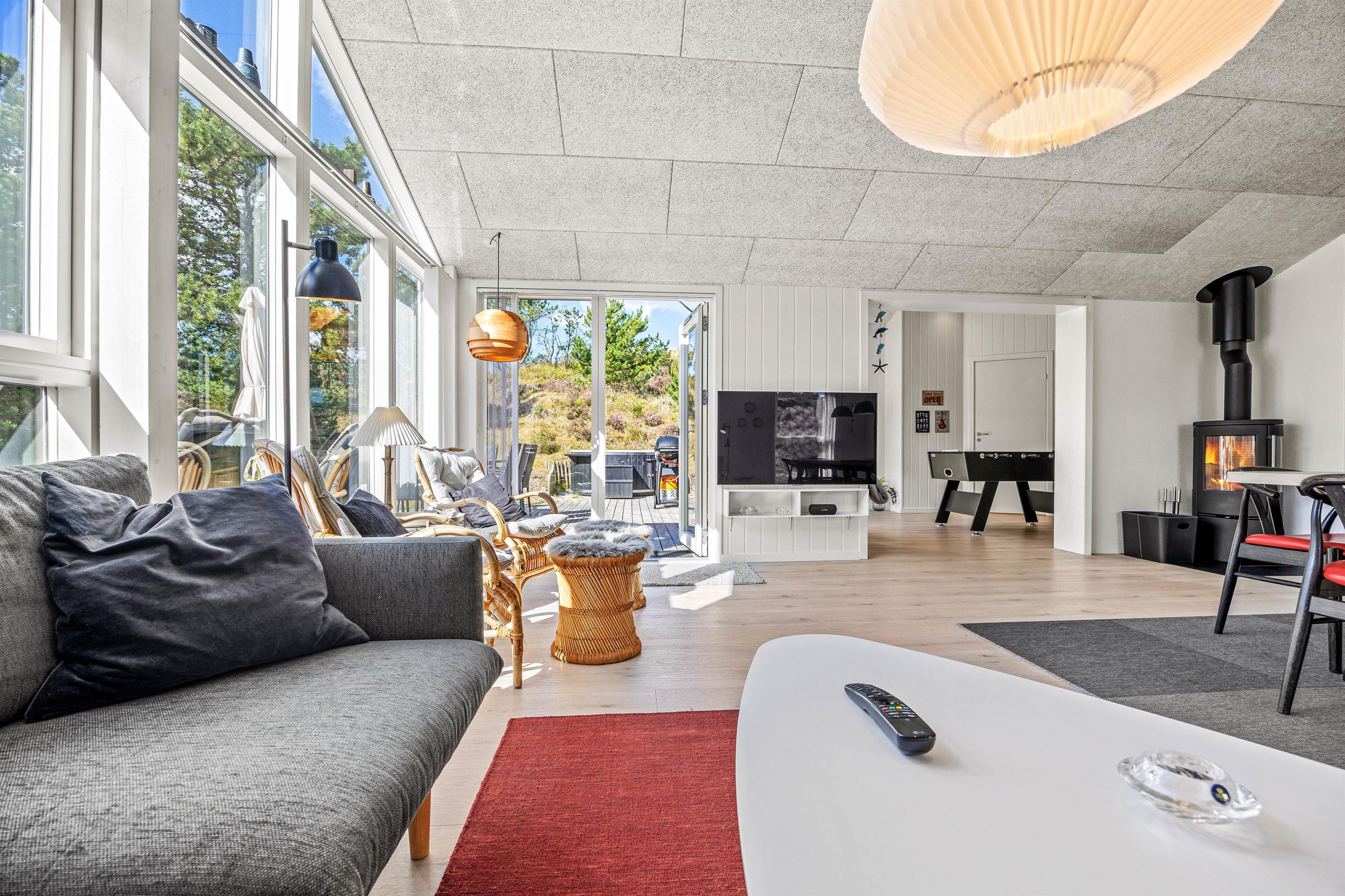 På Tjursvej 18 er der simpelthen hyggegaranti – for familien på op til 6 personer med to hunde eller bare til parret, der gerne vil bo skønt. Det lækre fællesrum med det moderne og godt indrettede køkken, det lange spisebord og den bekvemme store sofa er optimalt indrettet til ferien med familien eller vennepar, hvor også den hyggelige varme samt et gyldent skær fra brændeovnen kan brede sig. I åben forbindelse med køkken-alrummet kan der dystes med spil i aktivitetsrummet – her er wii, dart og bordfodbold.