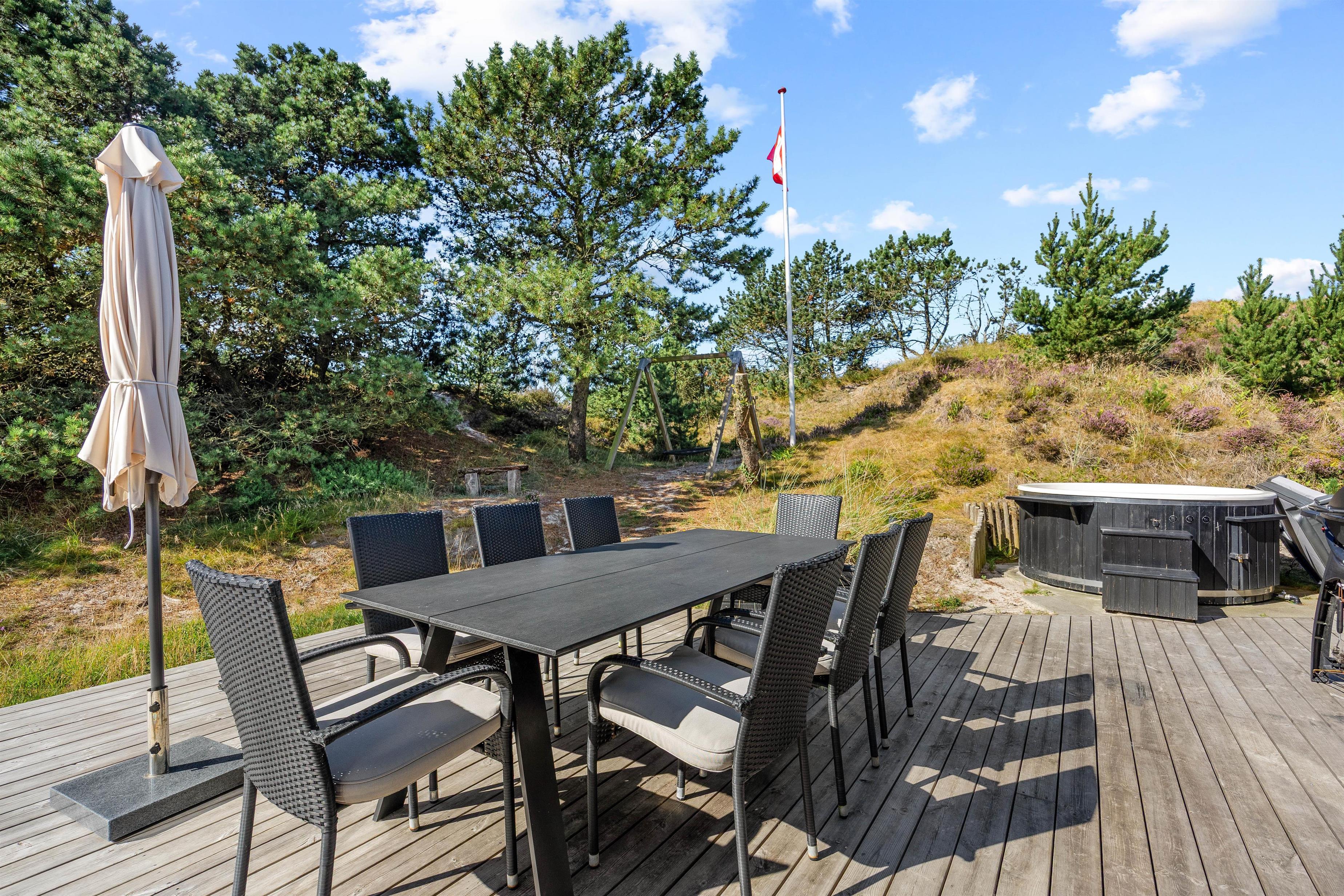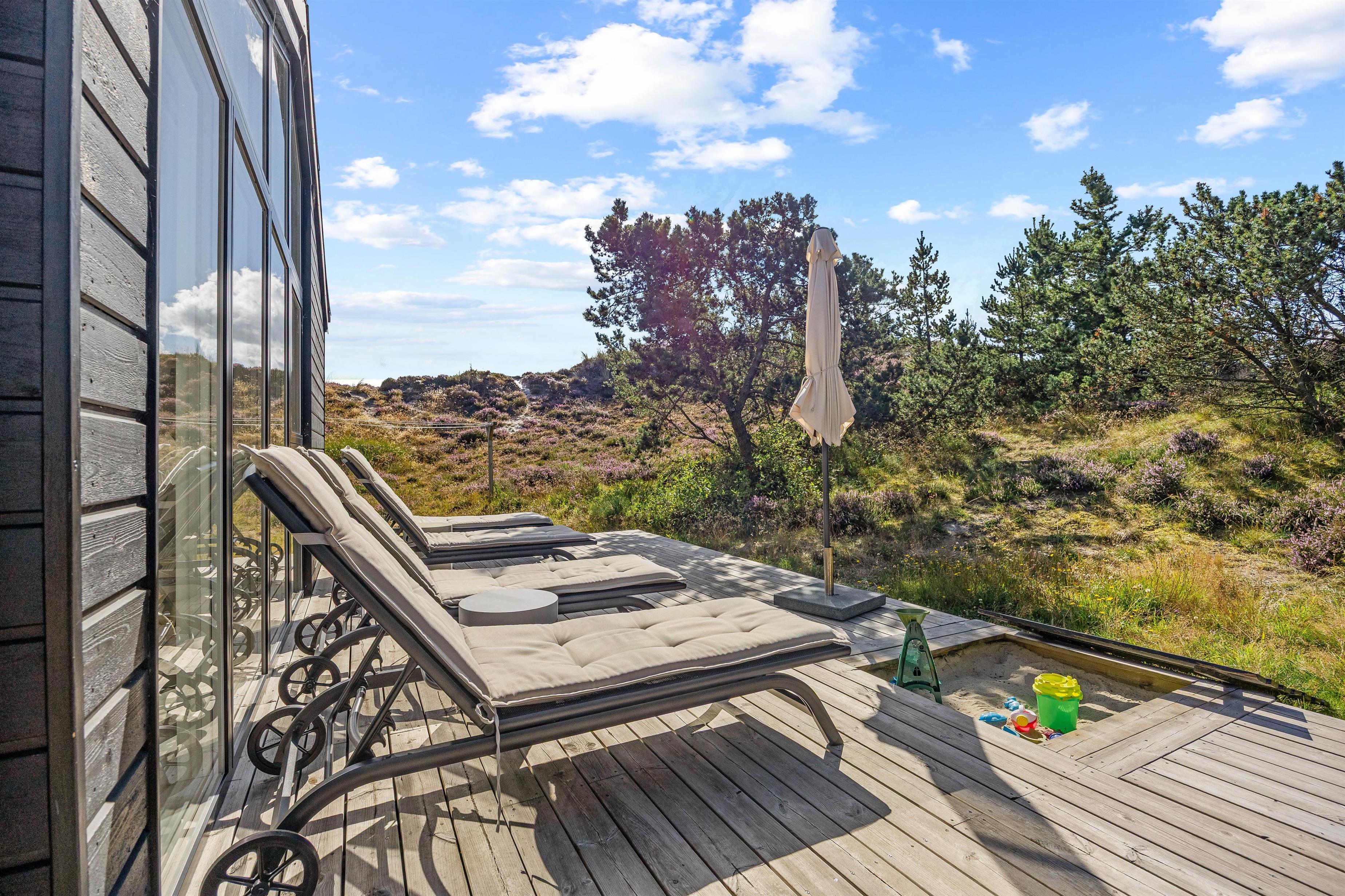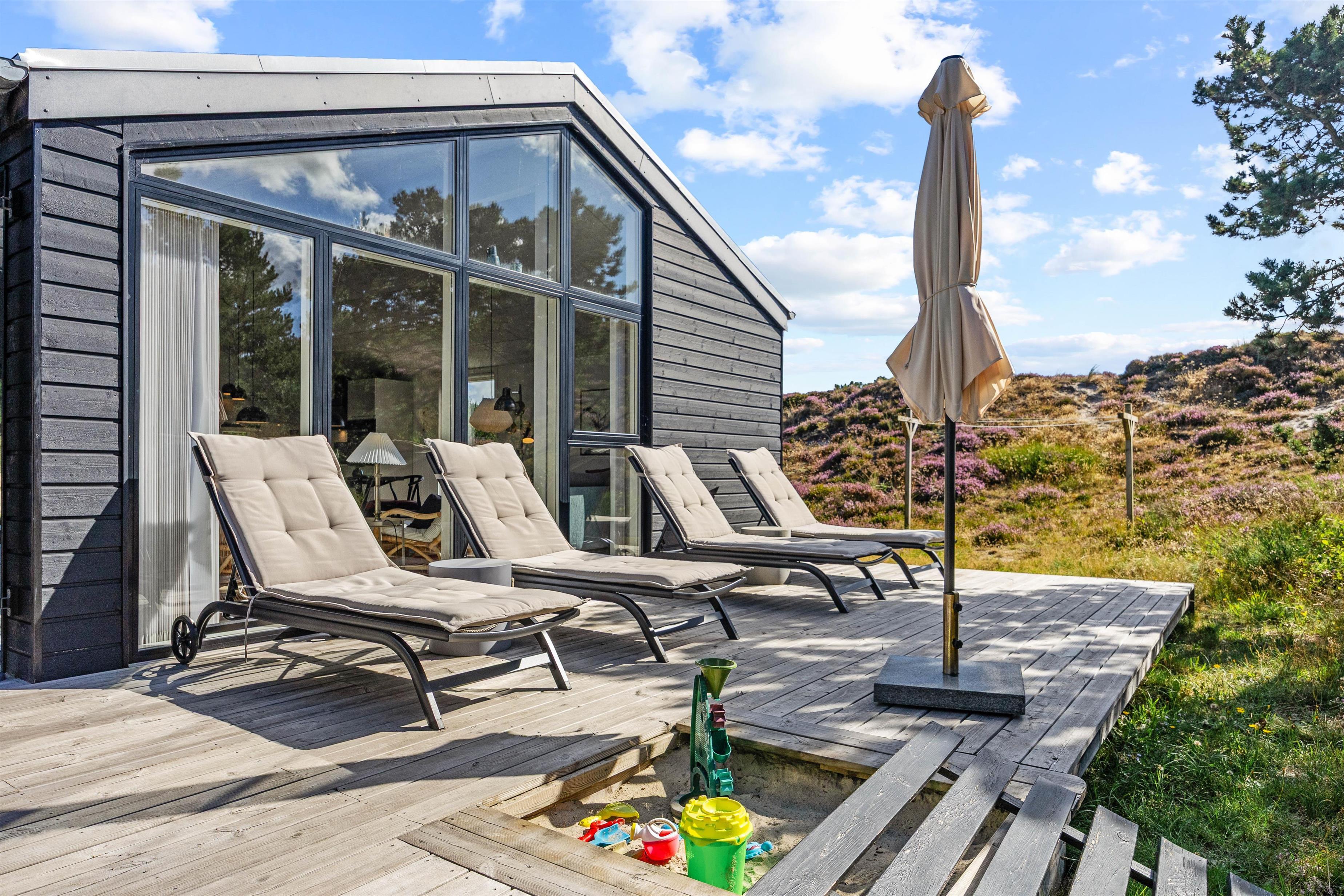 Ro og læ og en duft af lynghede er kendetegnene for beliggenheden. Sommerhuset ligger på en stor naturgrund, gemt bag lyng- og fyrretræsbeklædte klitter med kun nogle få hundrede meter til indkøb. Her er en magisk stille stemning og I kan nemt tilbringe dagen på sommerhusets terrasser, der lover læ og plads til solbadning, grillhygge og et vildmarksbad! Børnene vil elske gyngerne og sandkassen. Trænger I til at få skyllet sand og salt af huden efter en tur på stranden, eller blot trænger at køle af, kan I nemt bruge udebruseren* til dette.