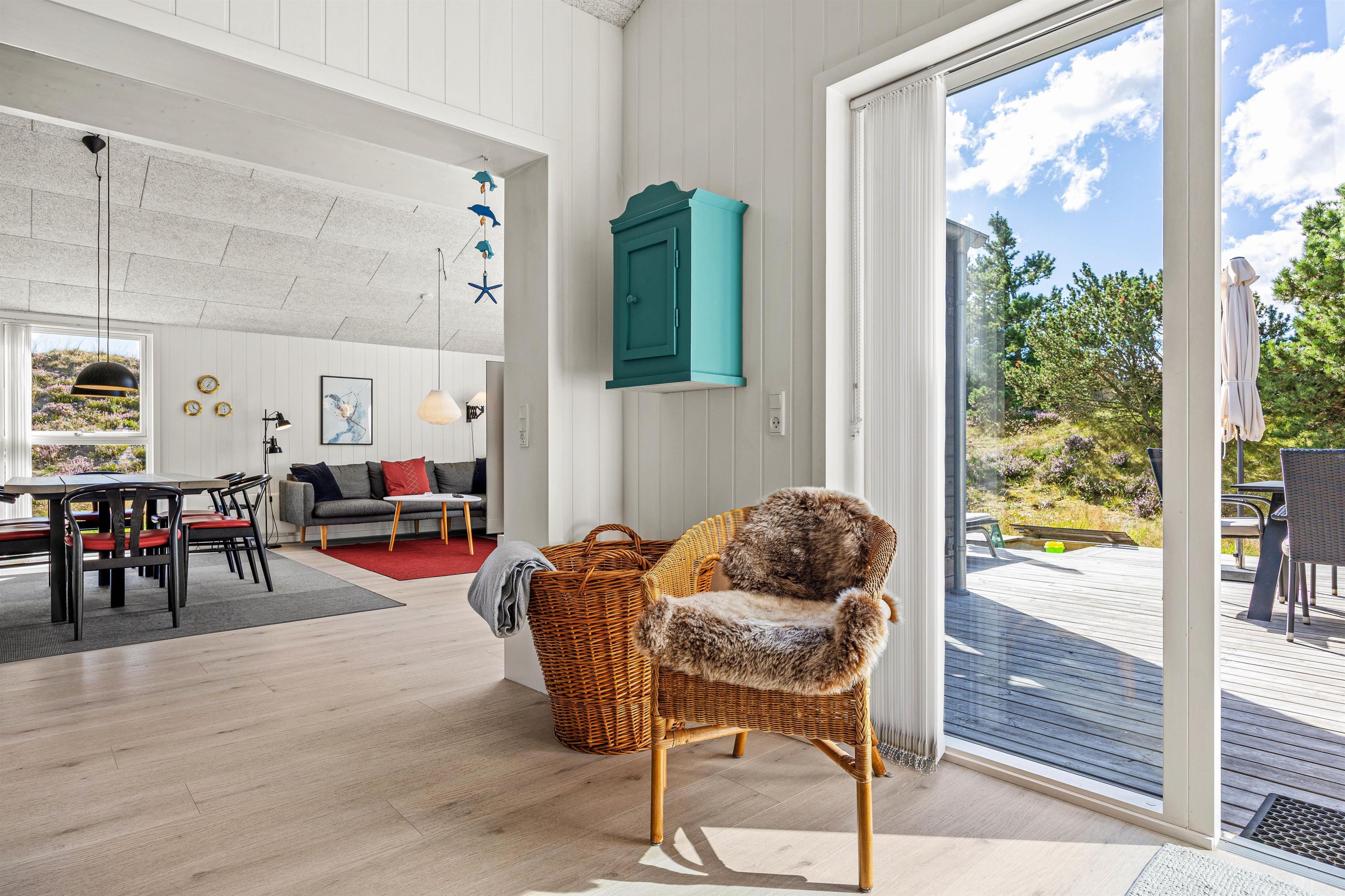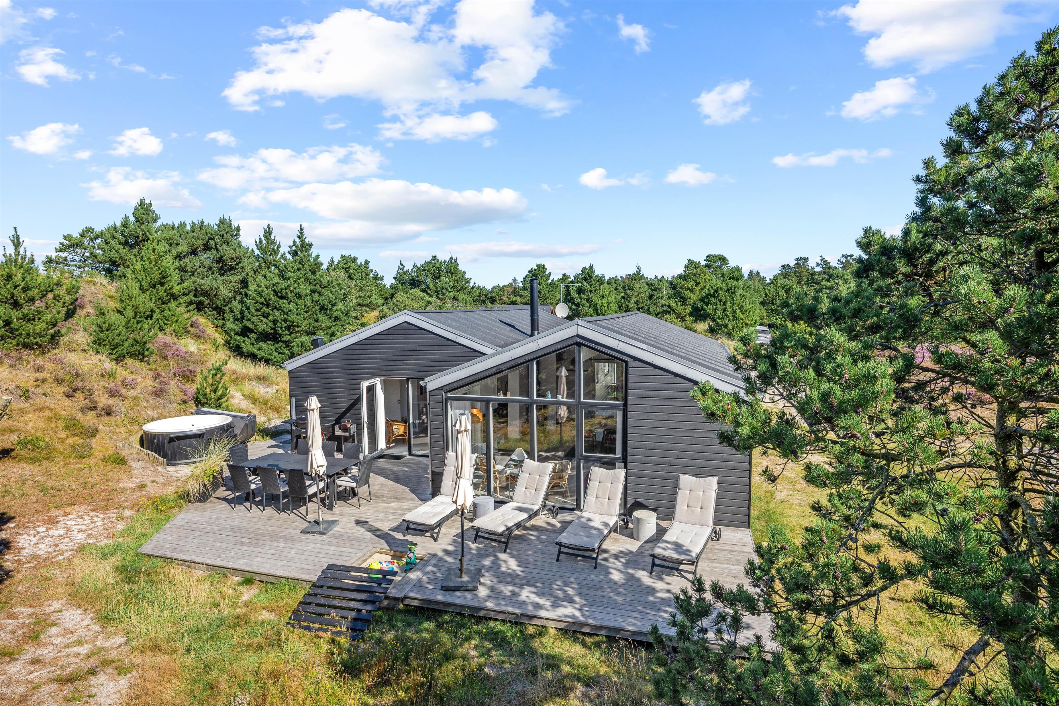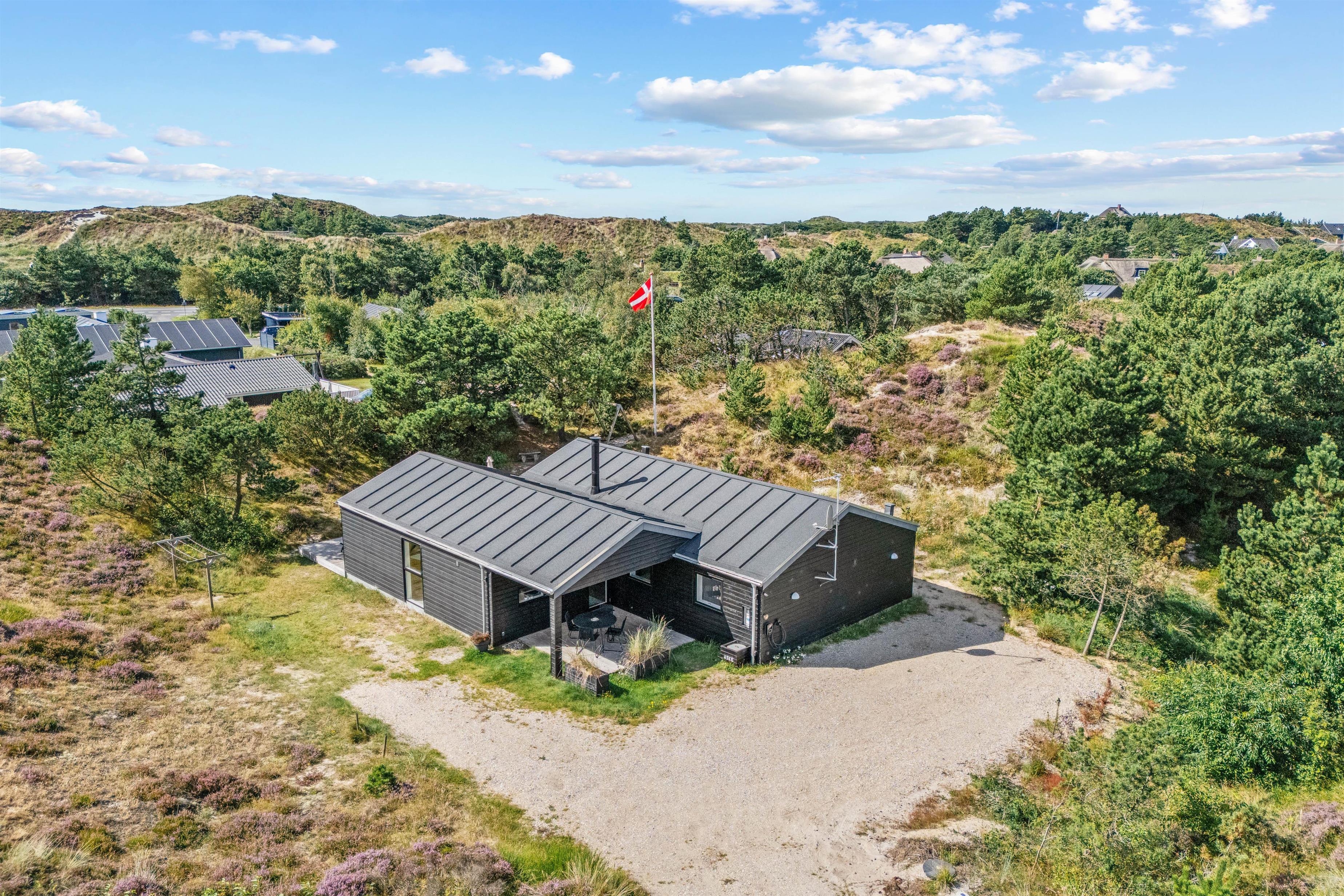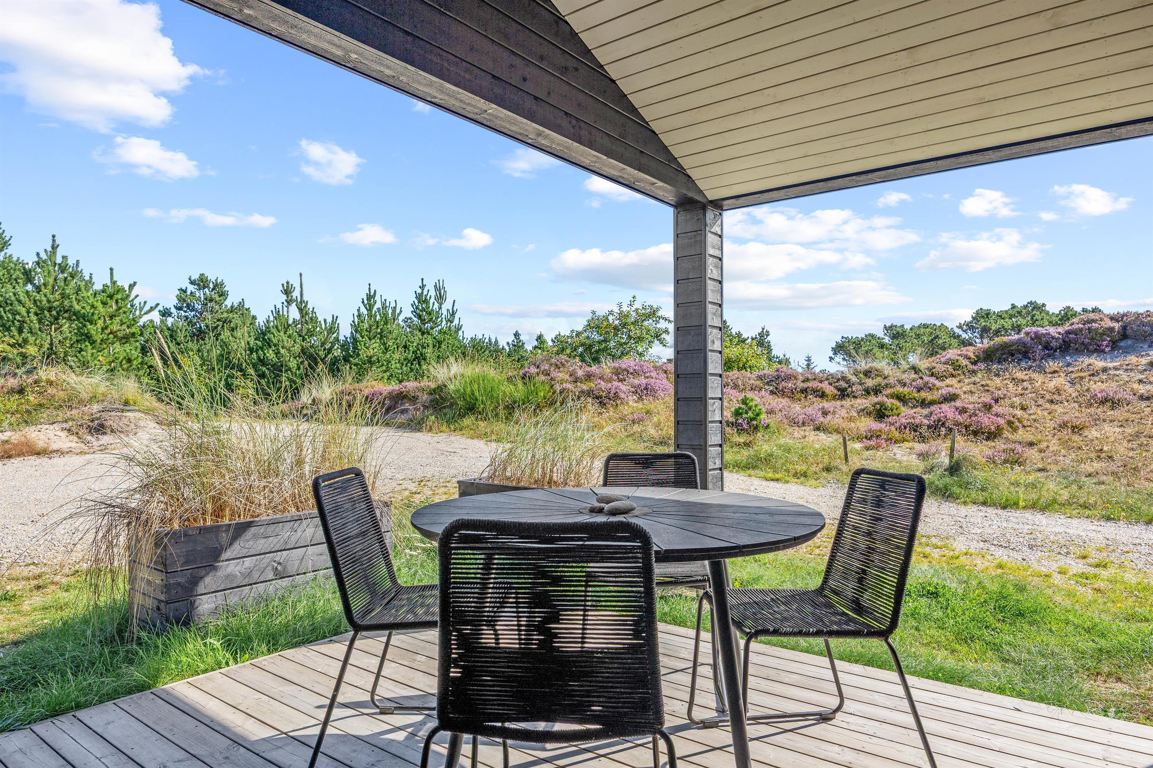 Ro og læ og en duft af lynghede er kendetegnene for beliggenheden. Sommerhuset ligger på en stor naturgrund, gemt bag lyng- og fyrretræsbeklædte klitter med kun nogle få hundrede meter til indkøb. Her er en magisk stille stemning og I kan nemt tilbringe dagen på sommerhusets terrasser, der lover læ og plads til solbadning, grillhygge og et vildmarksbad! Børnene vil elske gyngerne og sandkassen. Trænger I til at få skyllet sand og salt af huden efter en tur på stranden, eller blot trænger at køle af, kan I nemt bruge udebruseren* til dette.