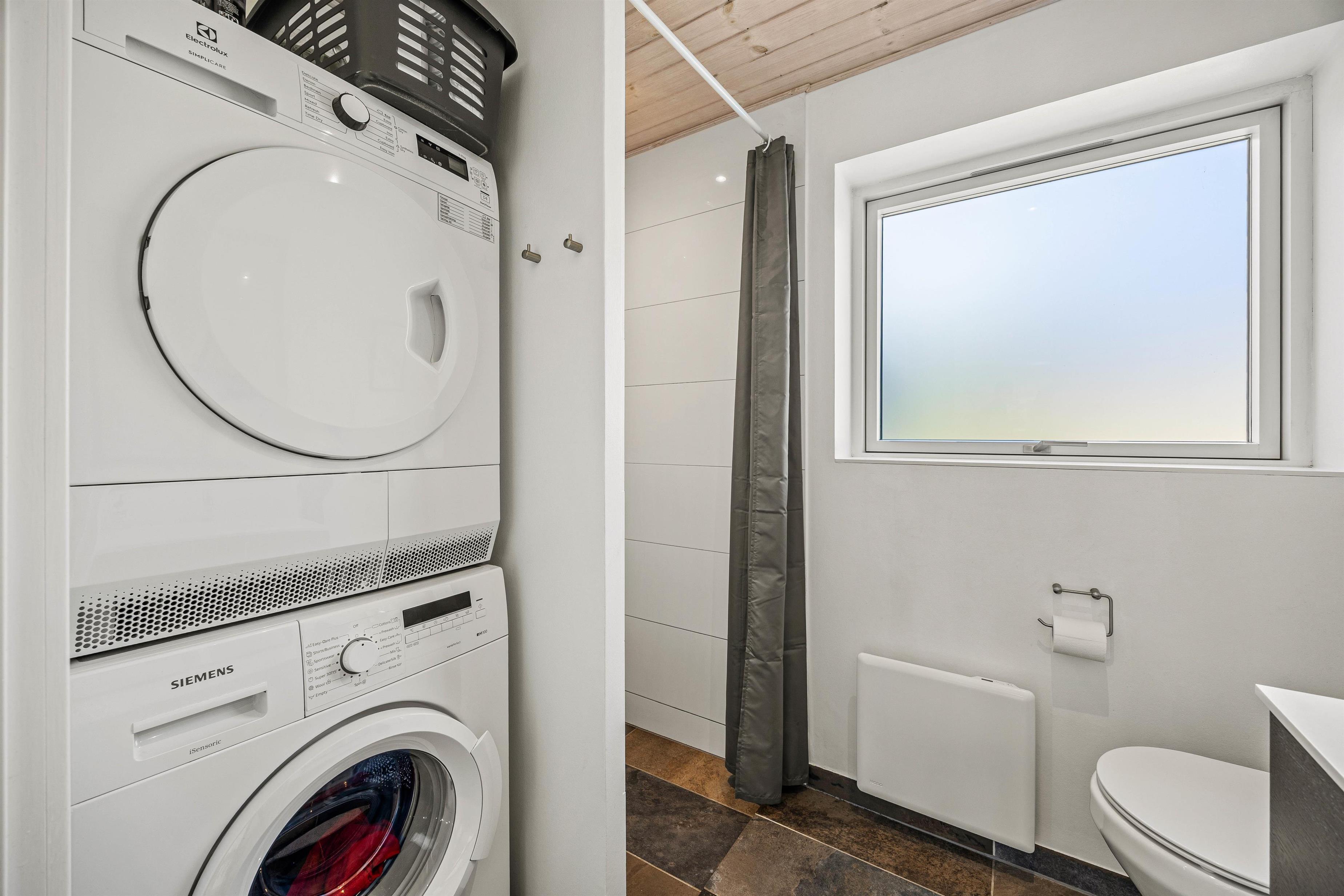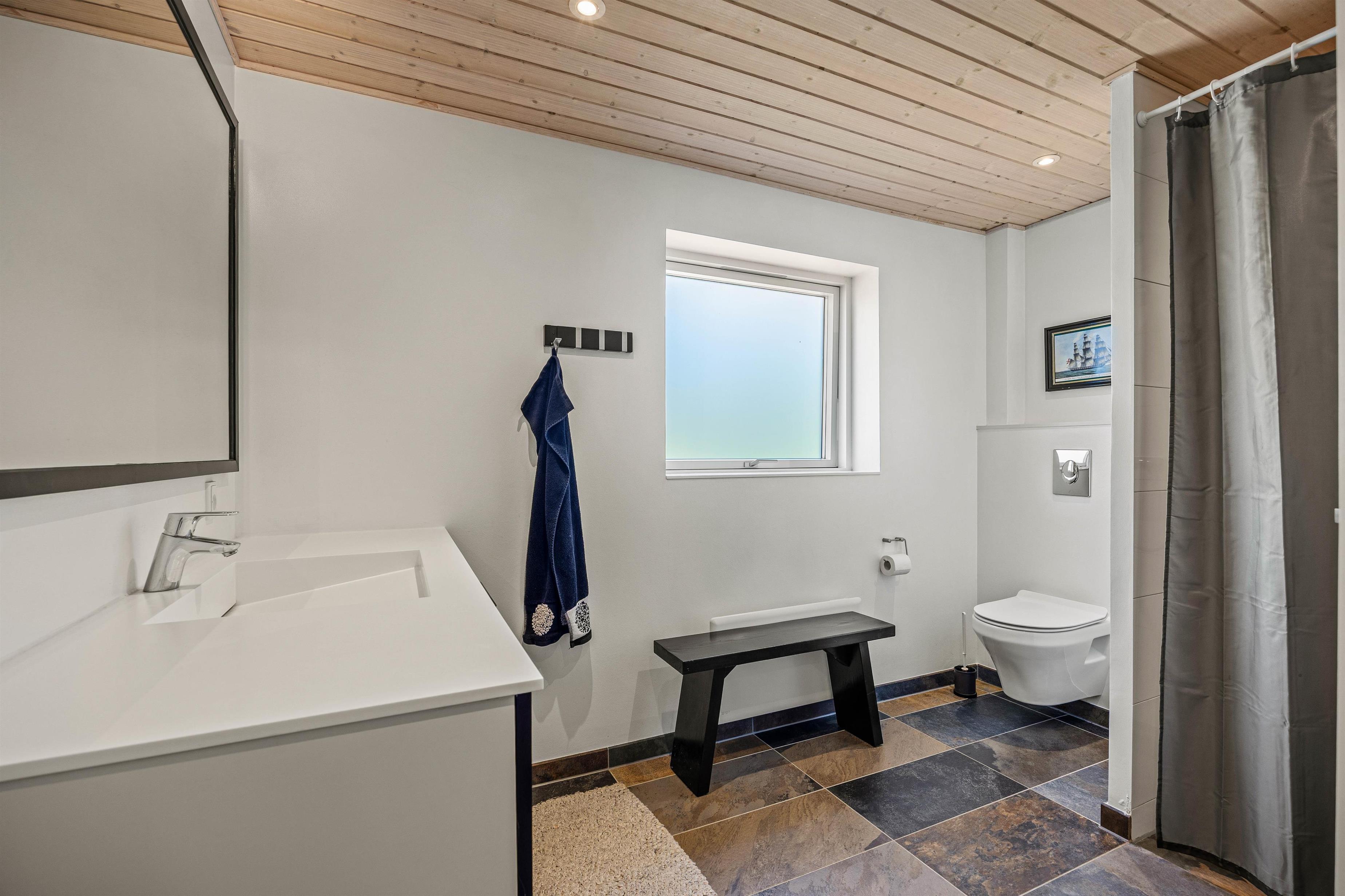 De stilfulde badeværelser har begge gulvvarme og til ægte feriehusstemning ved havet hører naturligvis en dejlig sauna. Med ekstra udstyr som vaskemaskine, tørretumbler, varmepumpe og gulvvarme i badeværelserne er Tjursvej 18 optimalt til rigtig ferieafslapning.