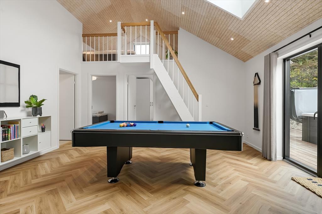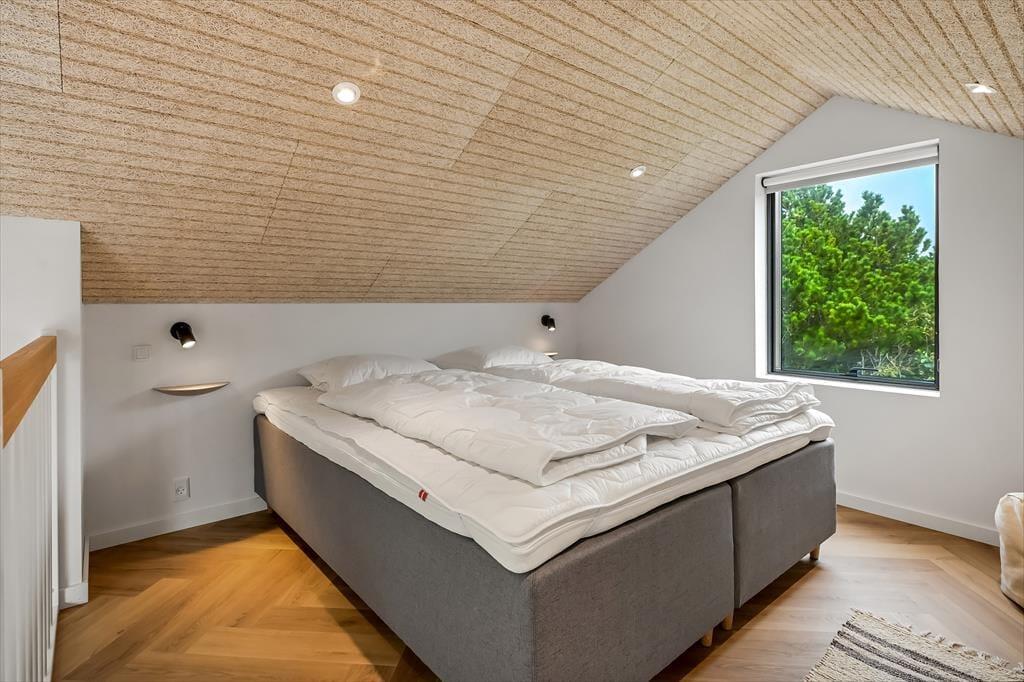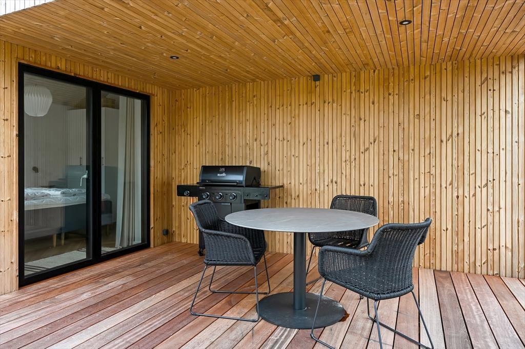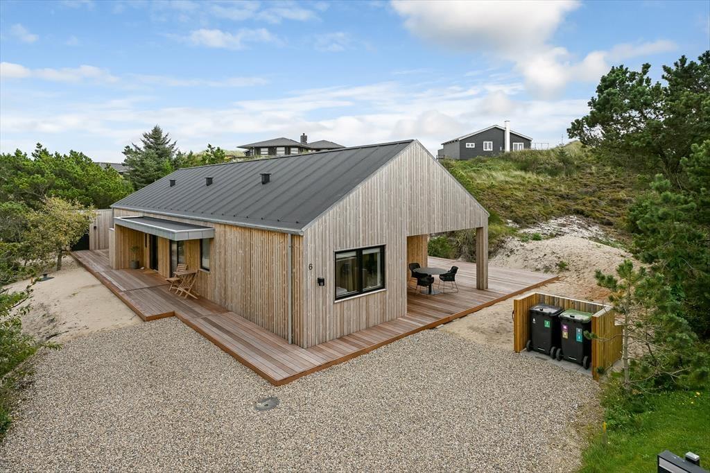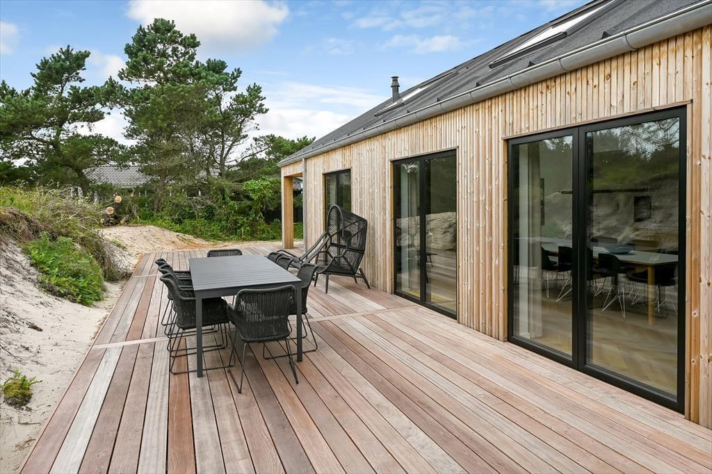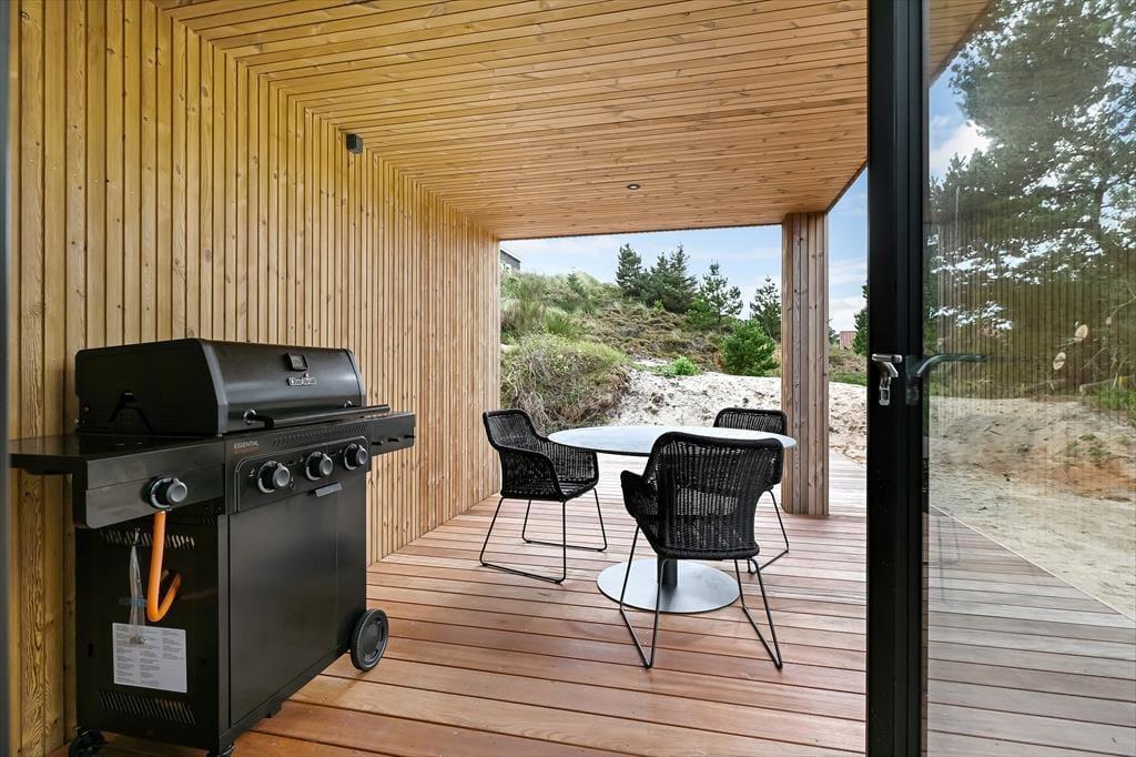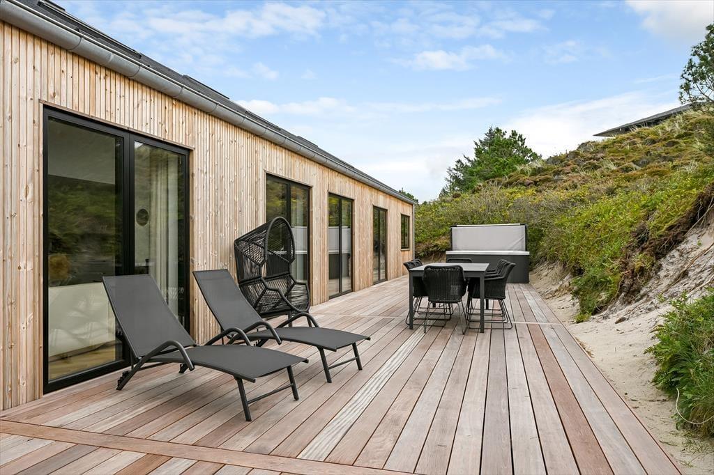 Sommerhuset ligger i en lille gryde omgivet af klitter, så du kan nyde solen og den friske havluft i læ for vinden. På terrassen finder du udespaen – et helt særligt sted at koble af, mens de varme bobler masserer kroppen. Måske vælger du at starte dagen her med et stille øjeblik, eller du slutter den med et glas vin, mens aftensolen farver himlen. Terrassen indbyder til lange måltider under åben himmel, og når solen står højt, kan du finde en god liggestol og bare nyde stilheden, afbrudt af fuglesang og den fjerne lyd af bølgerne. Placeringen giver en dejlig følelse af privatliv, hvor du virkelig kan slappe af uden forstyrrelser.
