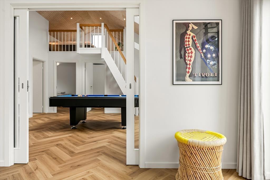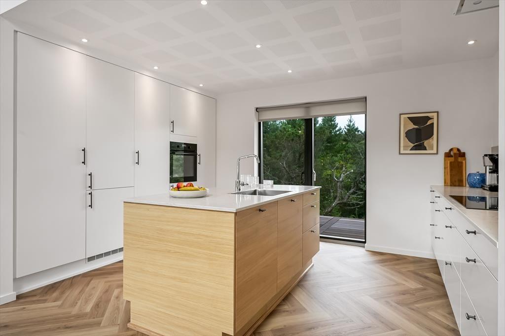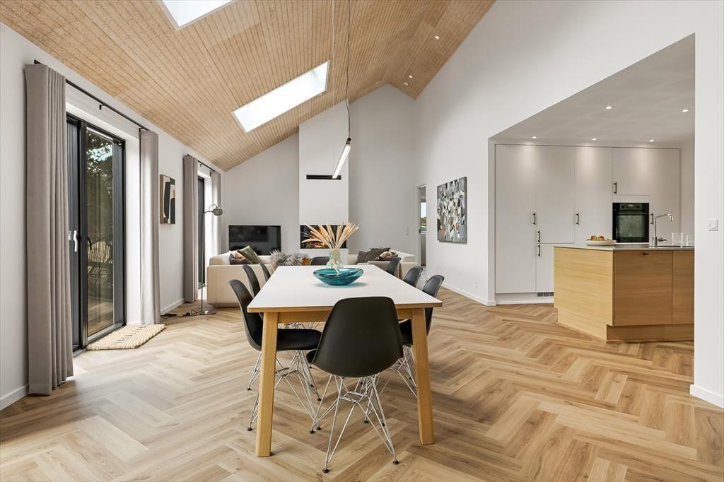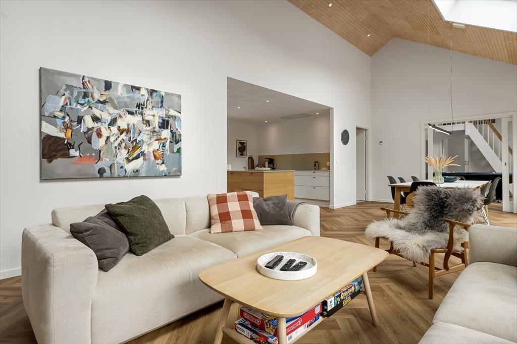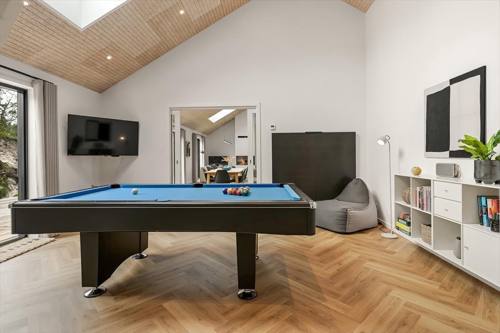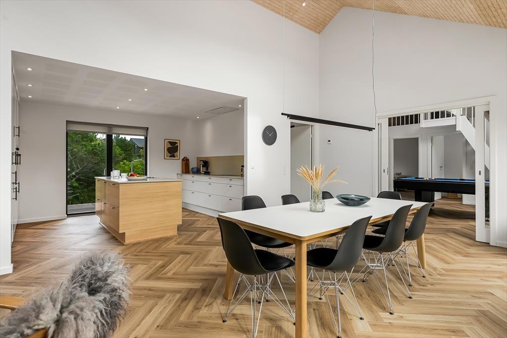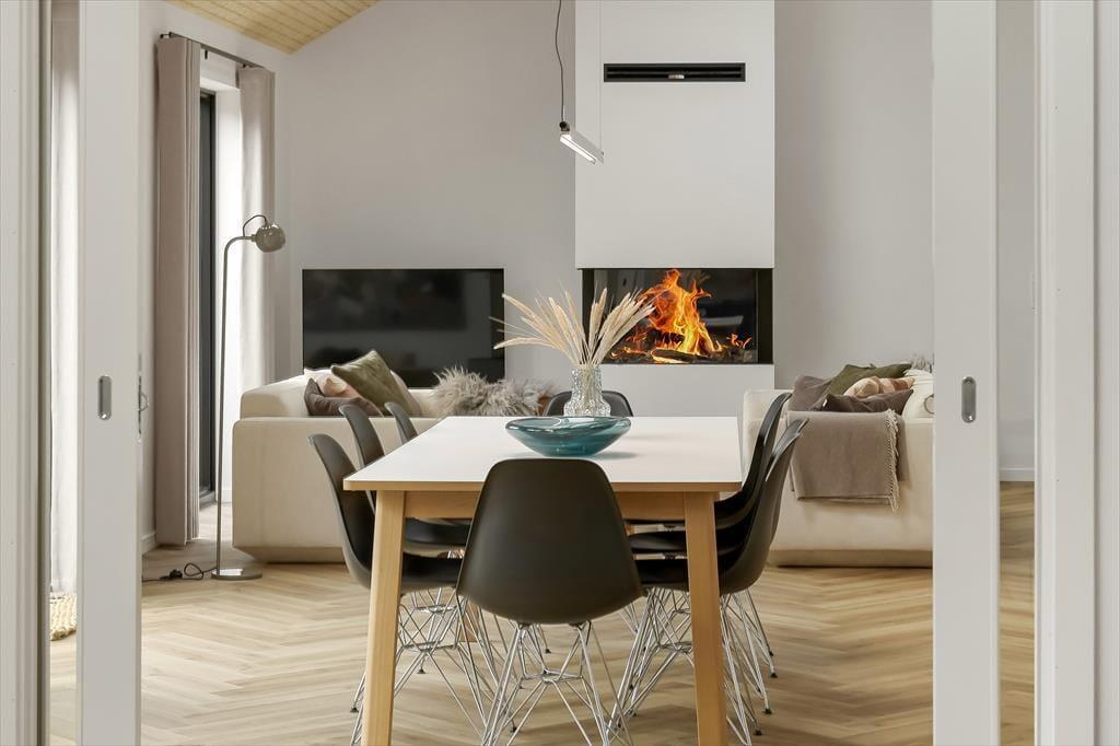 Når du træder ind i sommerhuset, mødes du af en lys og indbydende indretning, der straks sætter feriestemningen. Her kan du samles i det hyggelige opholdsrum, hvor de store vinduer lukker masser af dagslys ind og skaber en åben forbindelse til naturen udenfor. Køkkenet ligger i åben forbindelse med spisepladsen, så I kan være sammen om madlavningen eller nyde en kop kaffe og en god snak, mens maden simrer. Indretningen er skabt til afslapning, hvad enten du vil slænge dig med en bog, spille brætspil med familien eller bare lade tankerne drive. Her er plads til både fælles hygge og små stille stunder, hvor du kan mærke roen brede sig.
