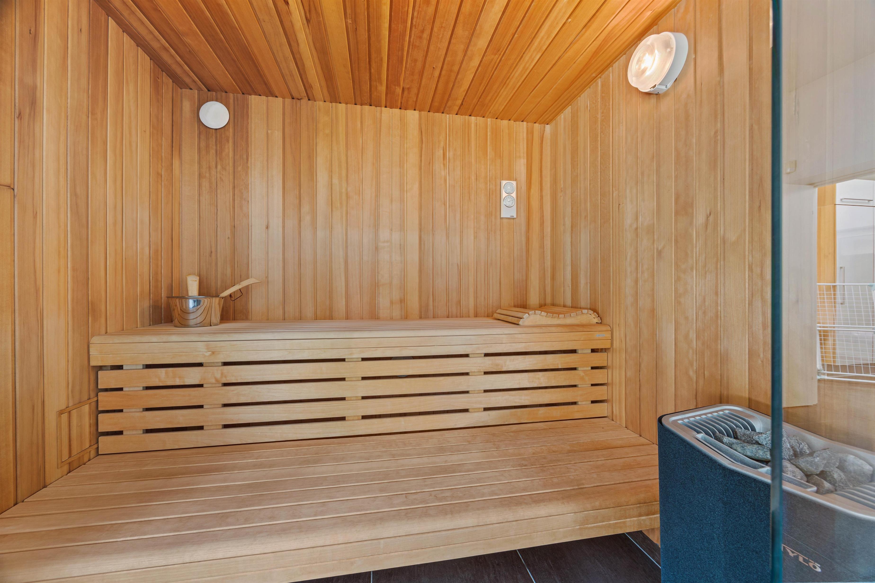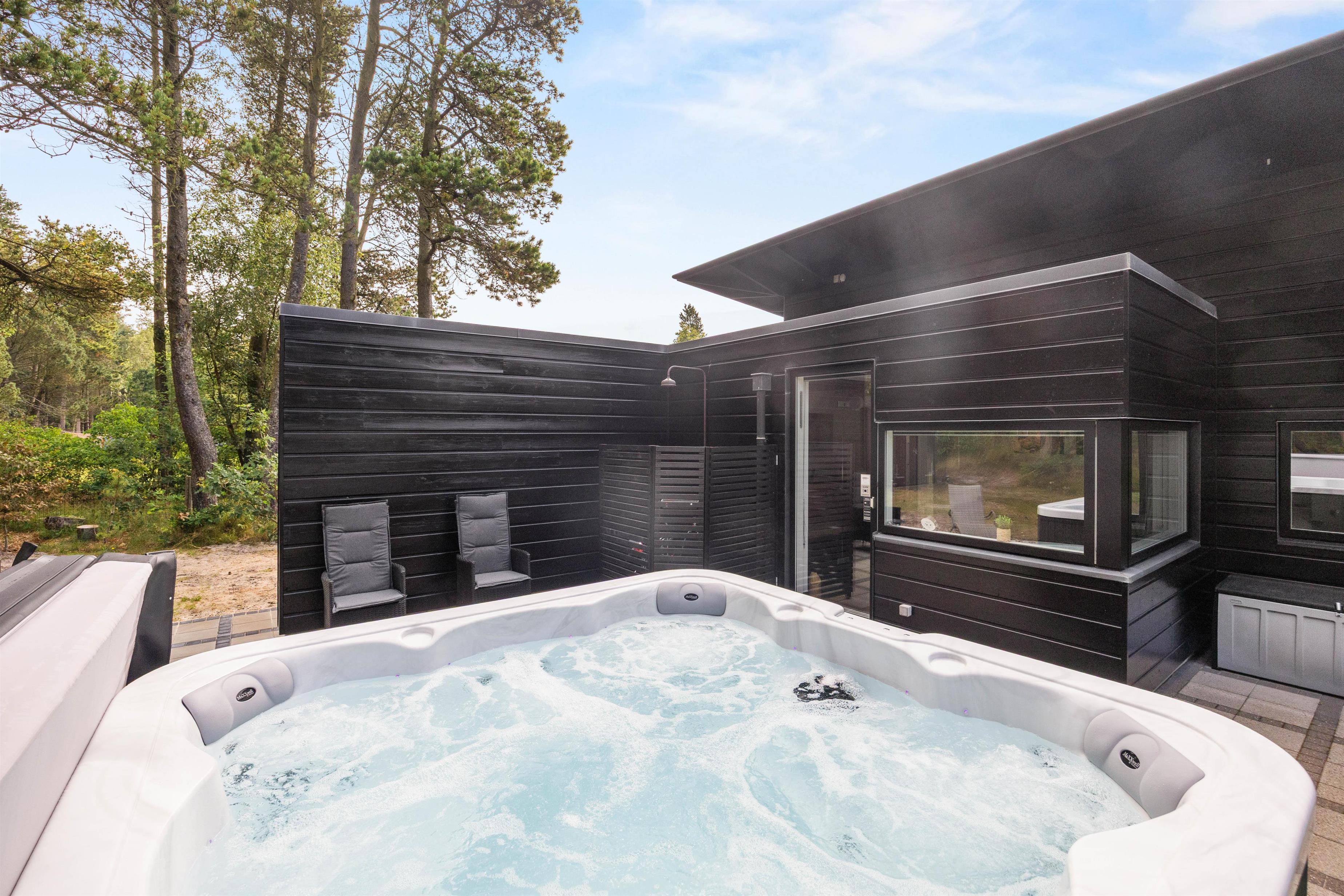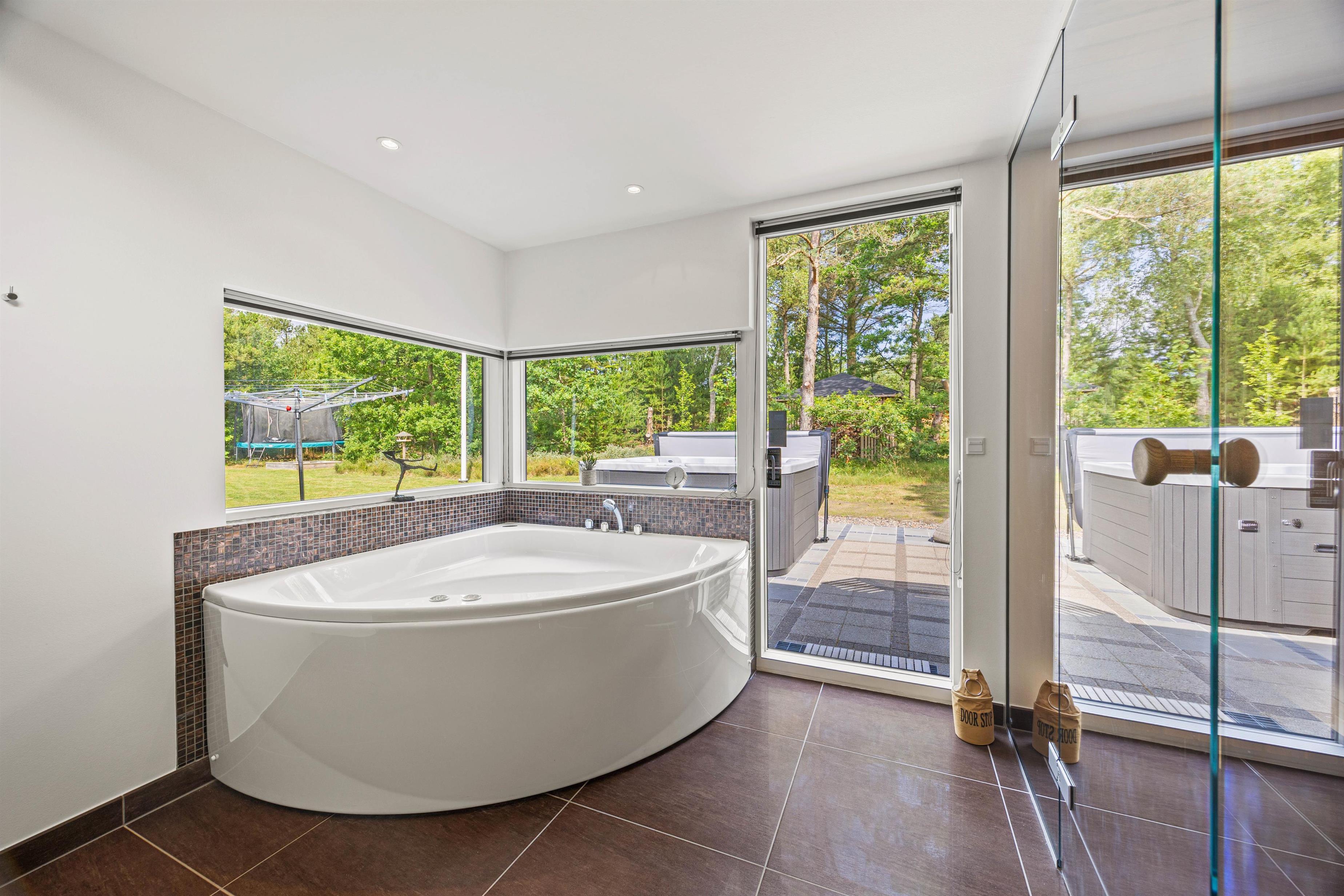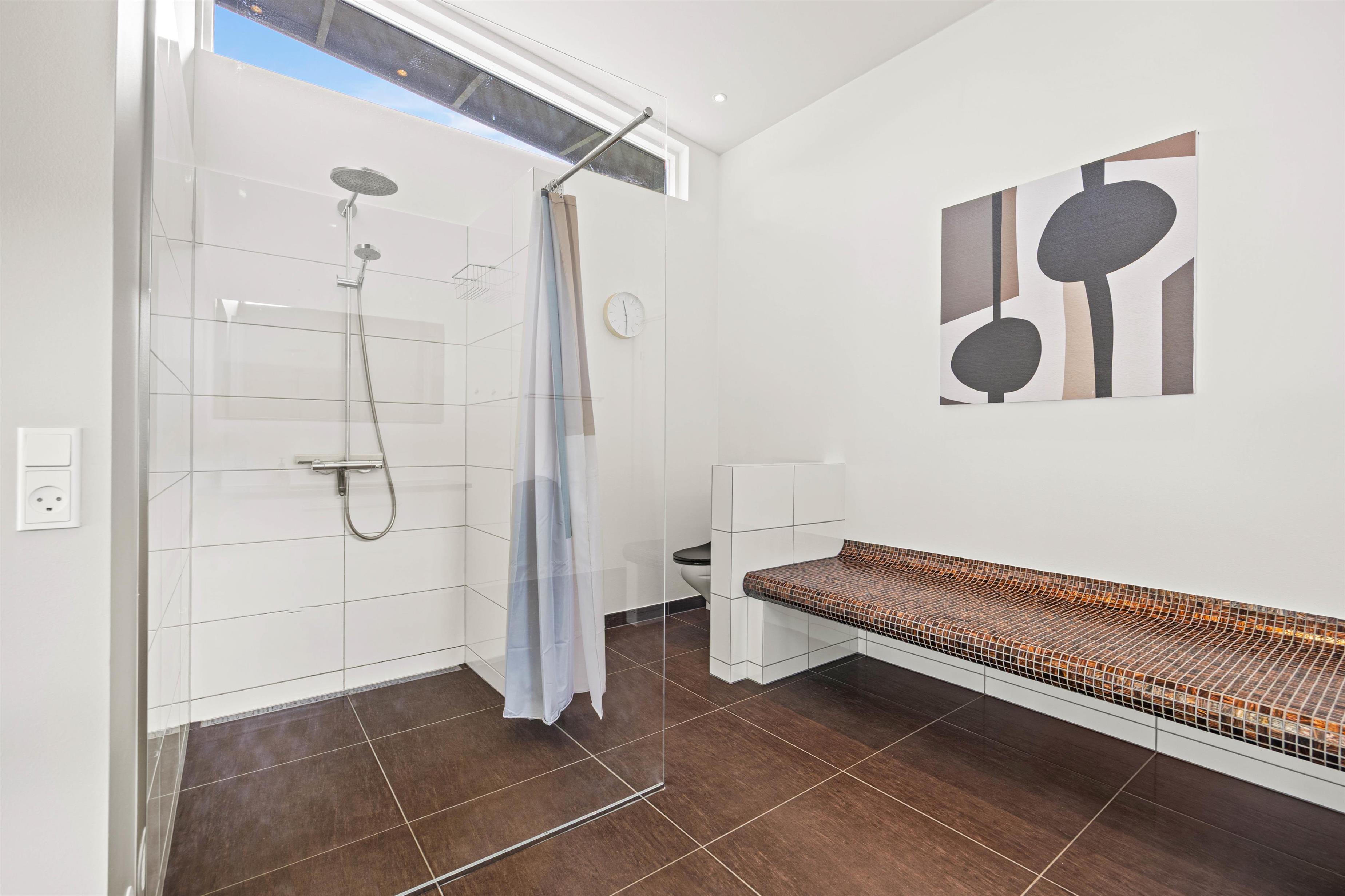 Efter en aktiv dag i naturen er der intet bedre end at slappe af i sommerhusets wellnessområde. Her finder I både en afslappende sauna og en indendørs tømmespa – ideelt til at komme helt ned i gear. Fra badeværelset er der direkte adgang til terrassen, hvor det udendørs spabad og en forfriskende udebruser venter. Her kan I nyde den varme damp under åben himmel og forene komfort med naturens ro.