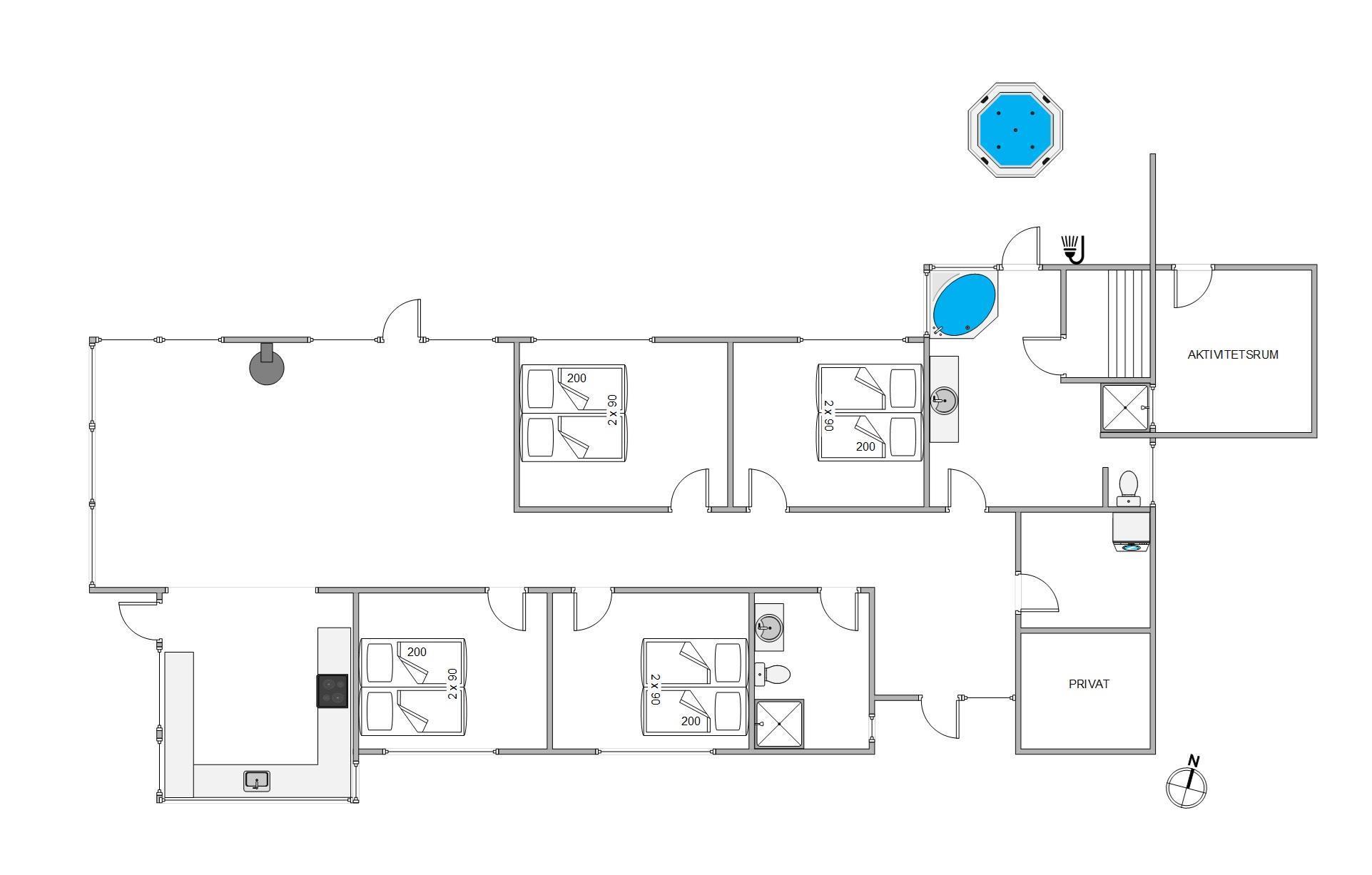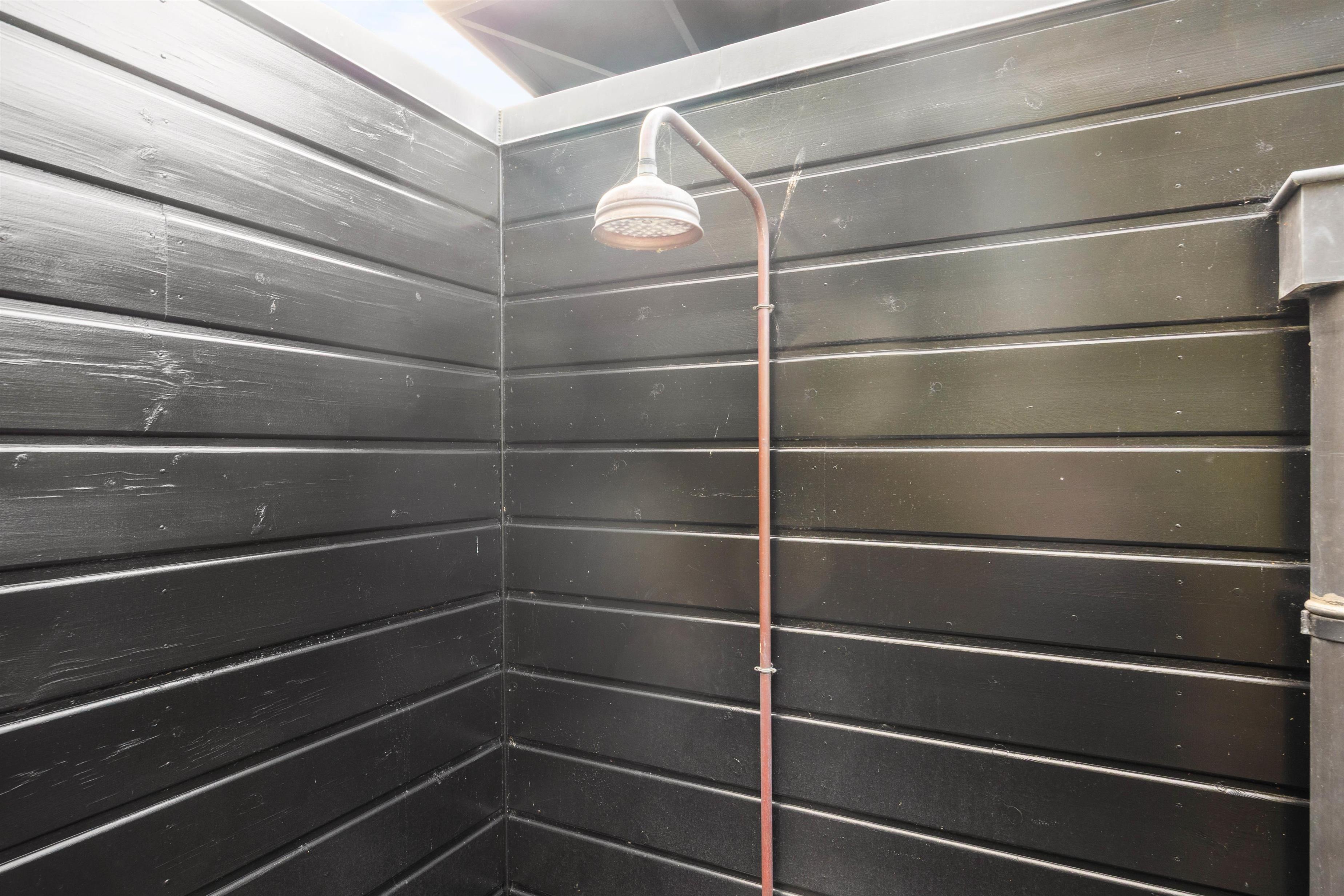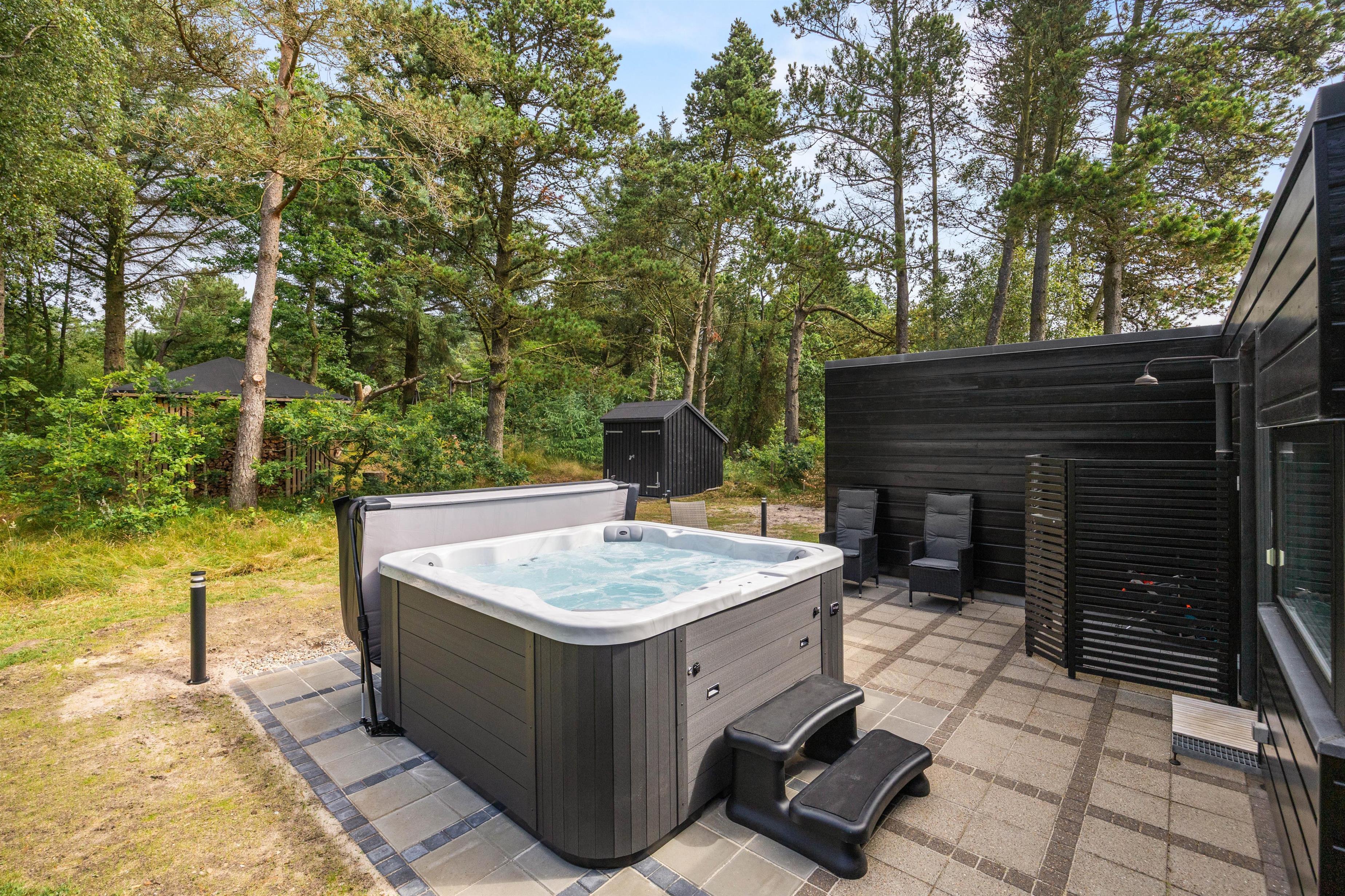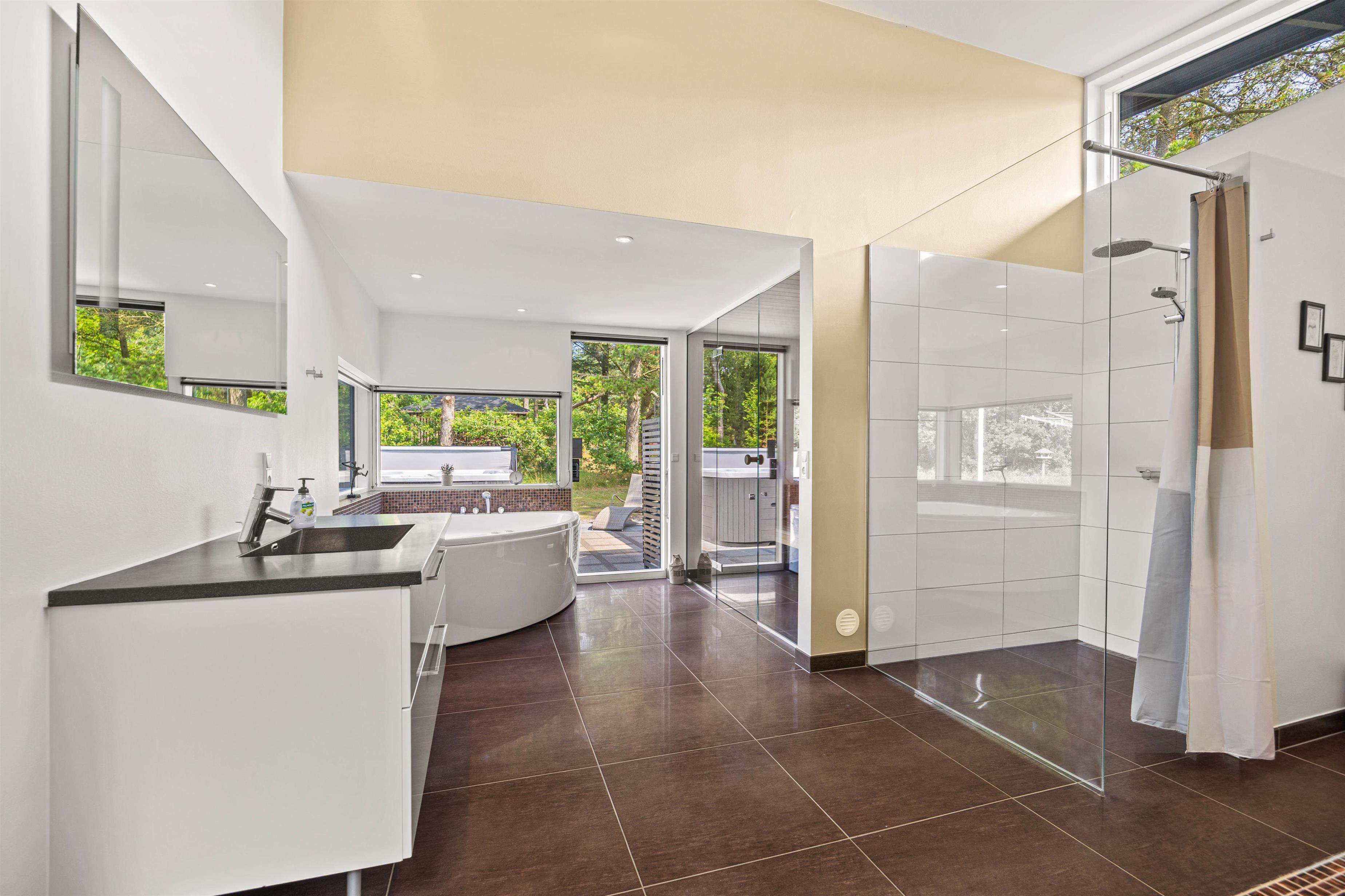 Efter en aktiv dag i naturen er der intet bedre end at slappe af i sommerhusets wellnessområde. Her finder I både en afslappende sauna og en indendørs tømmespa – ideelt til at komme helt ned i gear. Fra badeværelset er der direkte adgang til terrassen, hvor det udendørs spabad og en forfriskende udebruser venter. Her kan I nyde den varme damp under åben himmel og forene komfort med naturens ro.