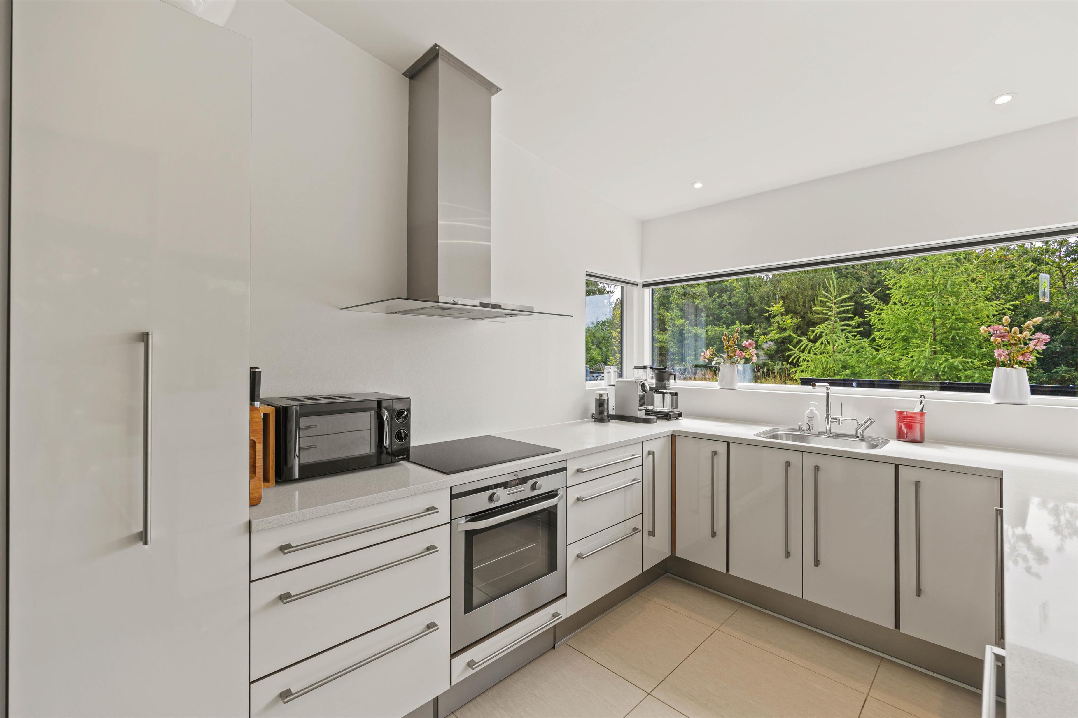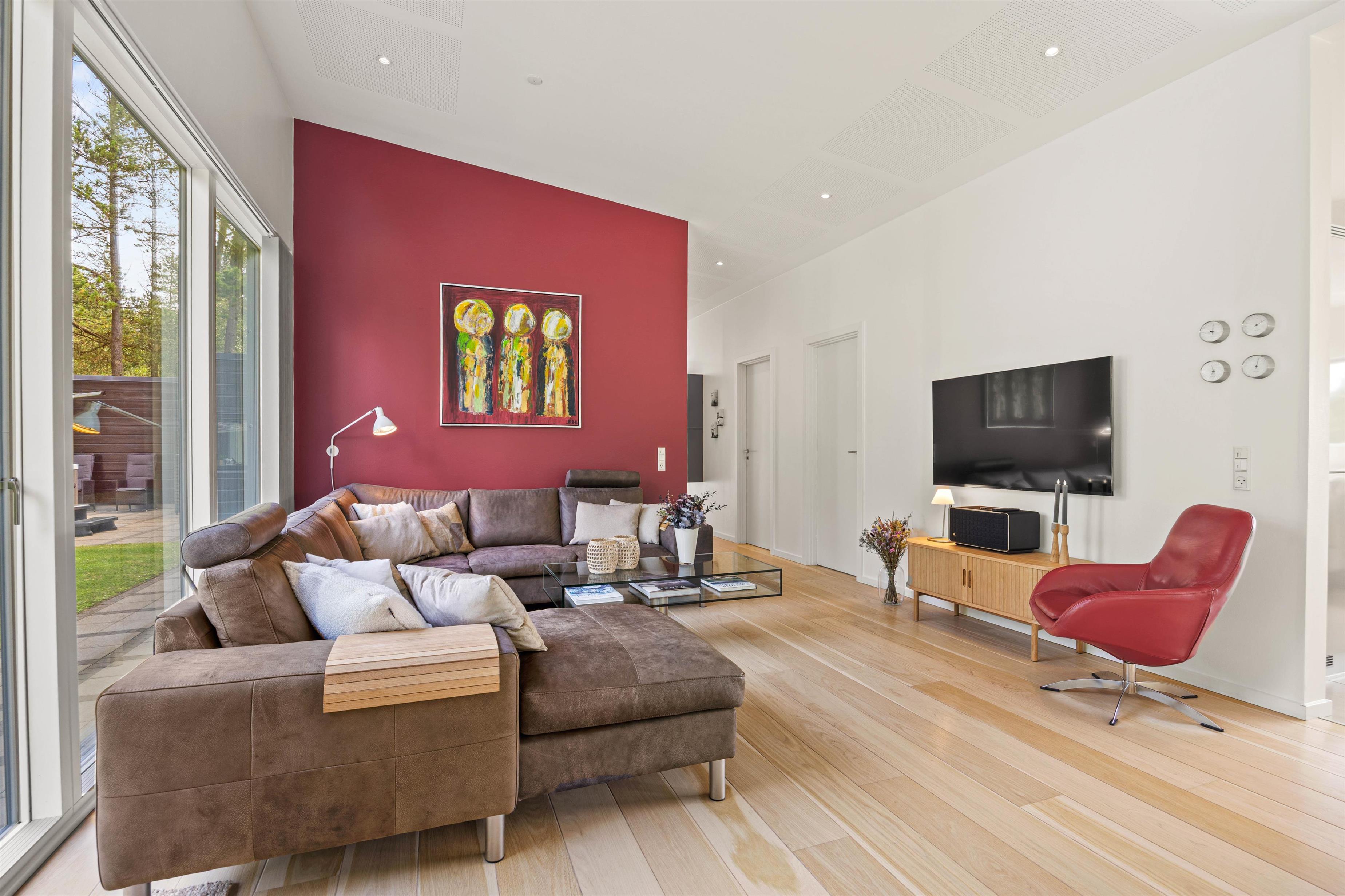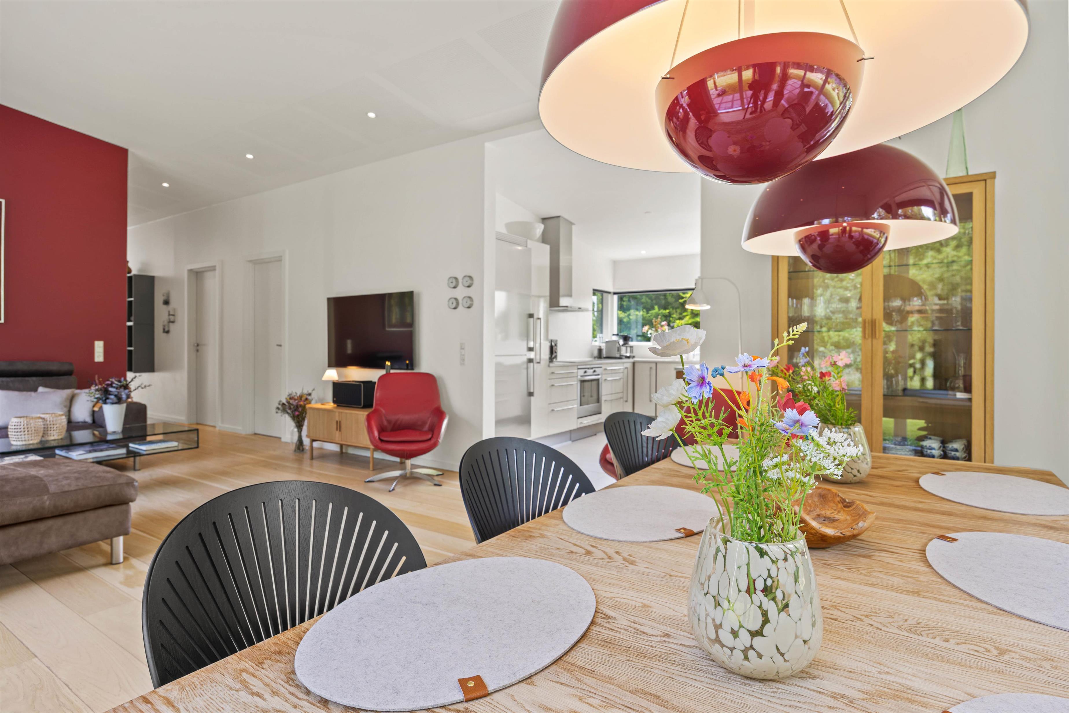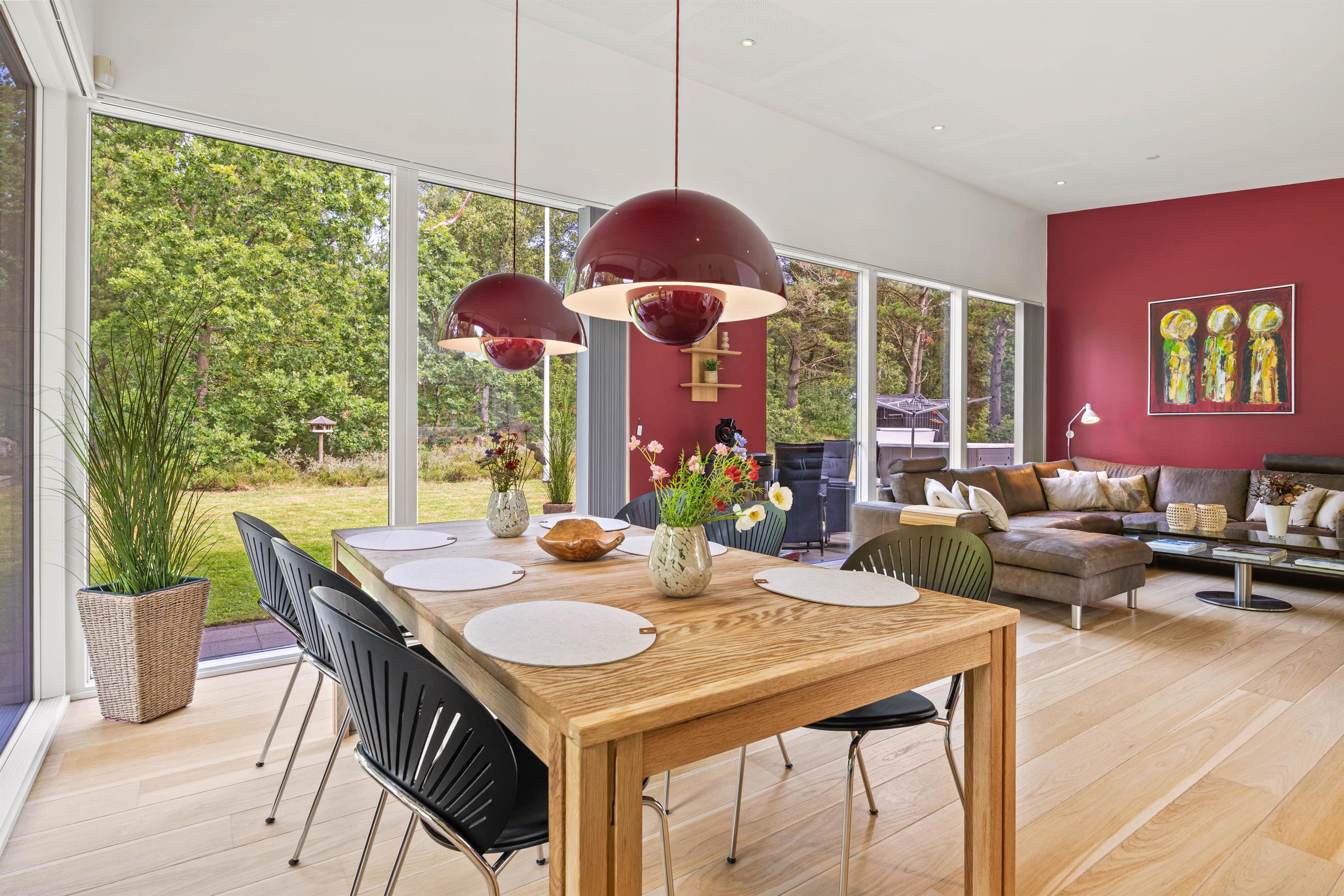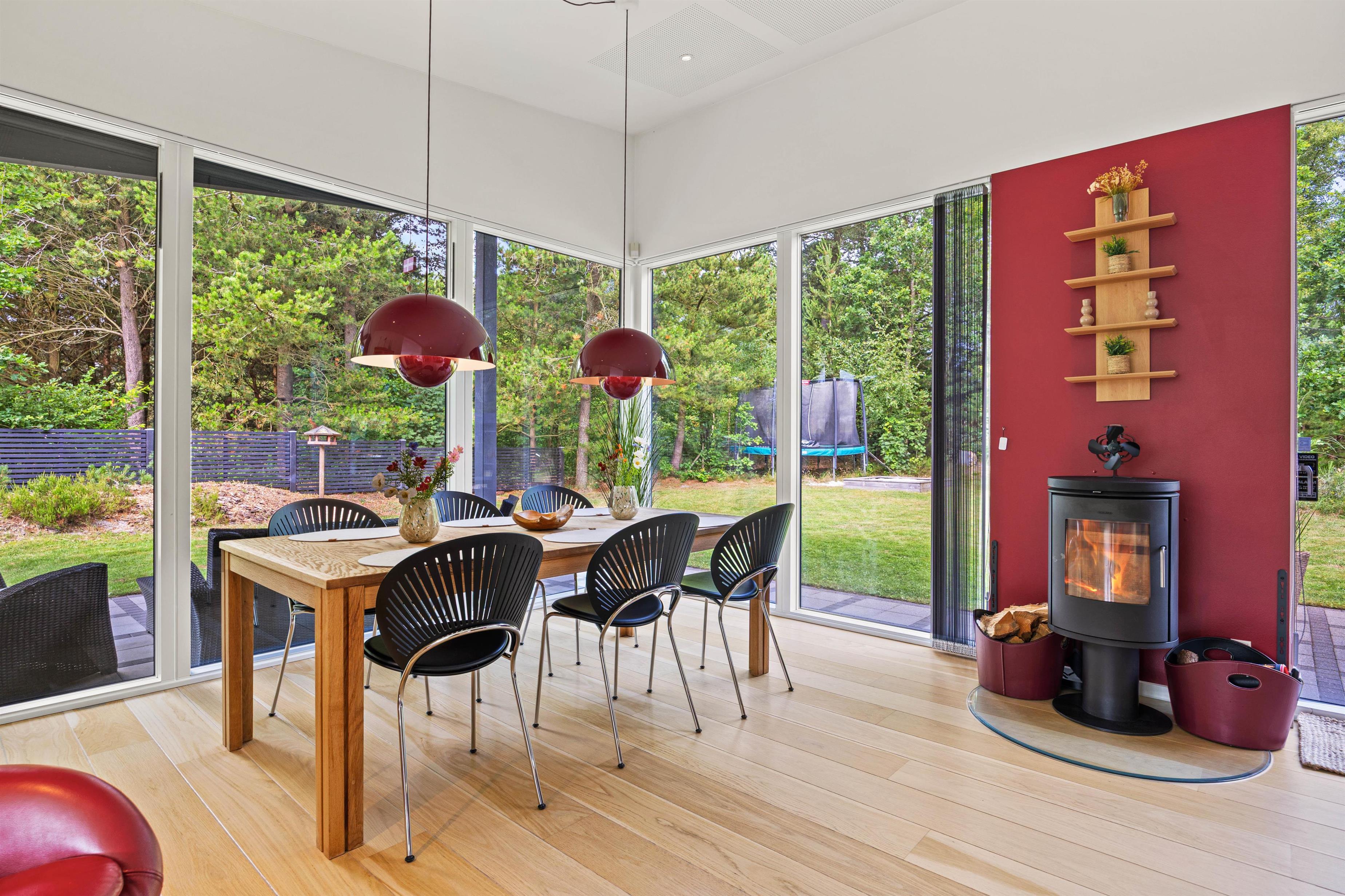 Det store, åbne køkken-alrum med gulvvarme og brændeovn danner rammen om hyggelige fællesstunder året rundt.