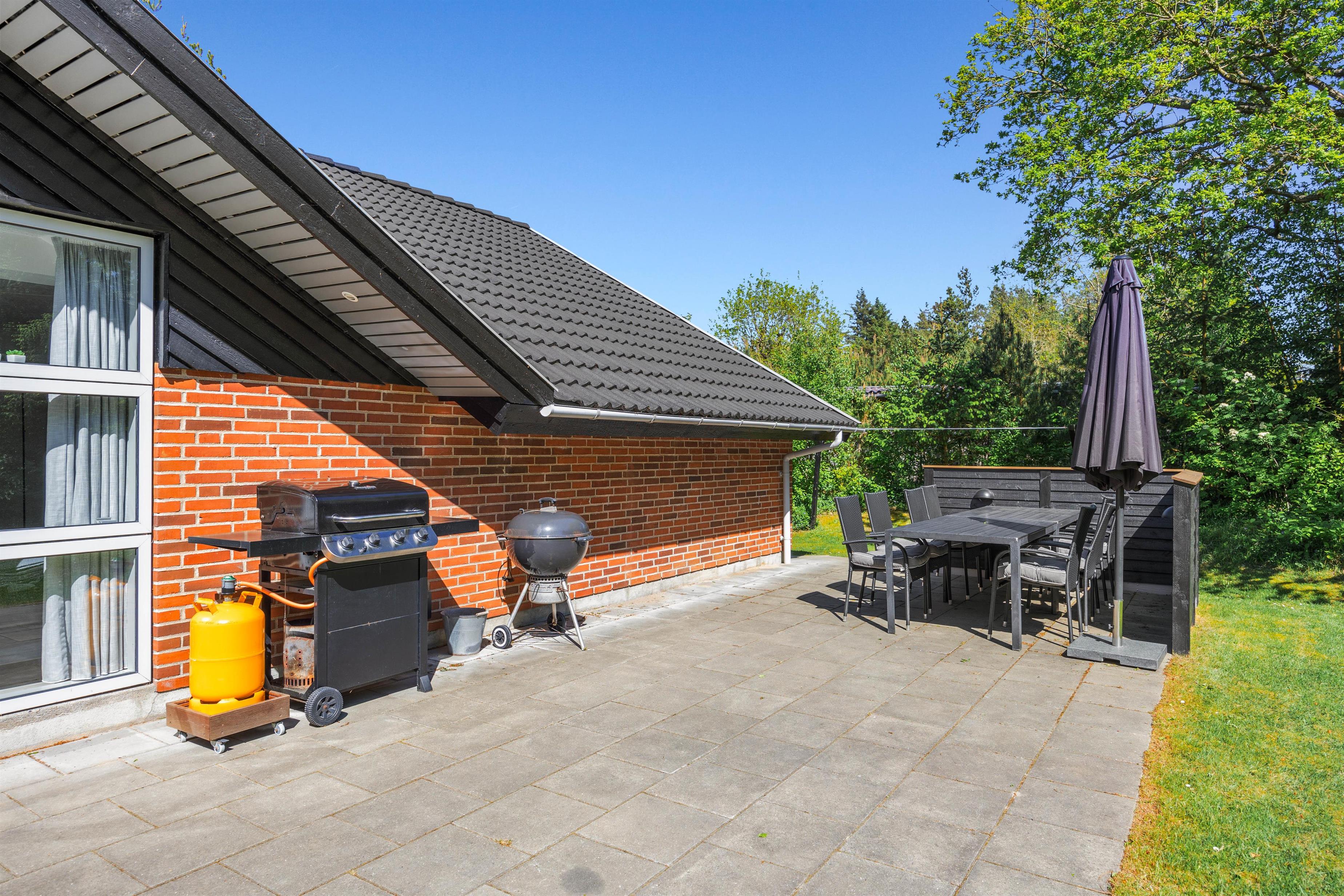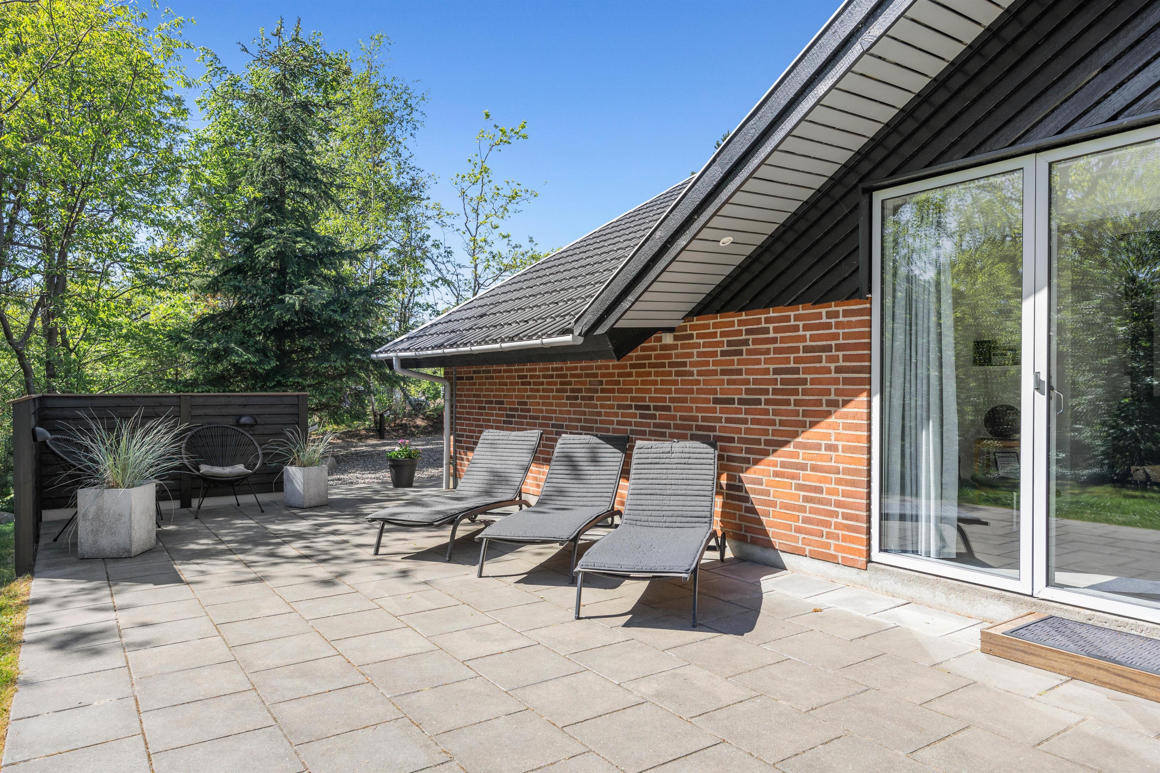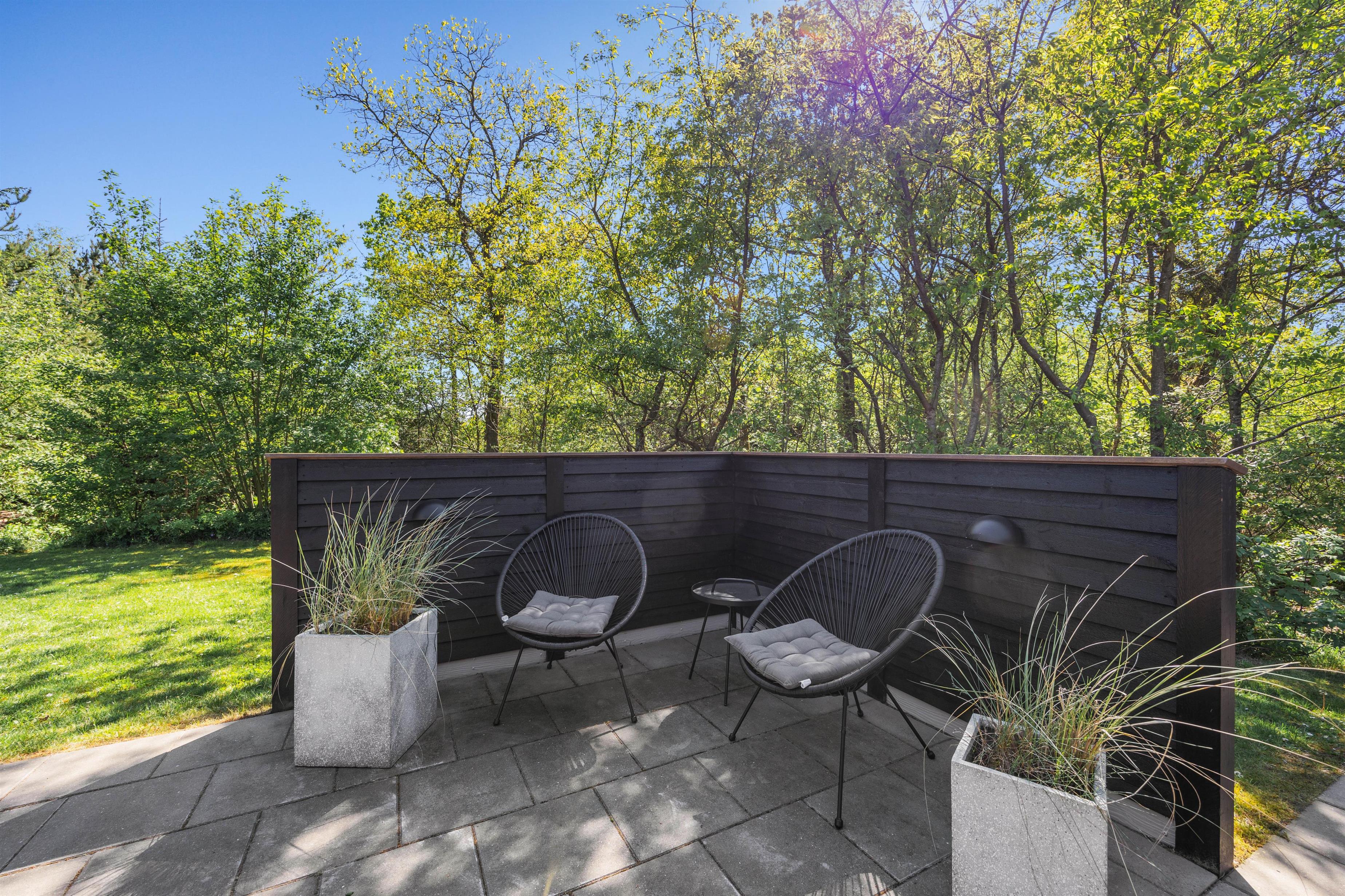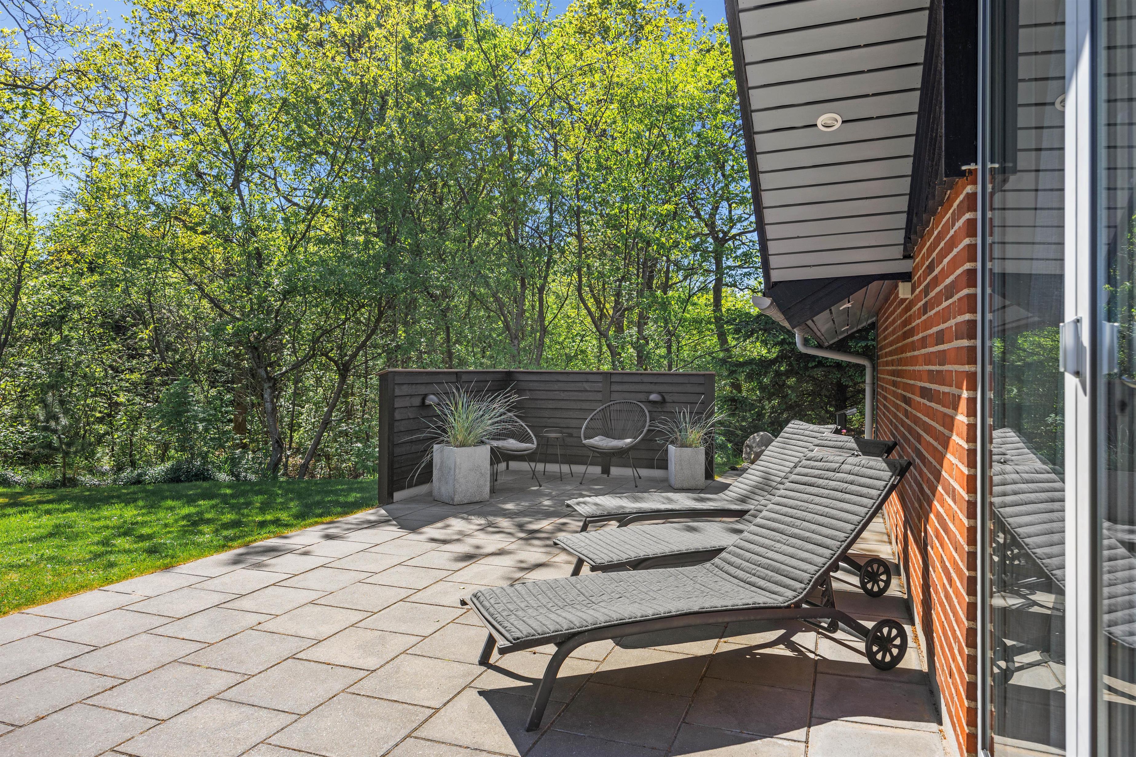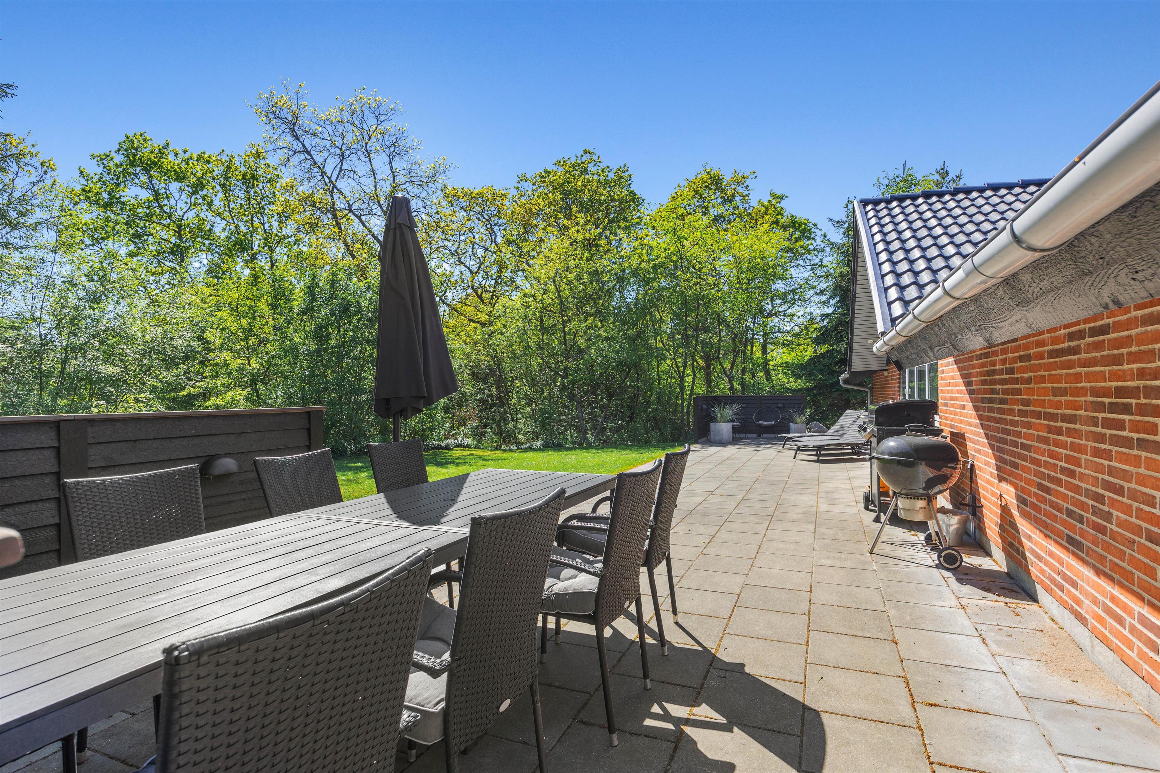 Husets store terrasse skal bare opleves. Her er der læ, rigtig god plads og masser af gode havemøbler. Så snart vejret tillader det, er det bare med at komme ud og svinge benene op i en liggestol, imens børnene og familiens hund leger på den dejlige grund, hvor der forefindes masser af legeredskaber til de små. Når dagen går på hæld, er det tid til at tænde op i grillen, trylle lidt salat i det store veludstyrede køkken og samles ved det store terrassebord til lidt lækker grillmad og måske en flaske rødvin.