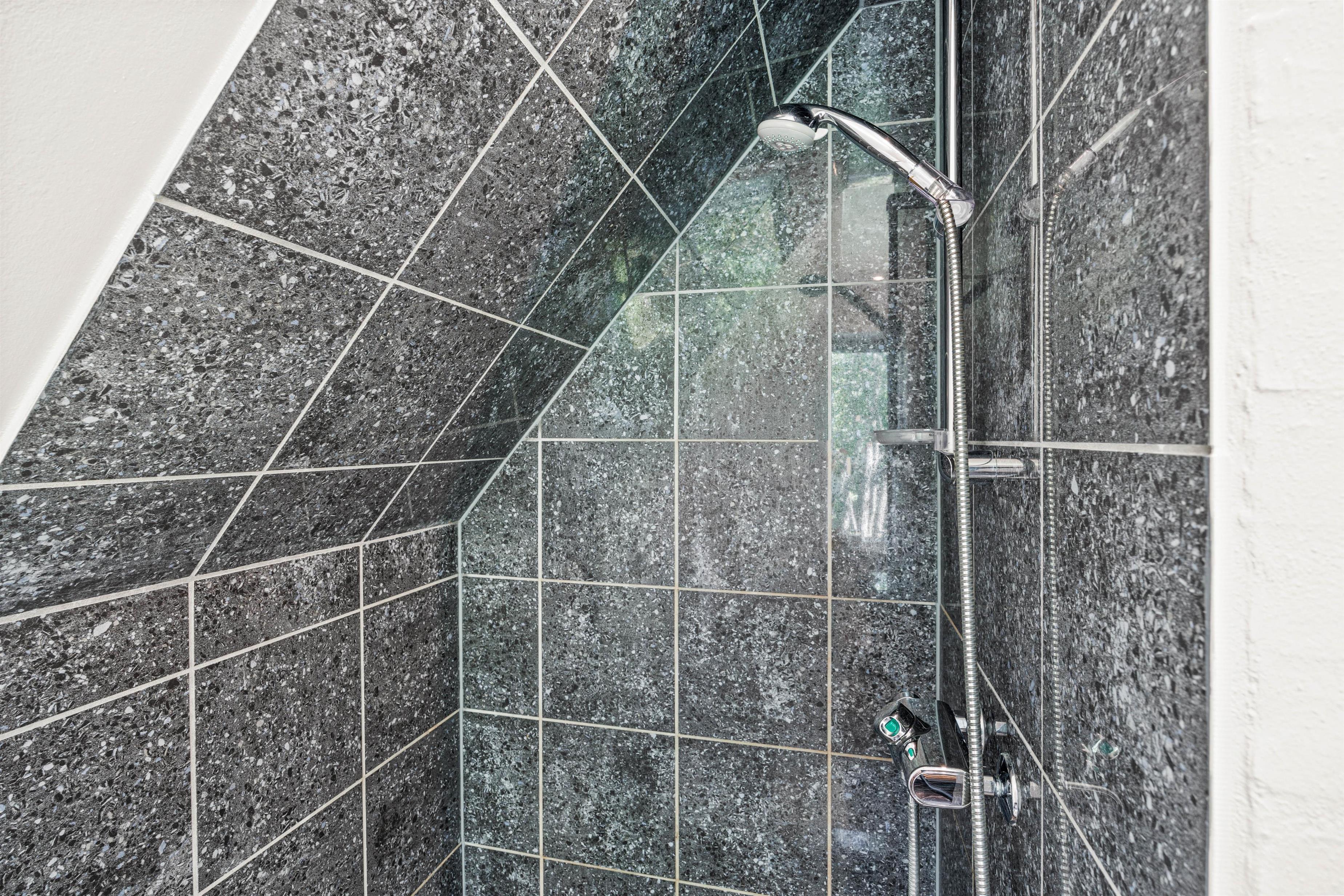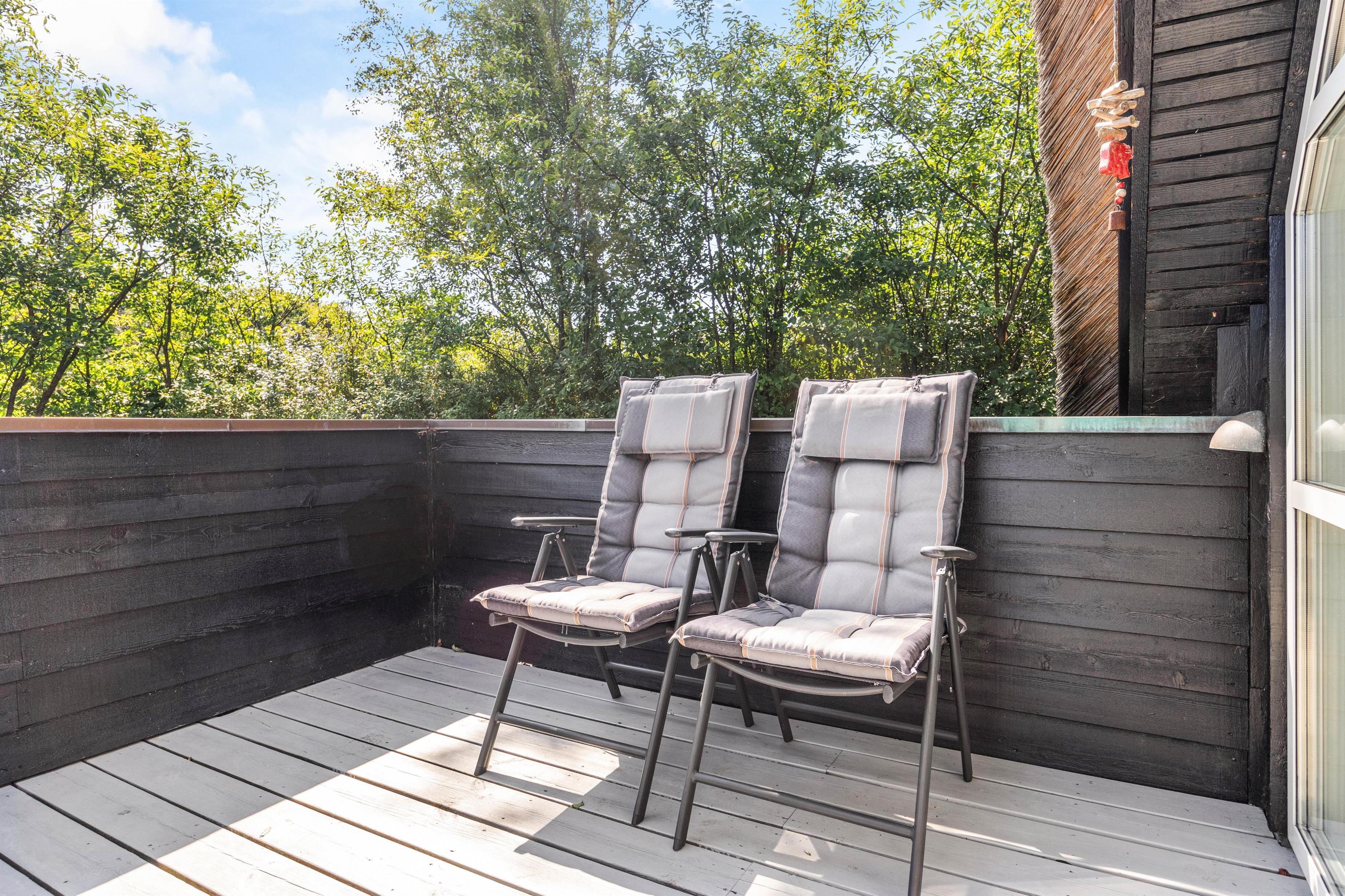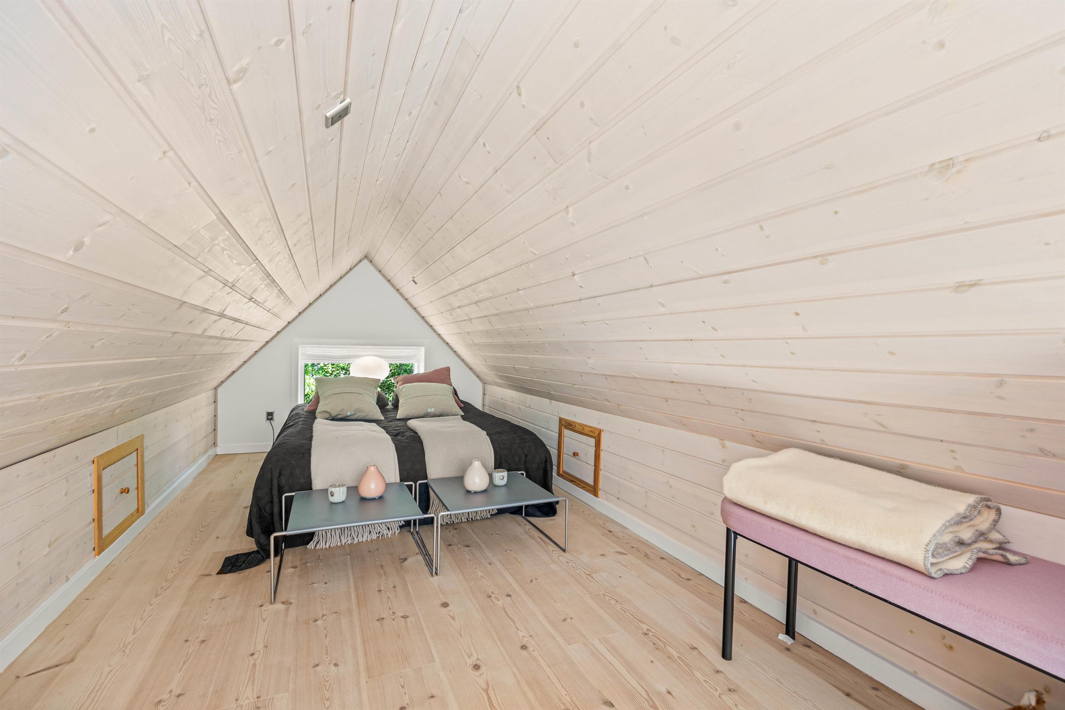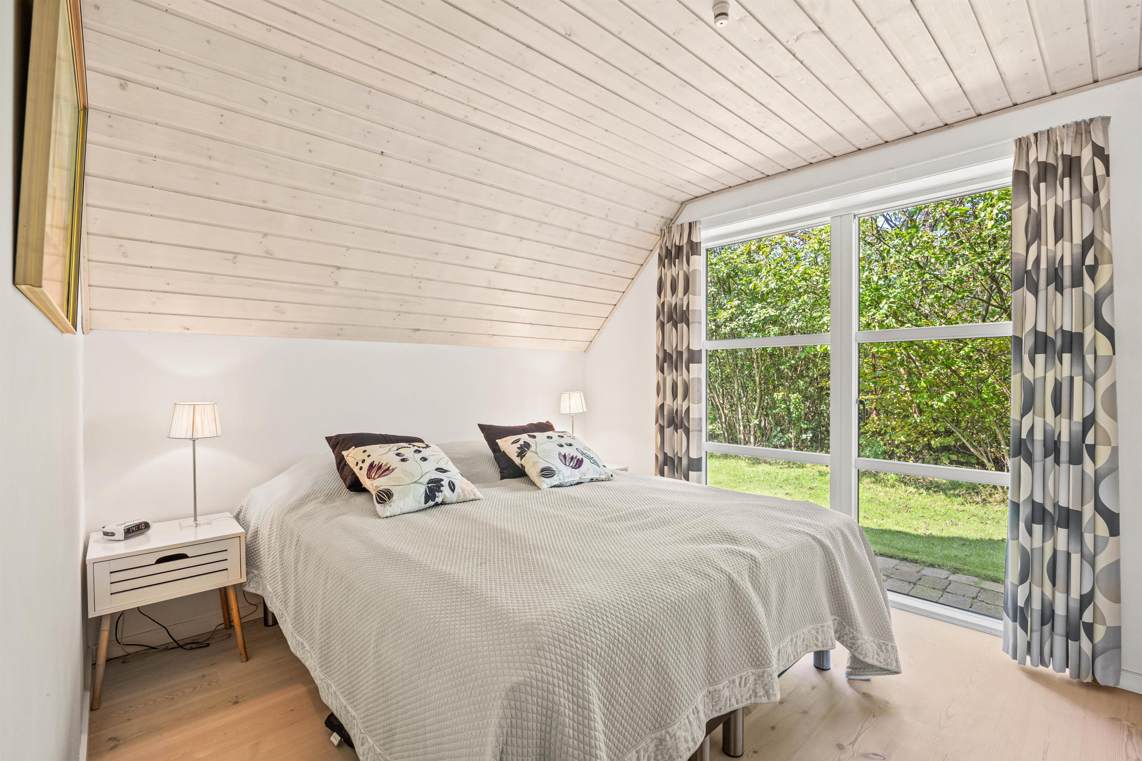 Sommerhusets 2 soveværelser, hver med en dobbeltseng, sikrer en god nats søvn. Igennem terrassedøren i det ene soveværelse kan I nyde udsigten til den unikke omkringliggende natur. En stejl trappe fører jer op til soveværelset på 1. etage, hvor sommerhuset anden dobbeltseng befinder sig.