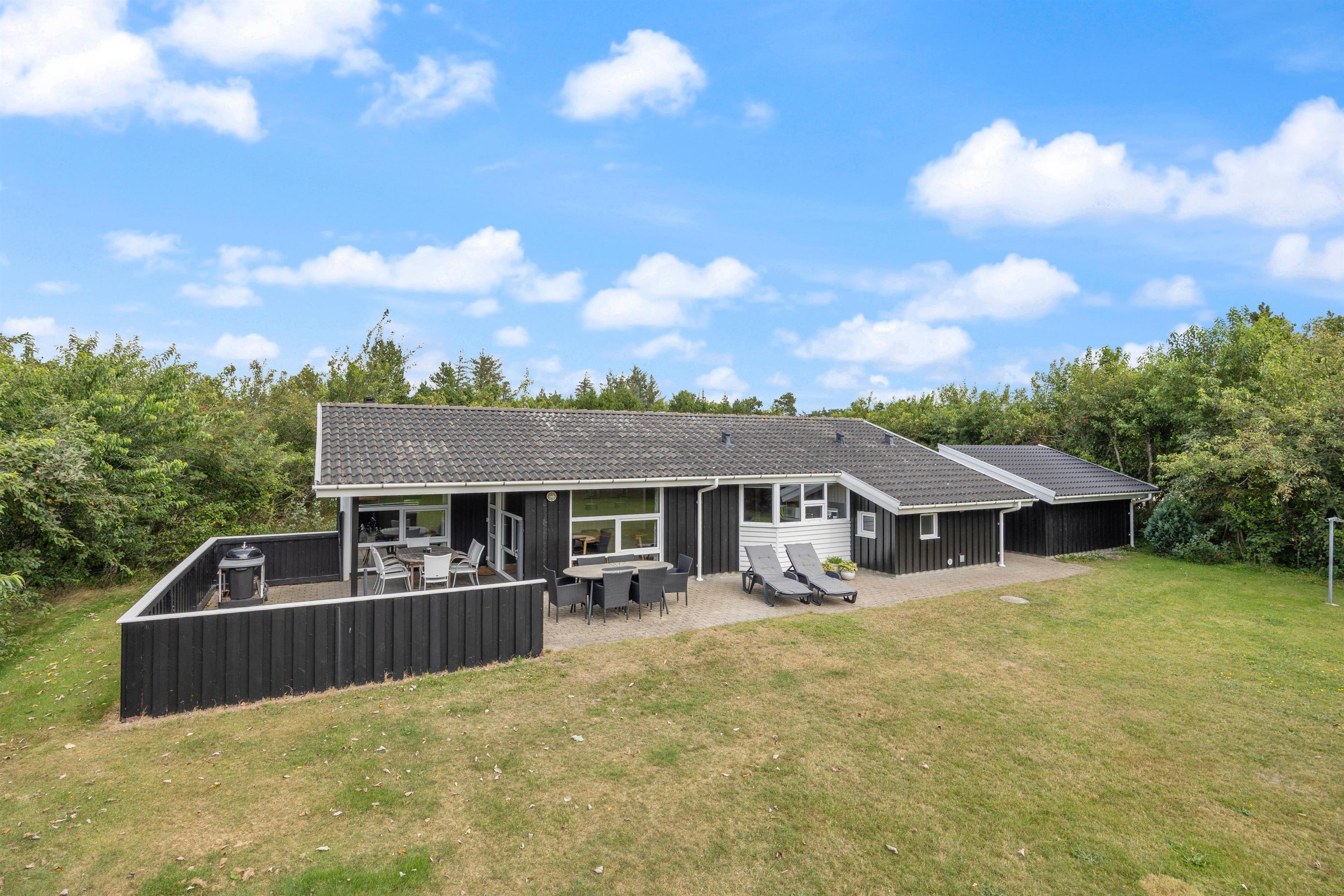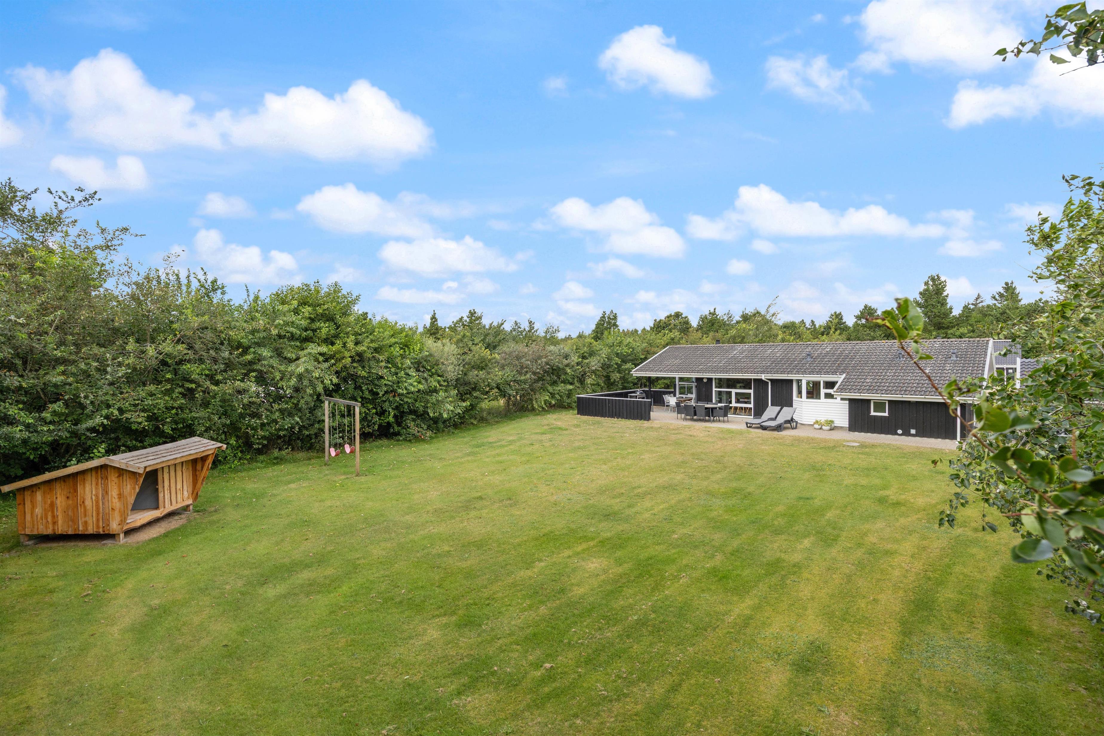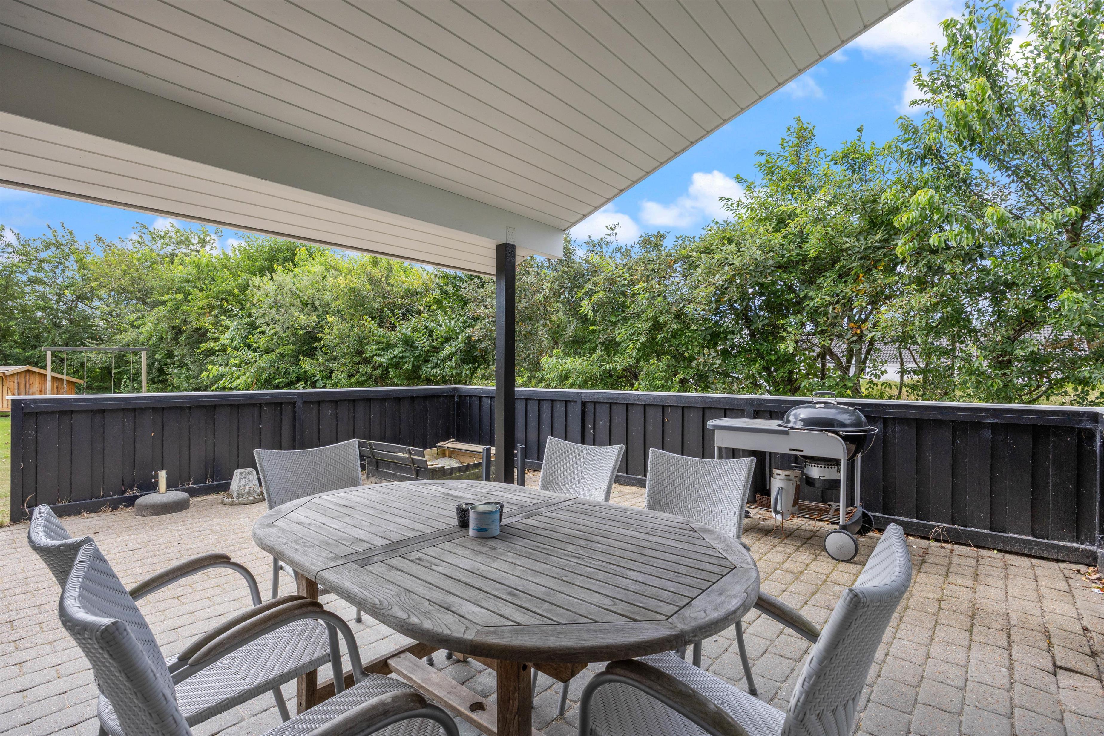 Den 1.500 m2 store plænegrund er omgivet af opvoksede træer og buske, så her kan I spille bold- eller vikingespil og have mange sjove timer sammen. Hvis I da ikke vælger at slappe af i de komfortable havemøbler og liggestole, imens børnene leger i gyngerne i stedet. Terrassen er delvist overdækket, så I kan altid finde en rolig plet til afslapning eller læsning af en god bog. Tænd op i grillen og slut dagen af med et lækkert grillmåltid, imens skyggerne bliver lange.