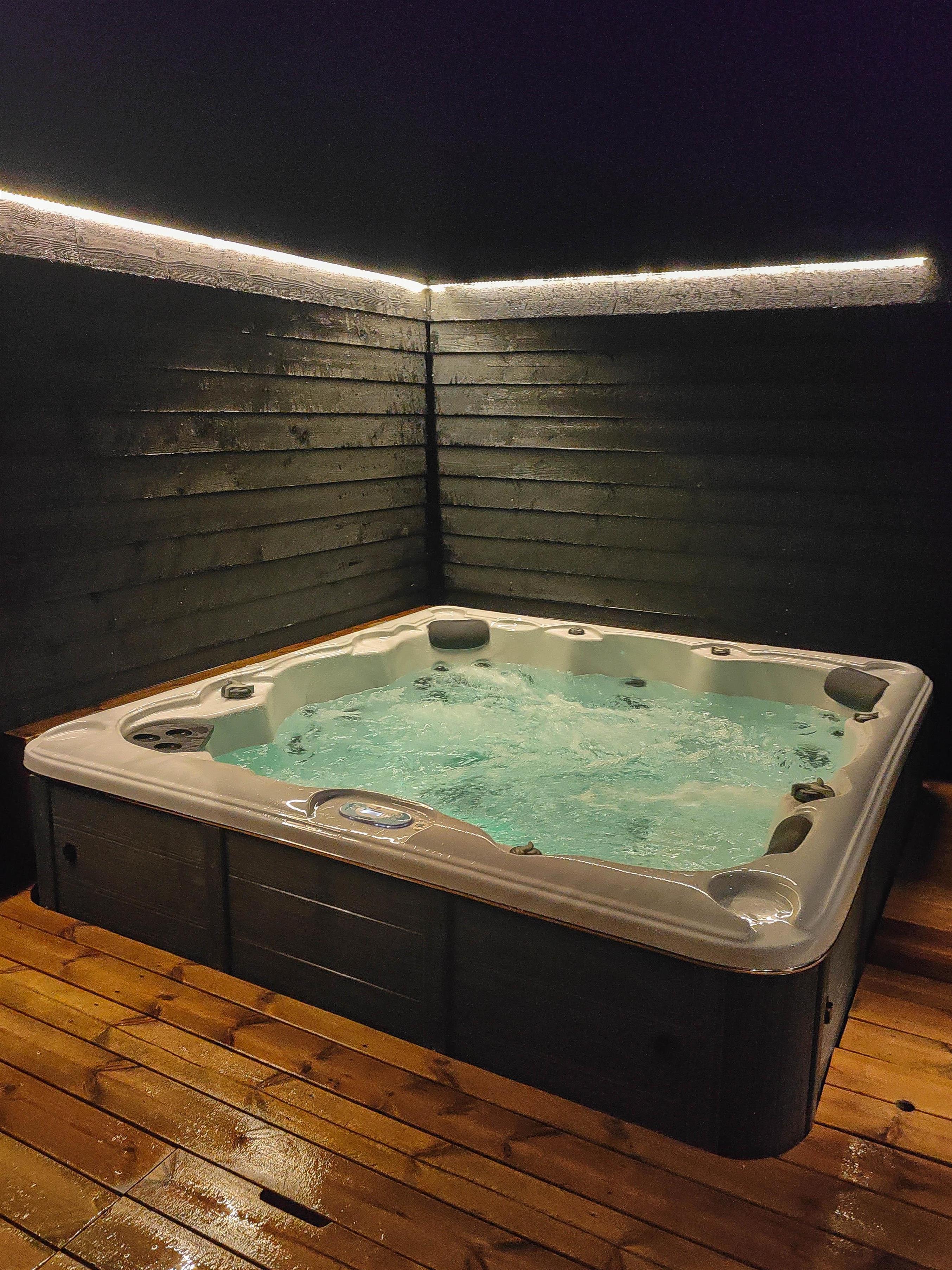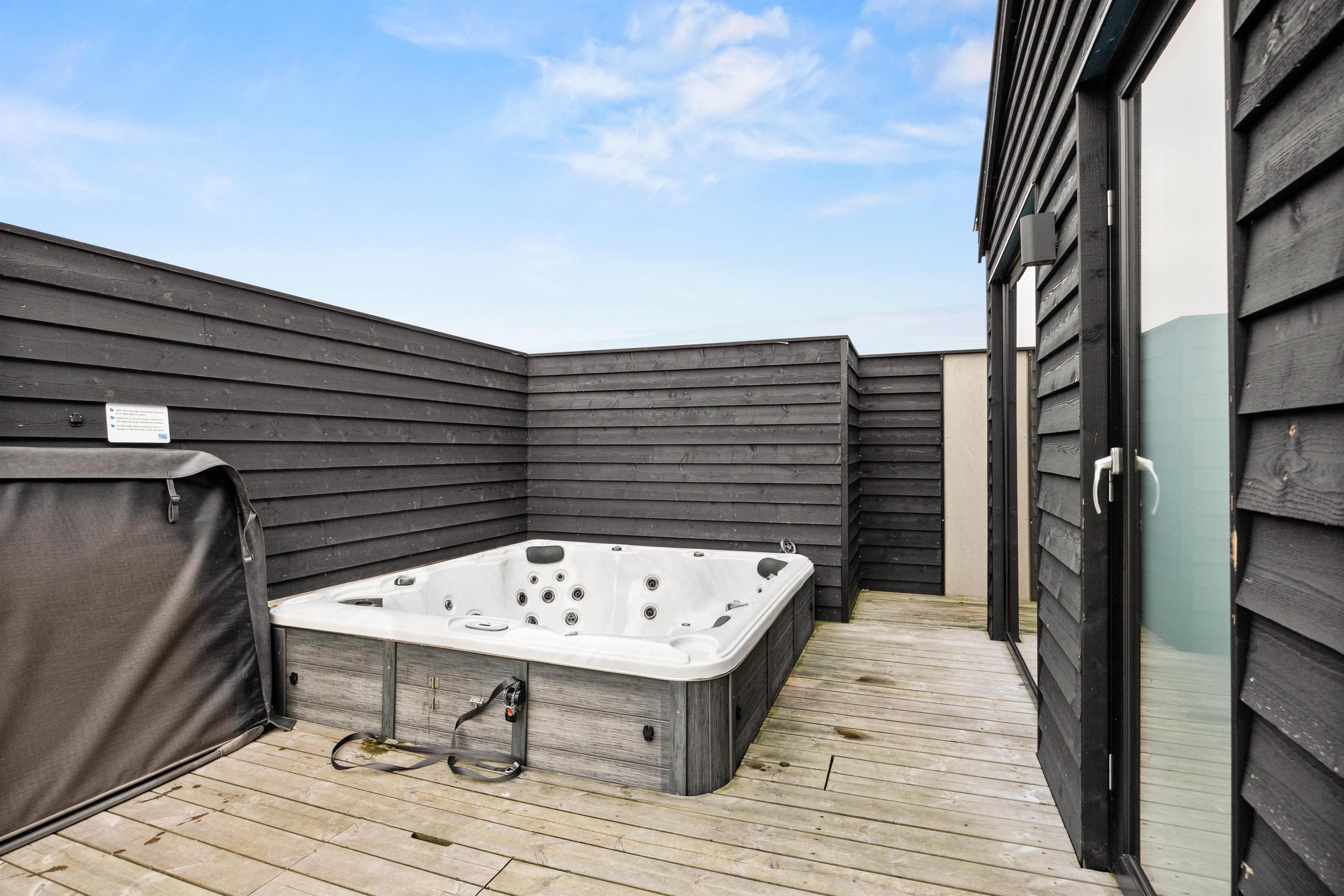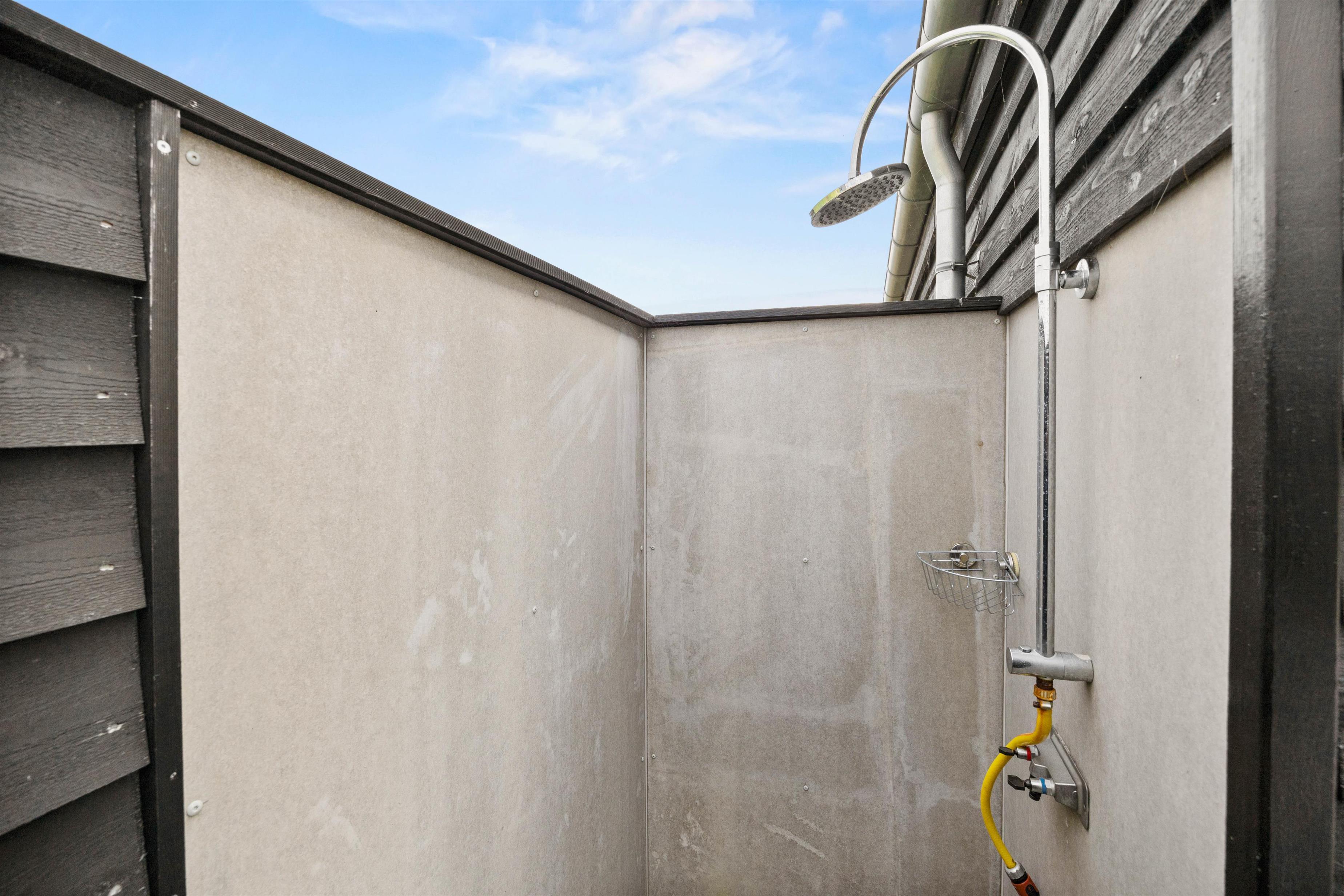 Feriehusets udeområde byder masser af afslapning. Her venter jer en 5-personers udespa, som kan forkæle jer med ekstra afslapning i løbet af ferien. Efter turen i spaen kan I skylle jer under udebruseren*, der findes lige ved siden af på den afskærmede terrasse.