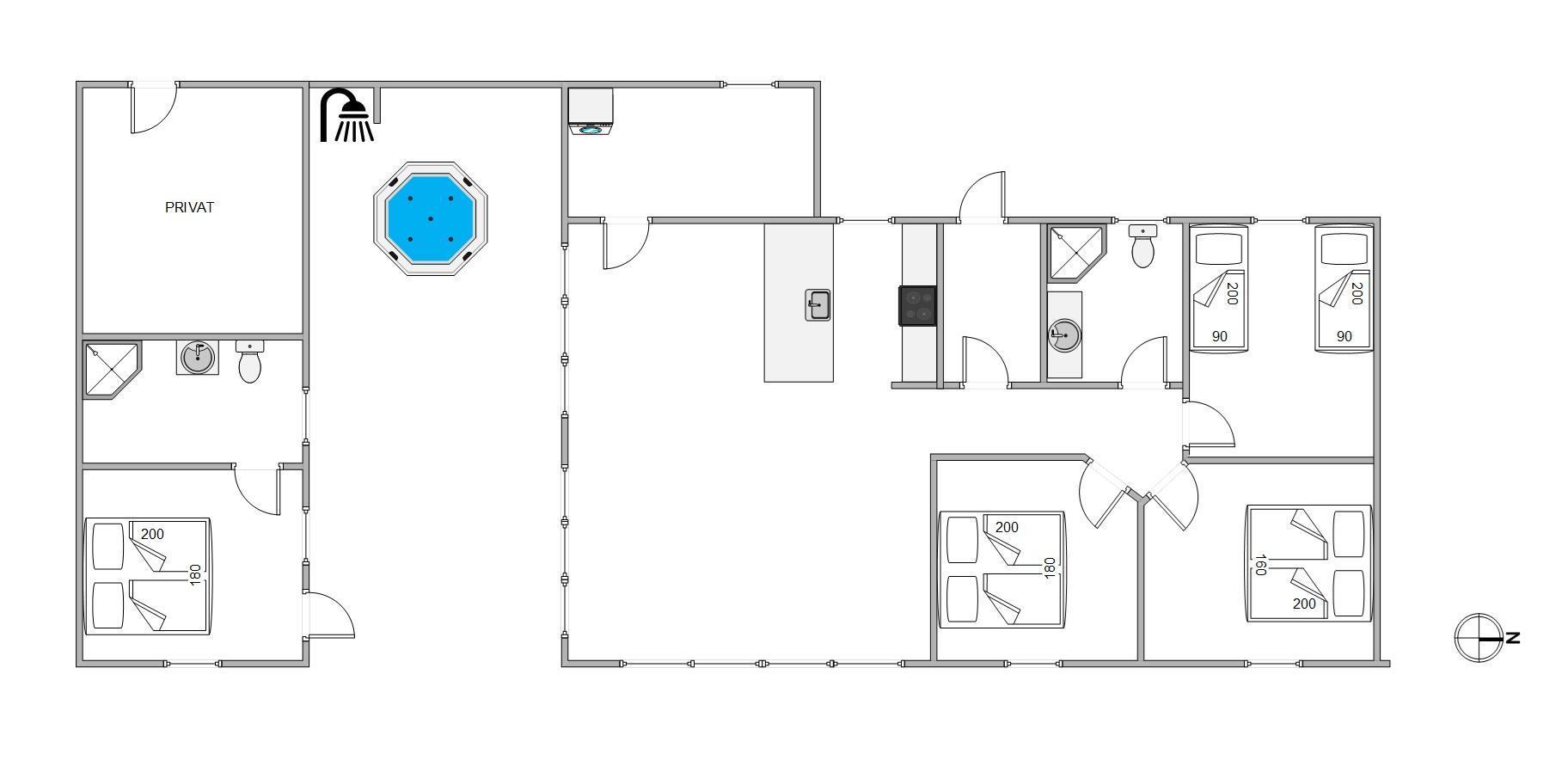 Med 4 soveværelser er der god plads til både ro og god nattesøvn. De 3 dobbeltsenge og 2 enkeltsenge er fordelt på hyggelige og smagfuldt indrettede soveværelser, hvor I kan trække jer tilbage efter en skøn feriedag. Sommerhuset har desuden 2 flotte badeværelser med gulvvarme – en luksus der går igen i hele huset, der især gør godt på de køligere dage. I hele sommerhuset findes gulvvarme samt en vand-til-luft-varmepumpe.