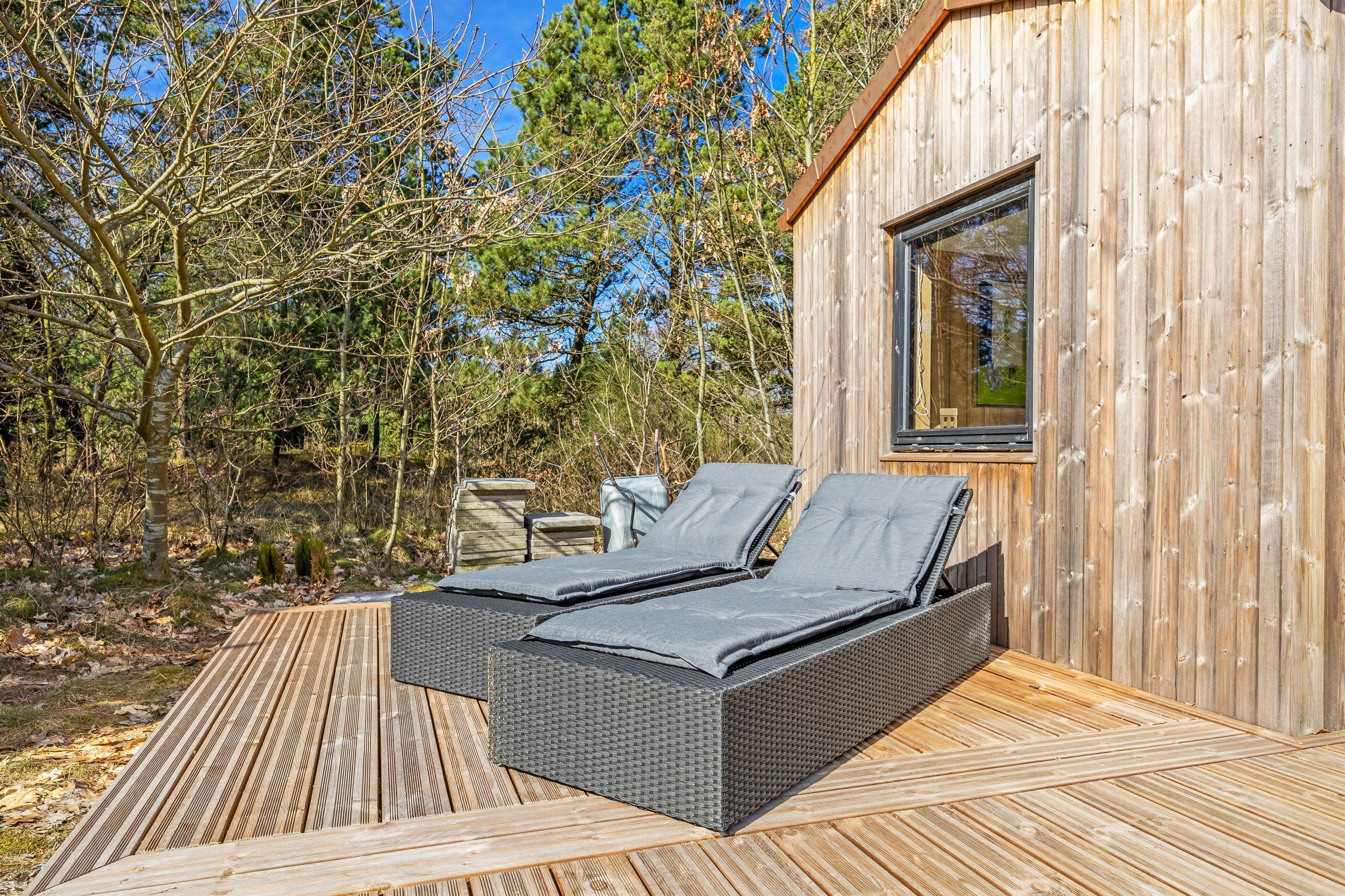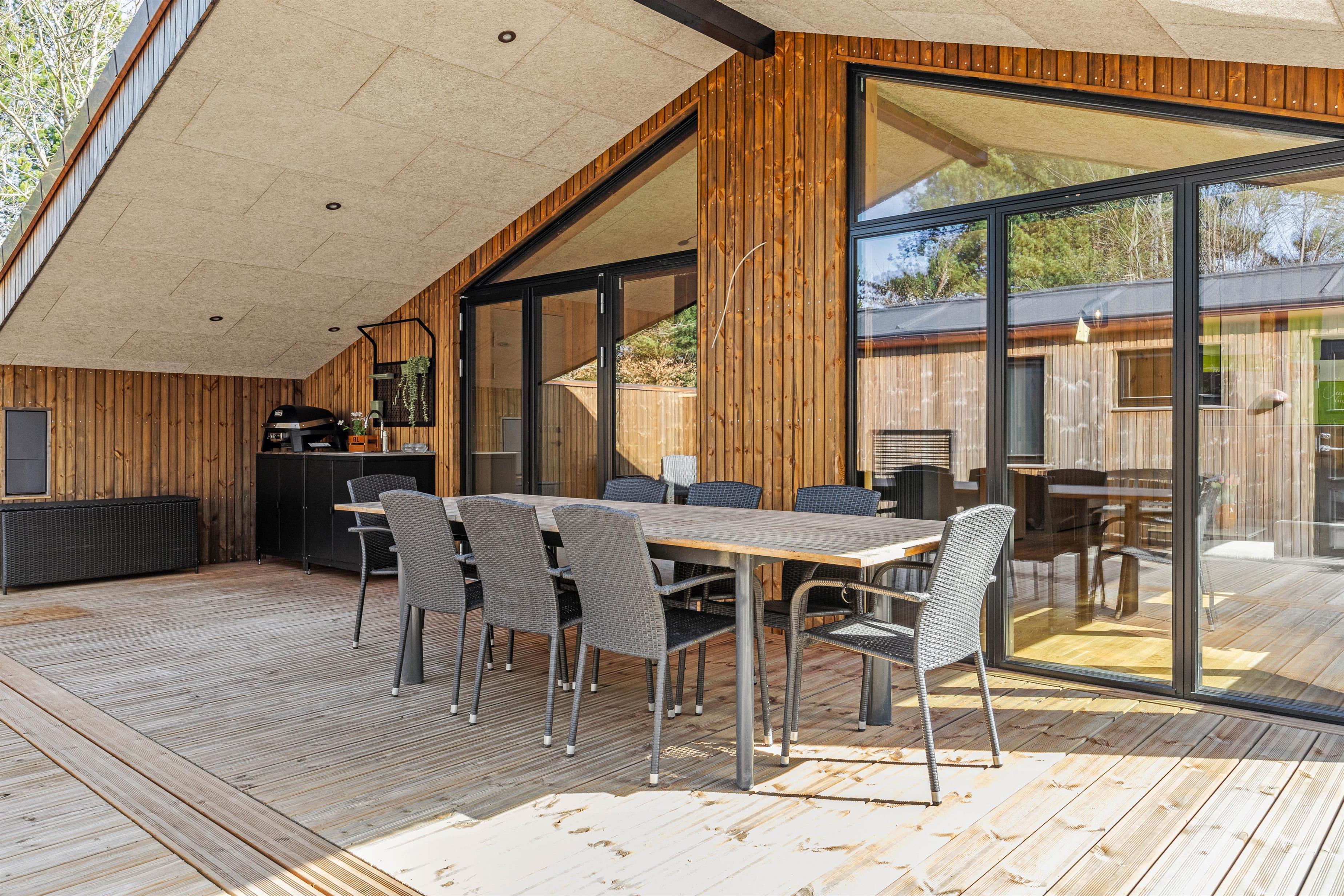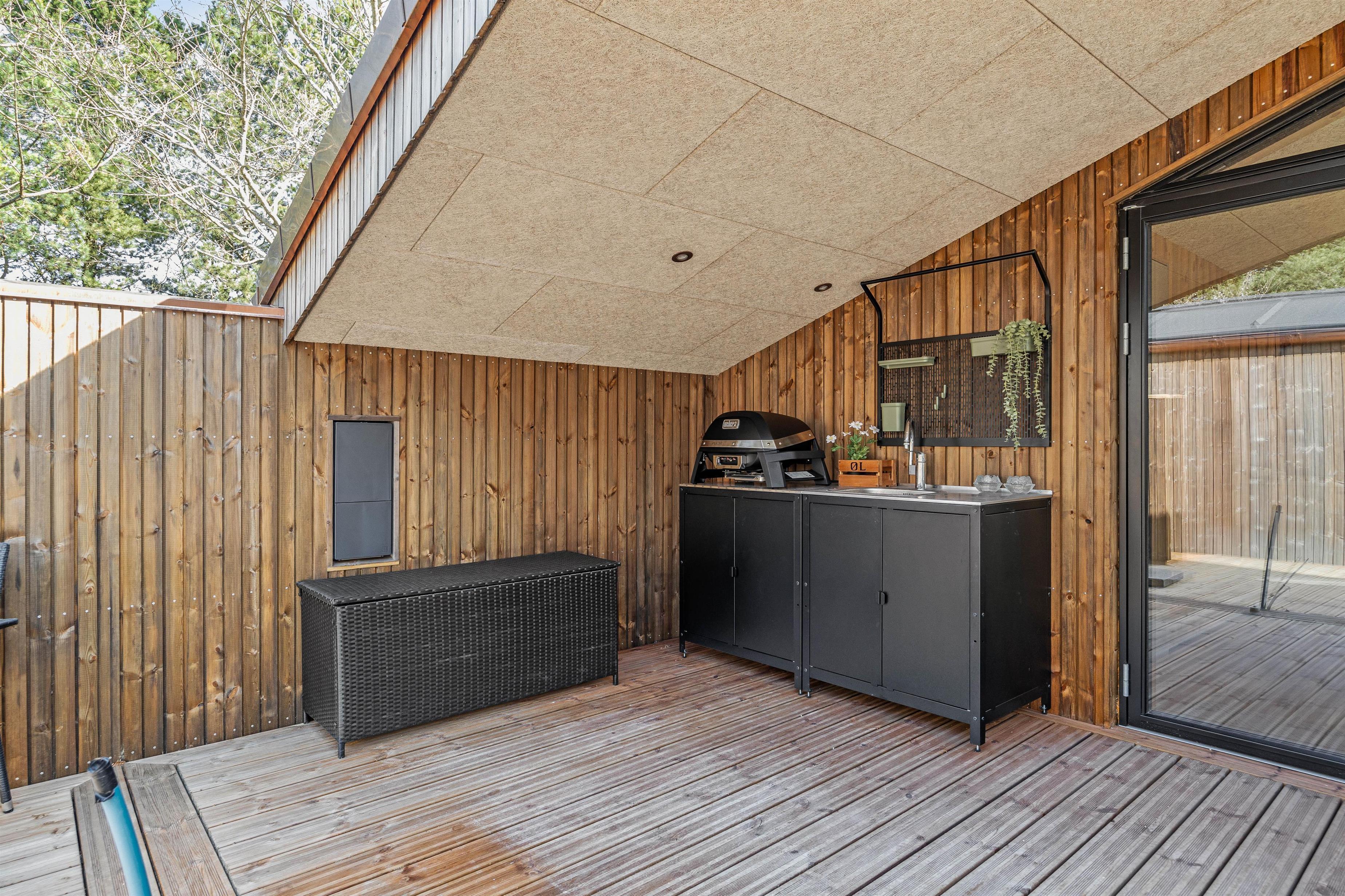 Udendørs venter en skøn terrasse, både overdækket og afskærmet, hvor I kan nyde morgenkaffen, en god bog eller et glas vin i aftensolen. Prikken over i’et er udespaen, hvor I kan slappe af under åben himmel – eller den udendørs bruser, der giver friskhed på varme sommerdage. Udebruseren er tilgængelig fra april til november.