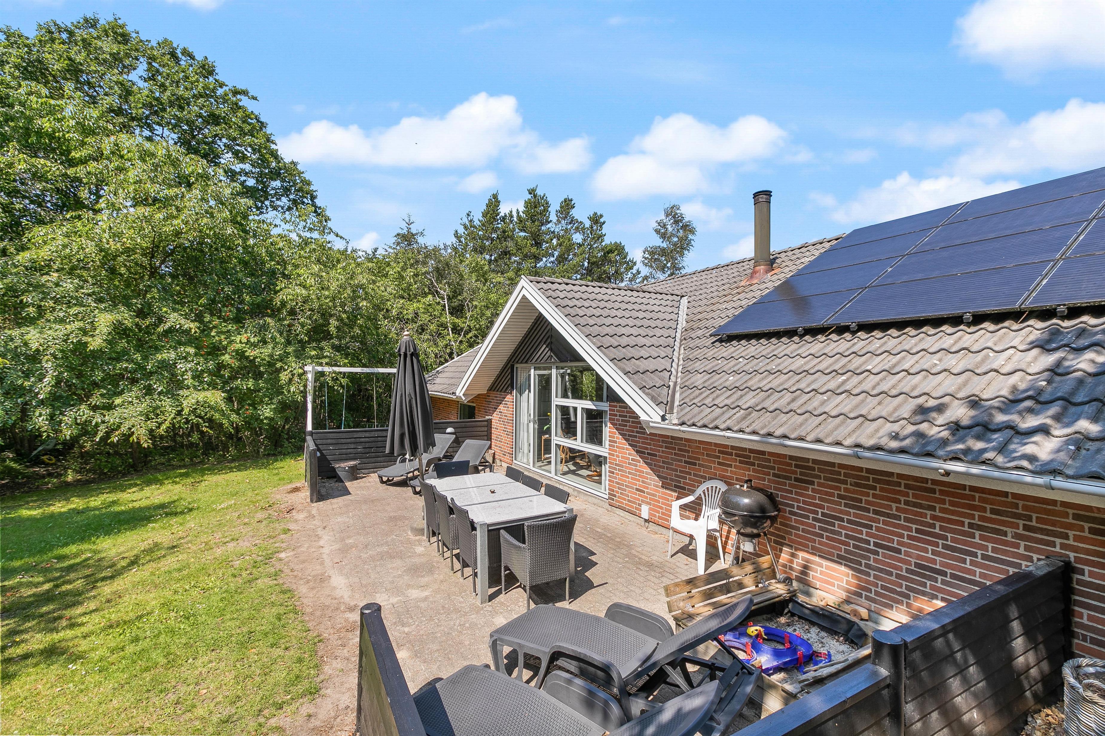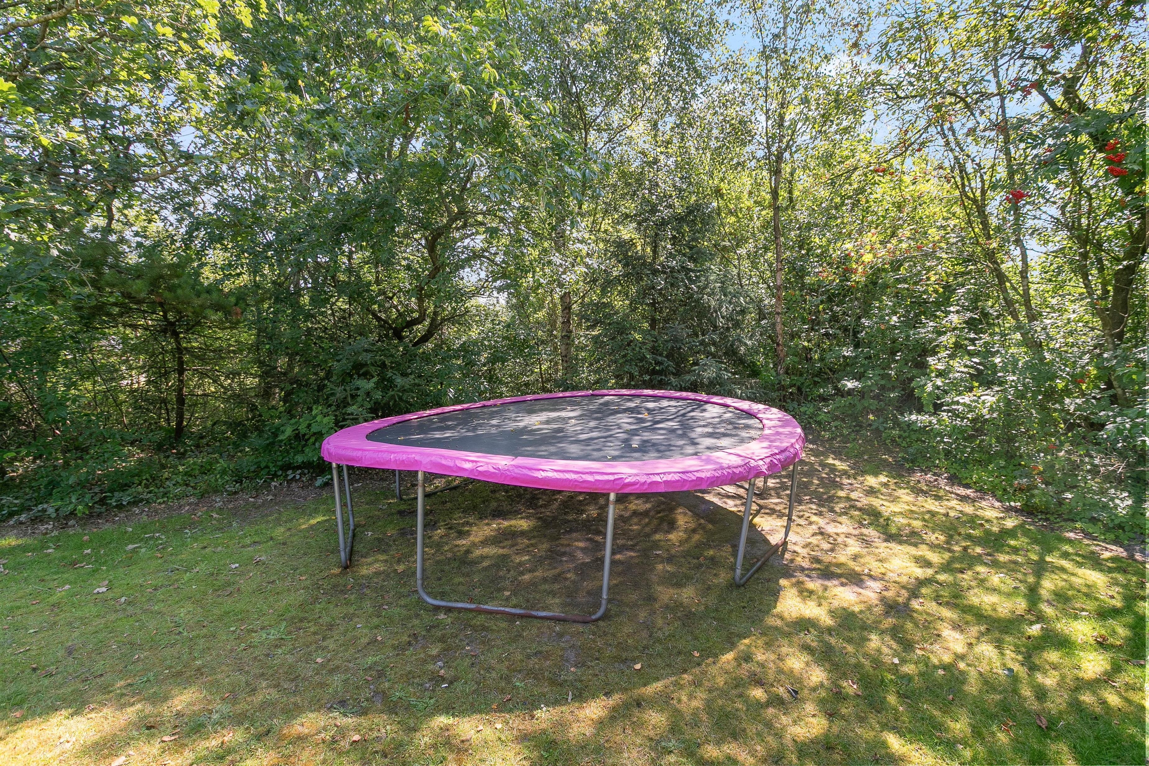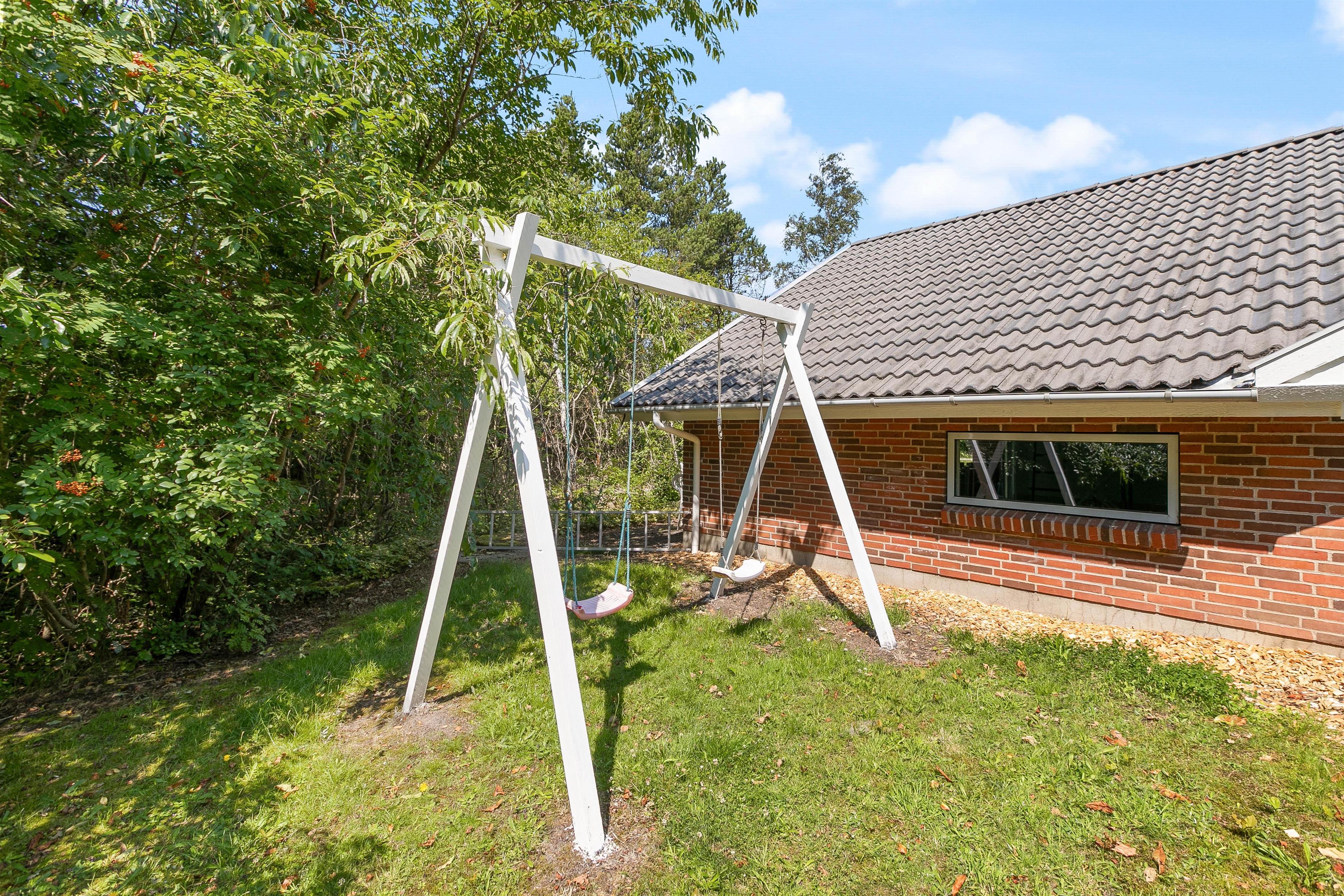 Udendørsfaciliteterne er også perfekte til børnene. Der er både gynge, sandkasse og trampolin på den store plænegrund, så de små aldrig keder sig. På terrassen rundt om sommerhuset står komfortable havemøbler og grill klar, ideelle til hyggelige grillaftener.